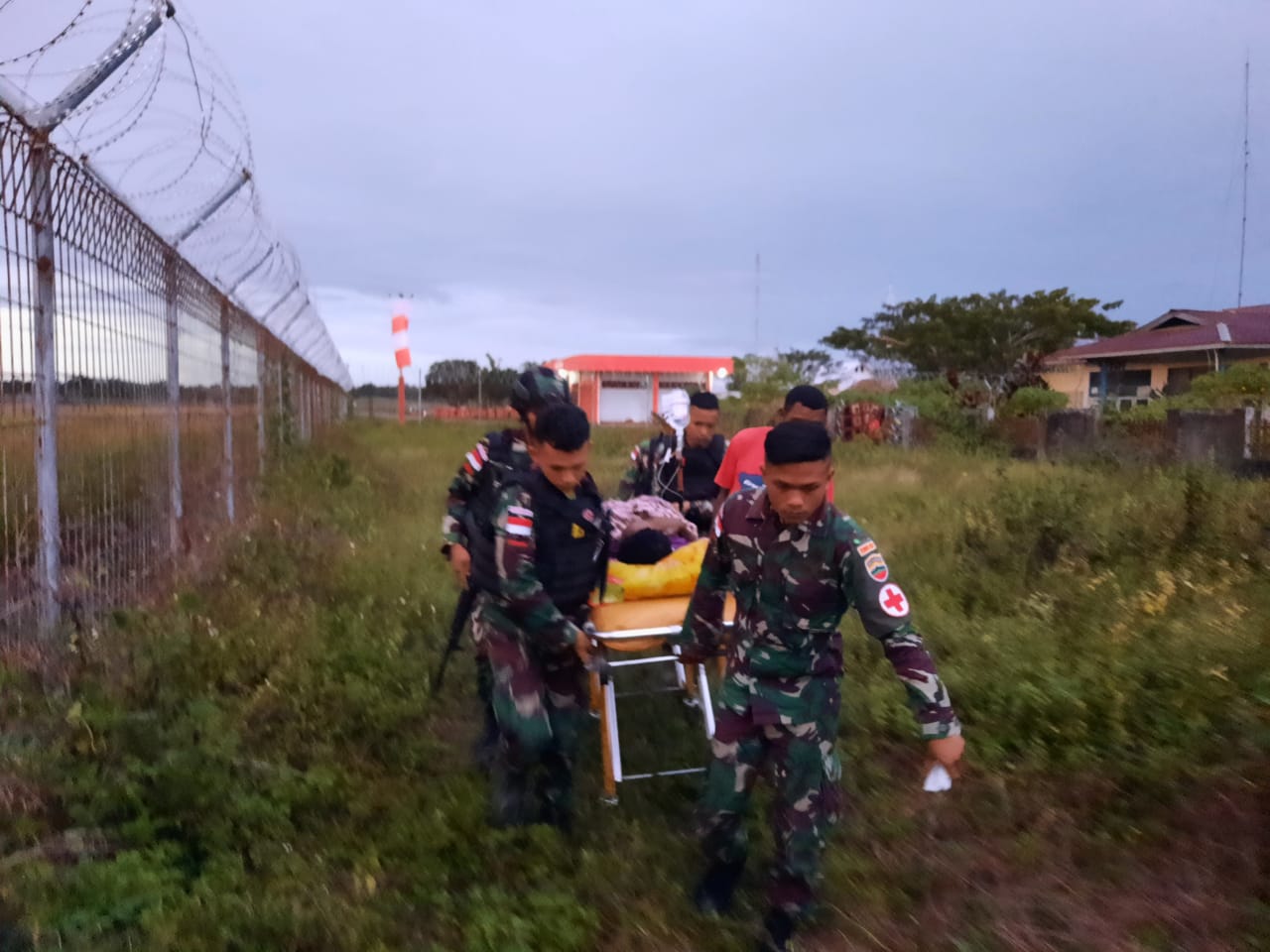 Satgas Pamtas RI-PNG Yonif 126/Kala Cakti membantu proses evakuasi salah satu warga Kampung Senggi yang terserang penyakit stroke ringan ke Puskesmas Distrik Senggi, Kabupaten Keerom.