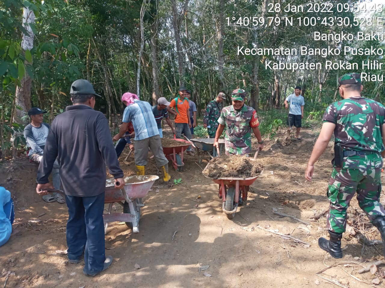 Seperti yang dilakukan anggota Koramil 0321-05/RM yang di pimpin Sertu Paimen bersama masyarakat melaksanakan gotong royong penimbunan halaman masjid, Jumat (28/1/2022).