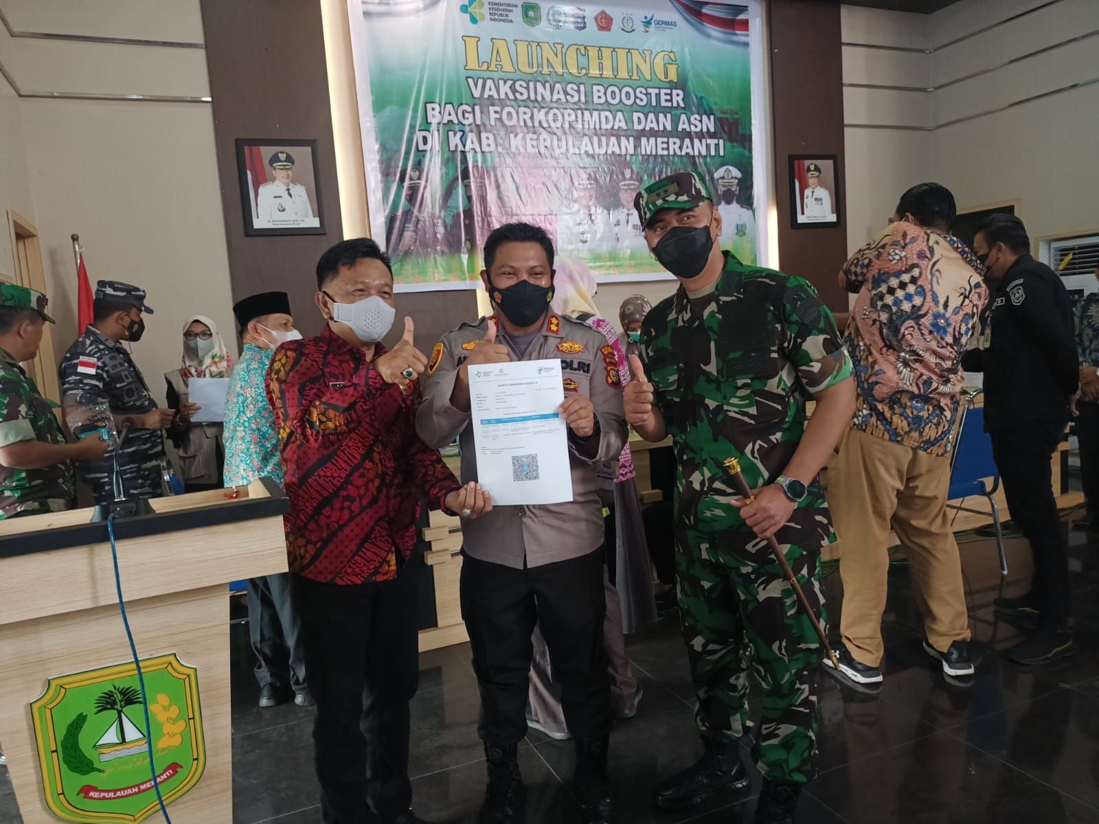 Dandim 0303/Bengkalis Letkol Inf Endik Yunia H menghadiri pelaksanaan Launching Vaksinasi Covid-19 lanjutan (Booster) di Gedung Biru Kantor Bupati Jln. Dorak Kel. Selatpanjang Timur Kec. Tebingtinggi Timur Kab. Kepulauan Meranti. Jum’at, (28/1/2022).