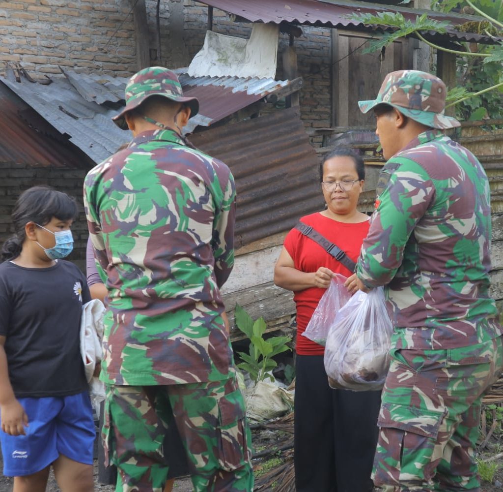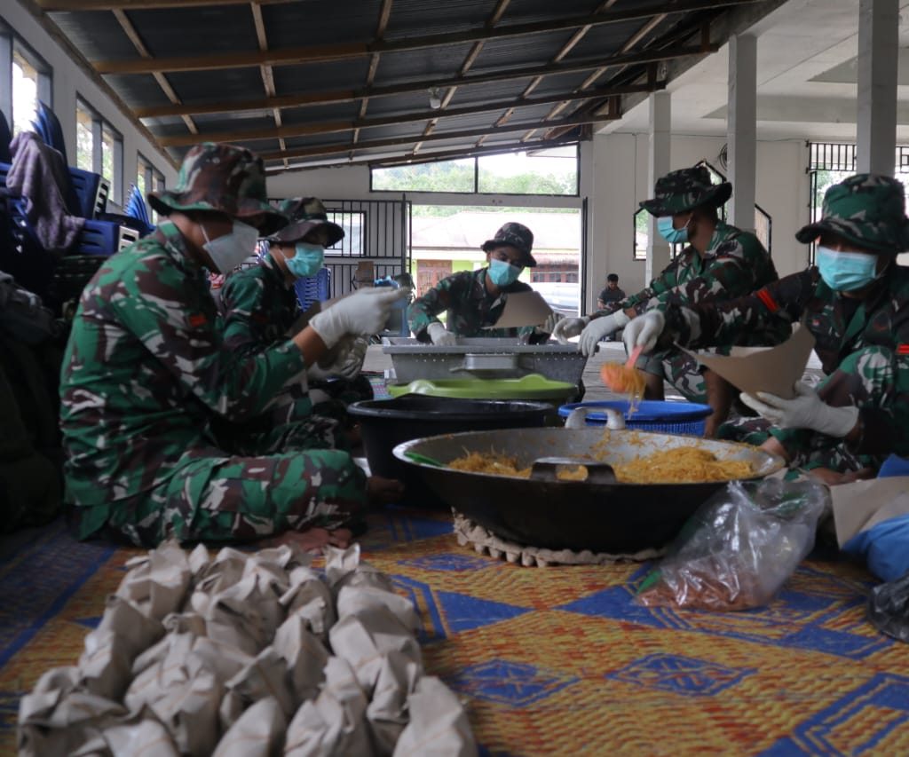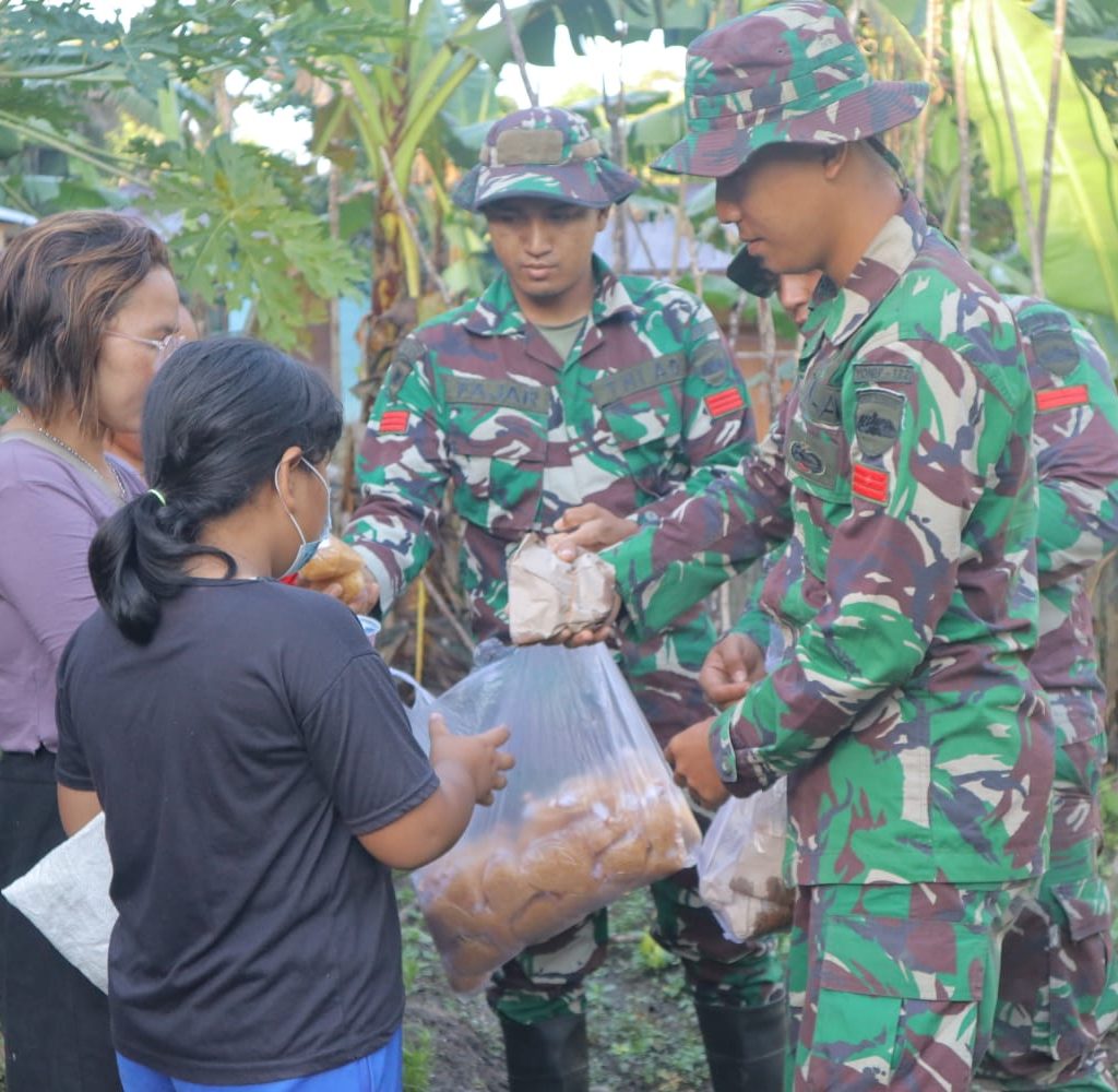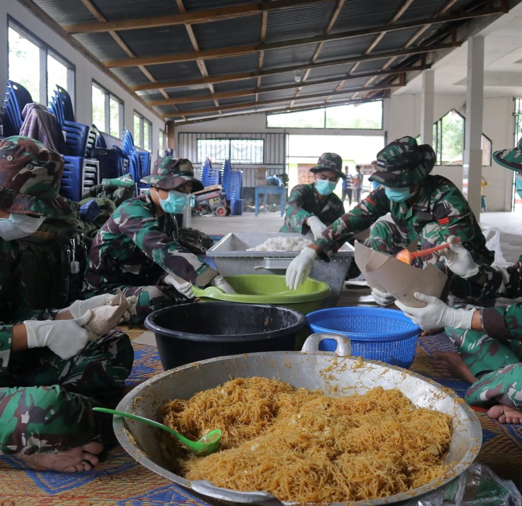 Personel Yonif 122/TS tetap siaga menyalurkan makanan siap saji kepada warga setempat, Makanan dimasak langsung di dapur lapangan yang beroperasi penuh, lalu diantar ke rumah-rumah warga yang sulit dijangkau agar bantuan tepat sasaran.