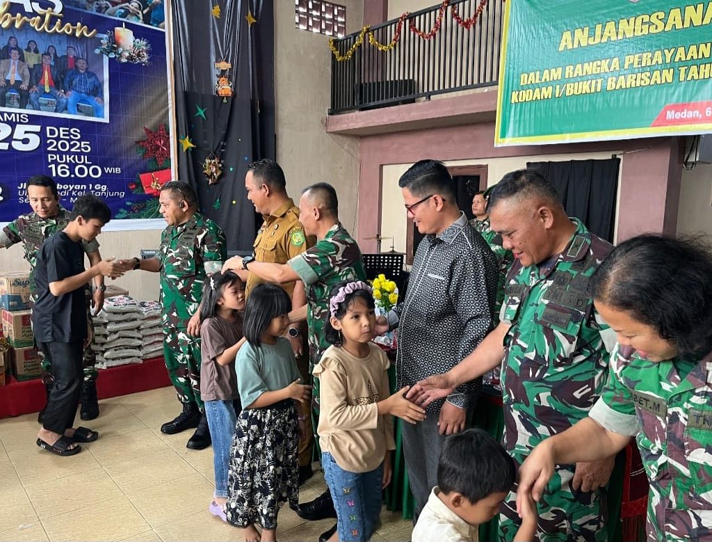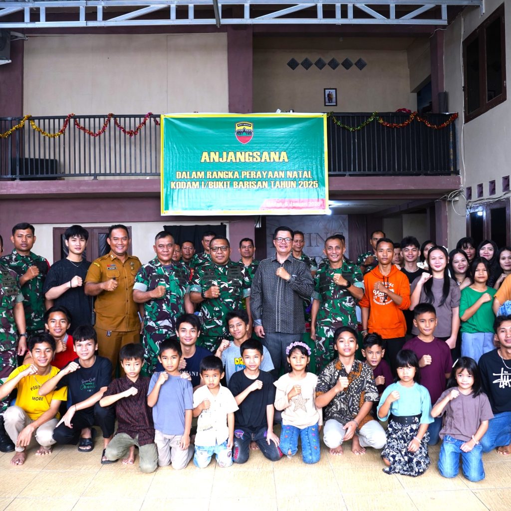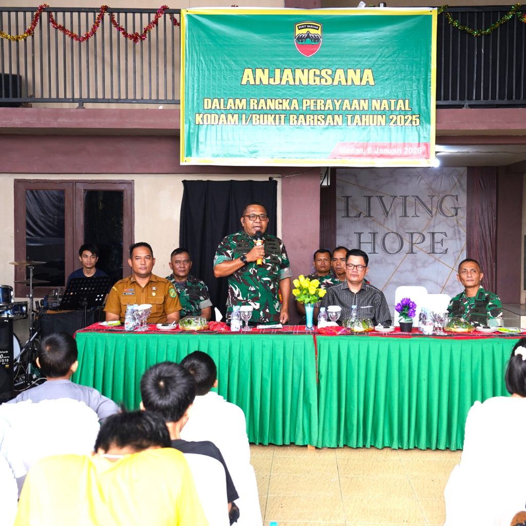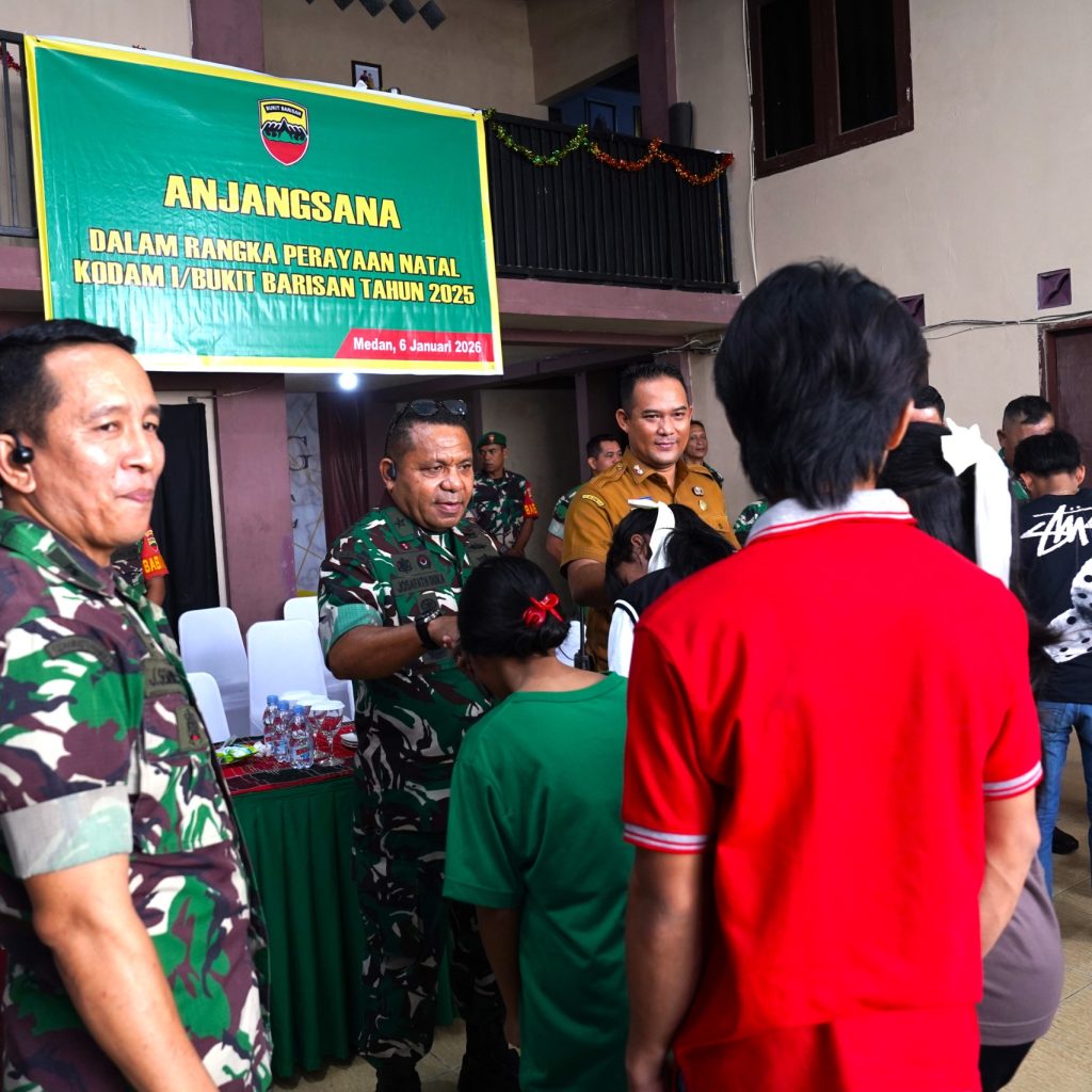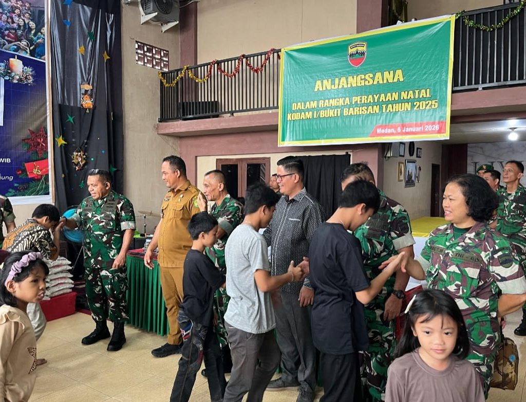 Medan – Inspektur Daerah Militer (Irdam) I/Bukit Barisan Brigjen TNI Josafath M. Robert Duka, S.I.P., memimpin kegiatan anjangsana dalam rangka Perayaan Natal Kodam I/Bukit Barisan Tahun Anggaran 2025 di Panti Asuhan Sukacita Anak Mahkota (Panti Asuhan Kristen Protestan), Jalan Flamboyan I Gang Ulun, Kelurahan Tanjung Selamat, Kecamatan Medan Tuntungan, Kota Medan, Selasa (6/1/2026).