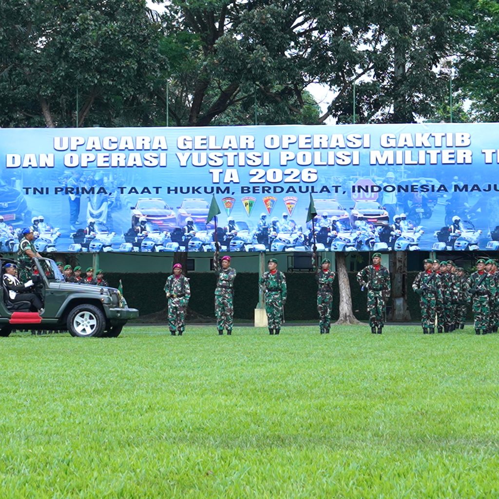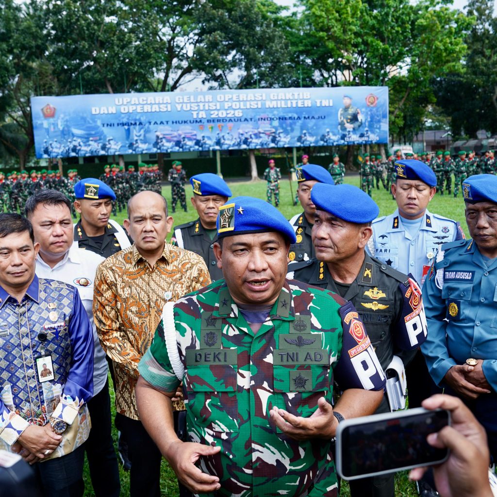 Medan – Kepala Staf Kodam (Kasdam) I/Bukit Barisan Brigjen TNI Deki Santoso Pattinaya memimpin Upacara Gelar Operasi Penegakan Ketertiban (Gaktib) dan Operasi Yustisi Polisi Militer Tahun Anggaran 2026 di Lapangan Upacara Makodam I/BB, Jalan Gatot Subroto, Medan, Jumat (13/2/2026). Upacara ini menandai dimulainya pelaksanaan operasi penegakan hukum dan disiplin bagi prajurit di wilayah Kodam I/Bukit Barisan.