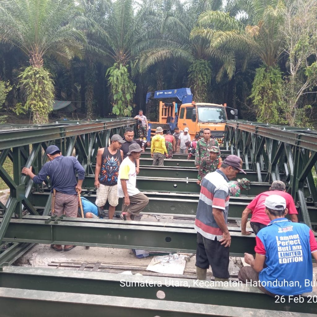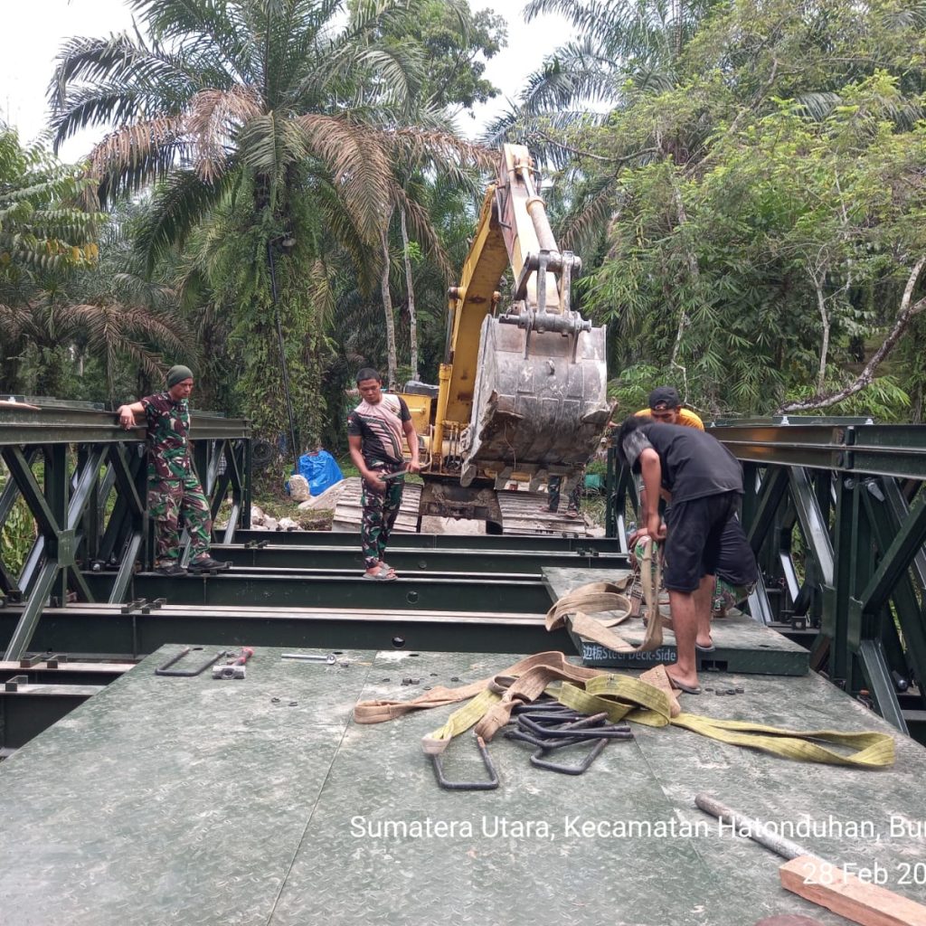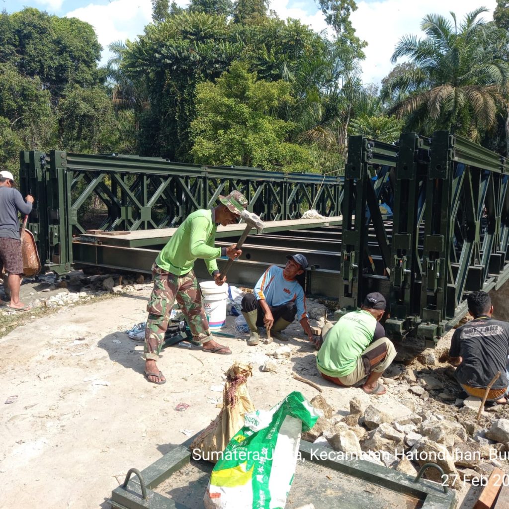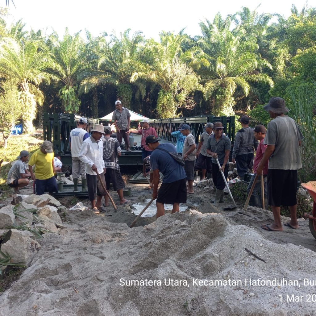Pengerjaan jembatan dilakukan oleh personel Kodim 0207/Simalungun melalui Koramil 10/Tanah Jawa (TJ) bersama prajurit Yonzipur I/DD dan melibatkan partisipasi aktif masyarakat setempat. Kolaborasi tersebut membuat seluruh tahapan pekerjaan dapat diselesaikan secara efektif dan tepat waktu.