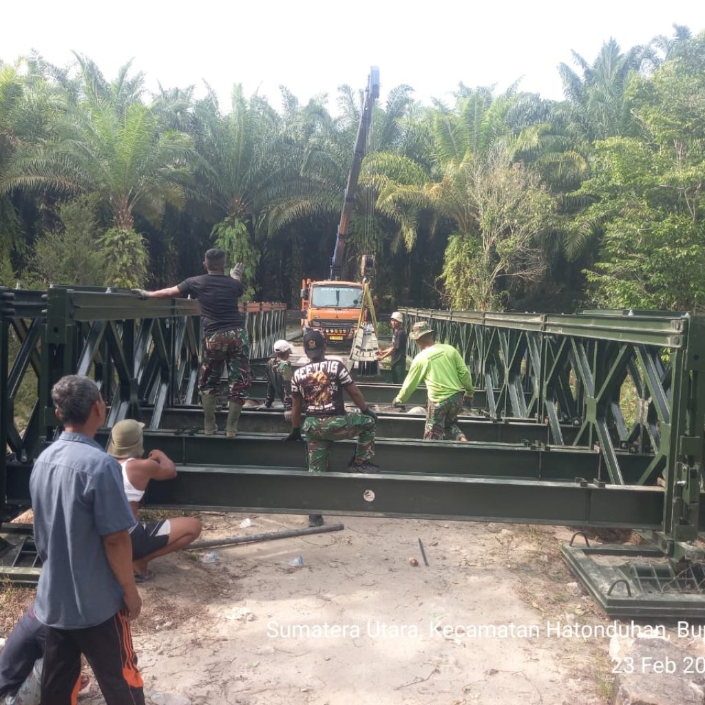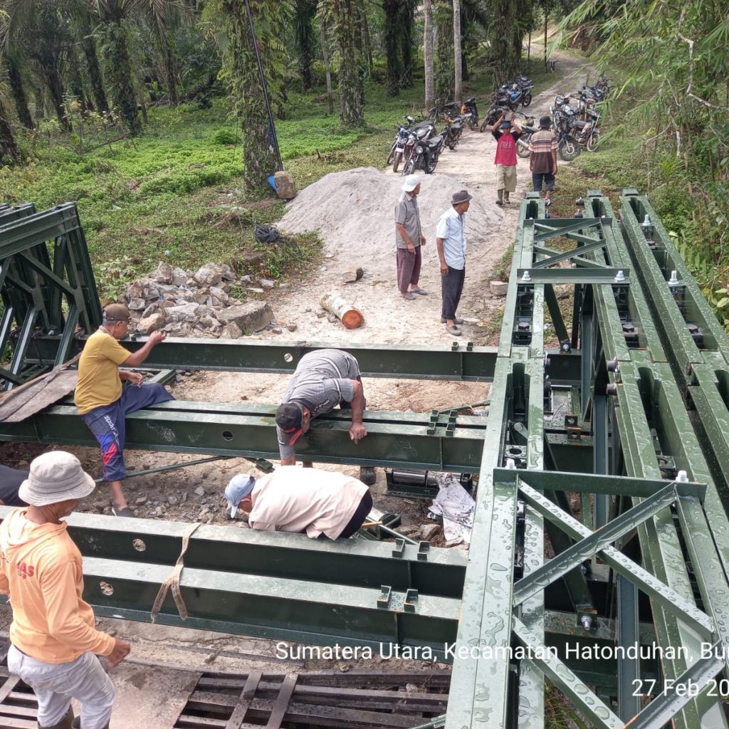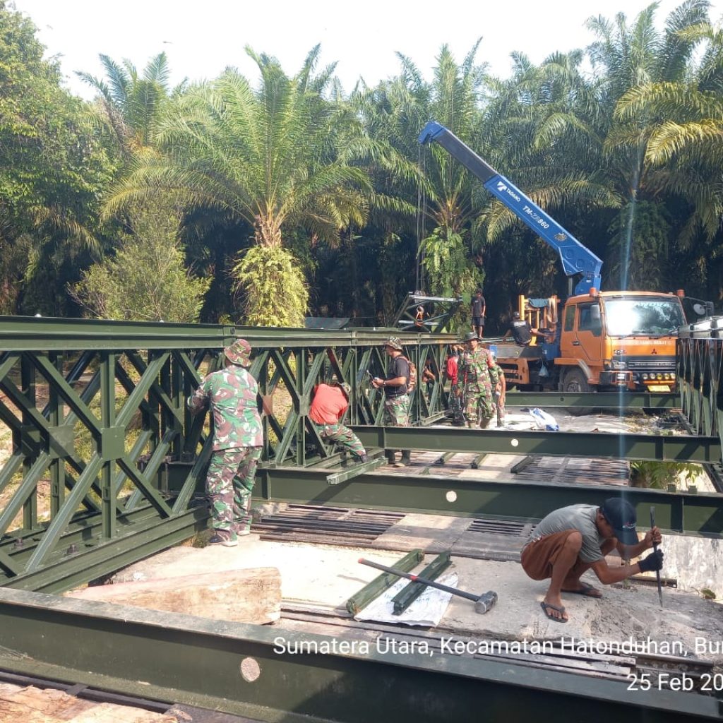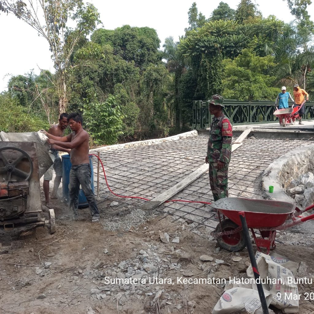 Pengerjaan jembatan dilakukan oleh personel Kodim 0207/Simalungun melalui Koramil 10/Tanah Jawa (TJ) bersama prajurit Yonzipur I/DD dan melibatkan partisipasi aktif masyarakat setempat. Kolaborasi tersebut membuat seluruh tahapan pekerjaan dapat diselesaikan secara efektif dan tepat waktu.