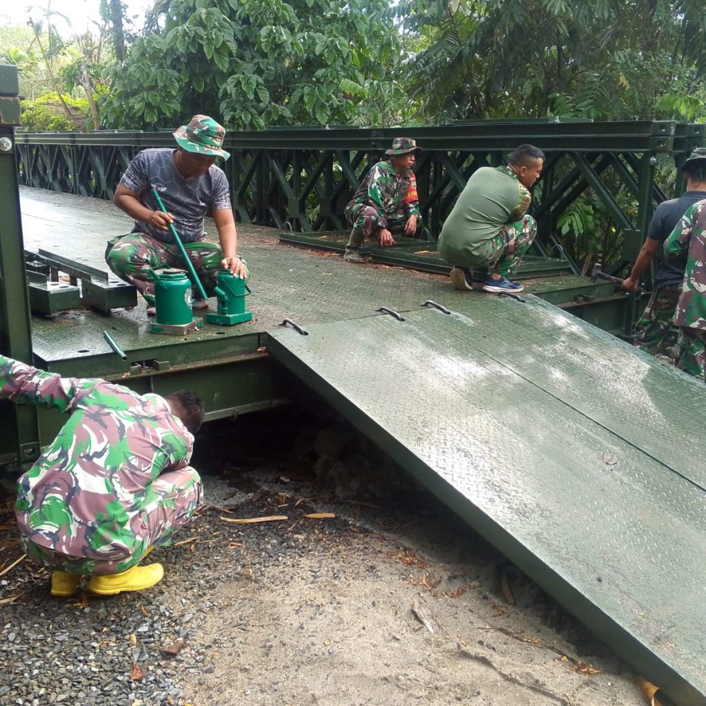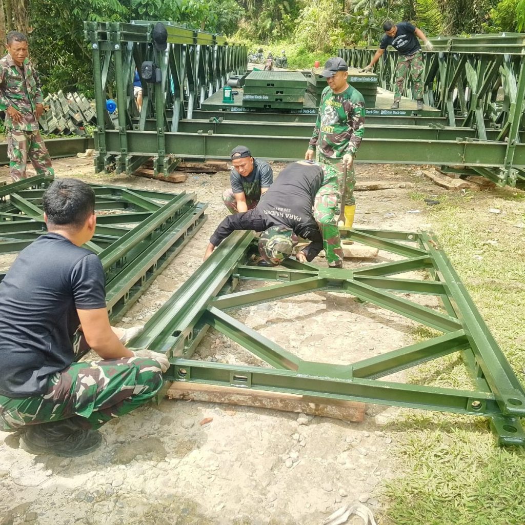 Adapun tahapan pekerjaan meliputi pembersihan dan persiapan lahan, pembongkaran material jembatan dari kendaraan, perambuan, perakitan material jembatan modular, pembuatan dudukan pelat dasar, pembangunan pondasi batu, pengecoran, hingga pengecatan sebagai tahap akhir penyelesaian.