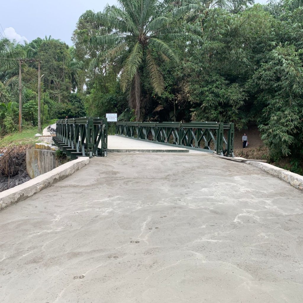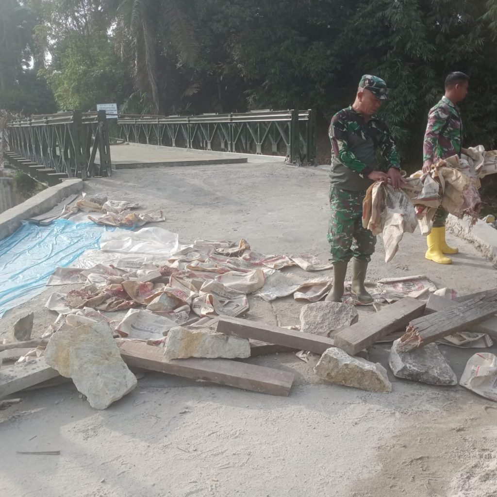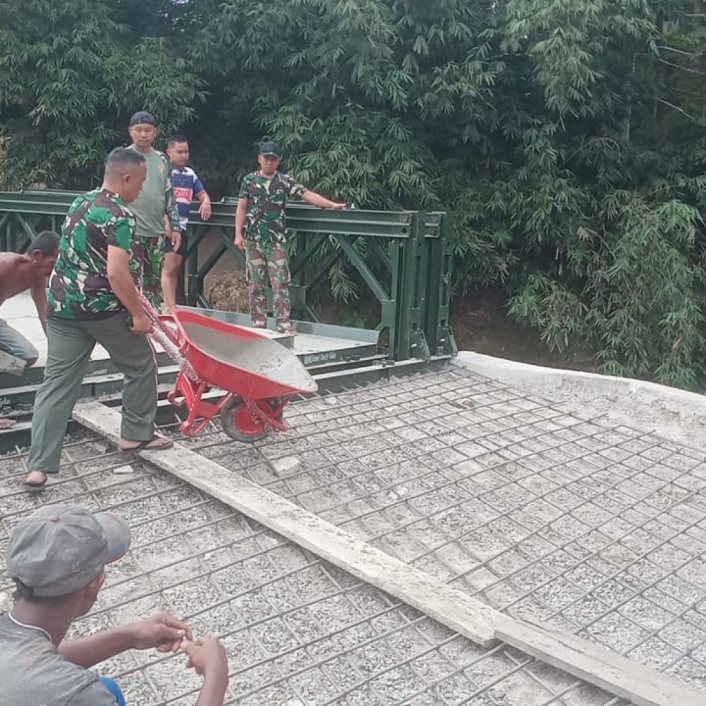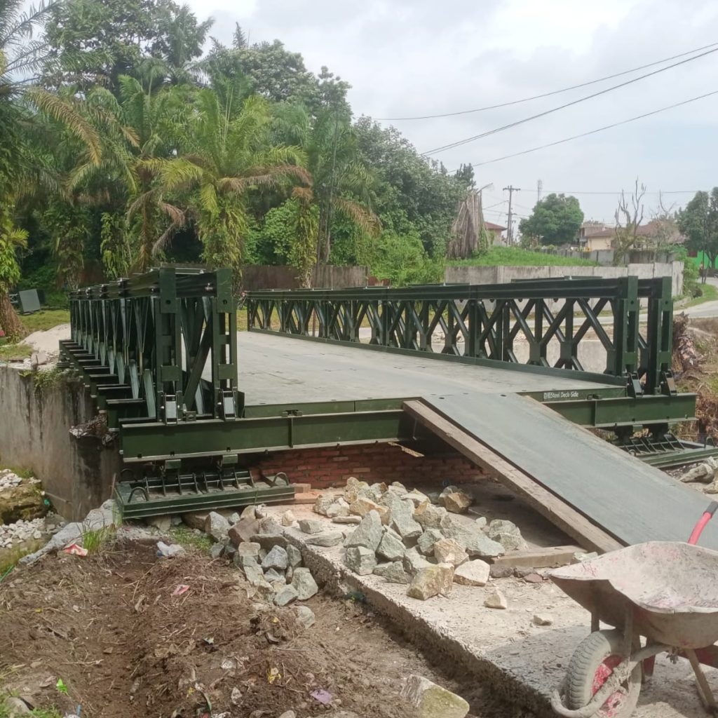 Adapun tahapan pekerjaan meliputi pengukuran bentangan jembatan, pembongkaran papan lantai jembatan lama, perakitan jembatan modular, pemasangan gelagar lintang, pemasangan plat lantai jembatan, serta pengecoran pada tepi dekat dan tepi jauh jembatan guna memperkuat akses masuk dan keluar jembatan.