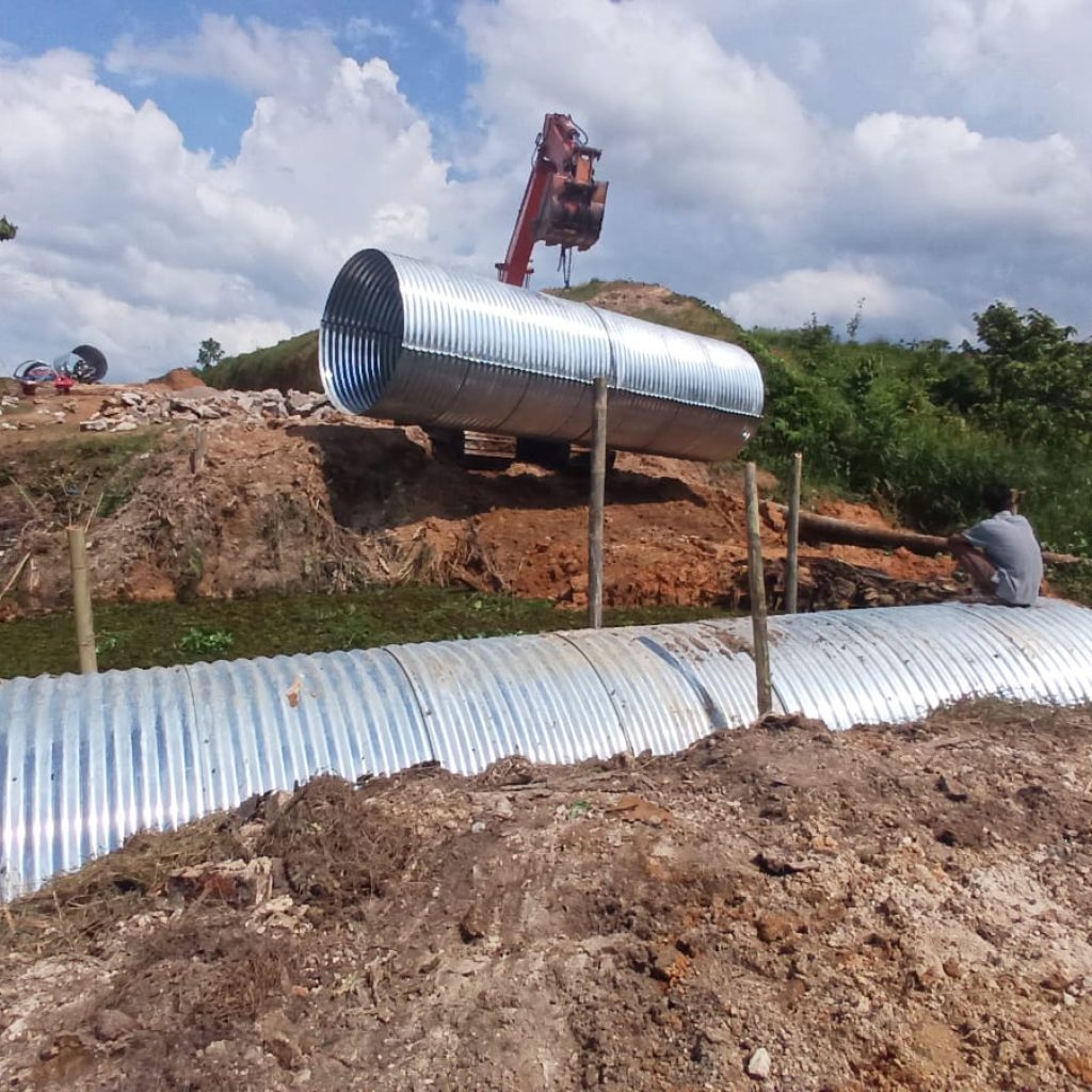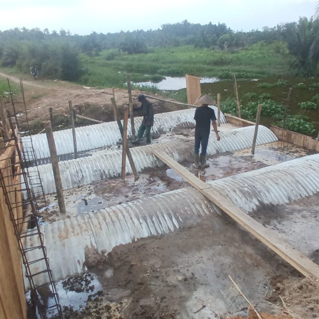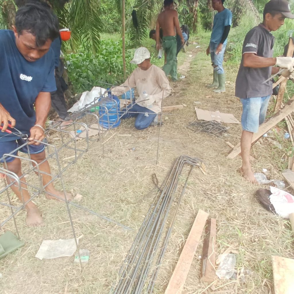 Adapun kegiatan yang dilaksanakan saat ini meliputi perakitan besi tiang cor serta pengikatan besi Aramco menggunakan cor batu padas. Berbagai material seperti rangka jembatan, semen, pasir, batu padas, serta perlengkapan pendukung lainnya telah tersedia dan dimanfaatkan dalam proses pembangunan, meskipun kondisi cuaca yang tidak menentu.