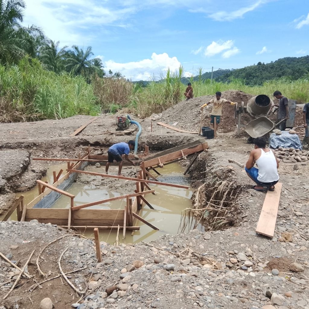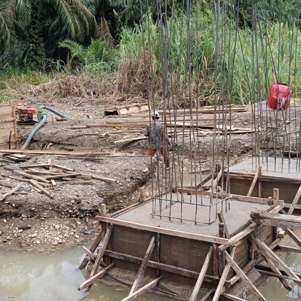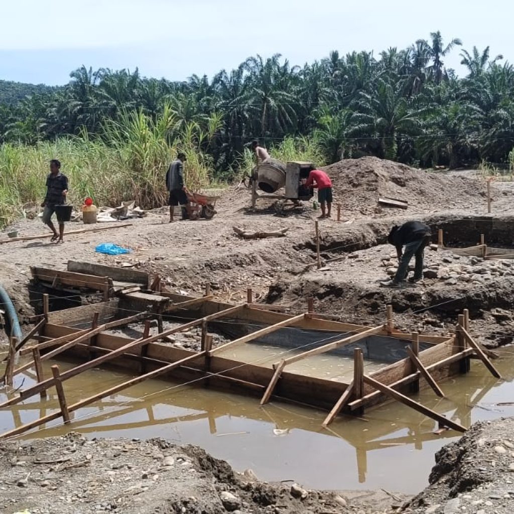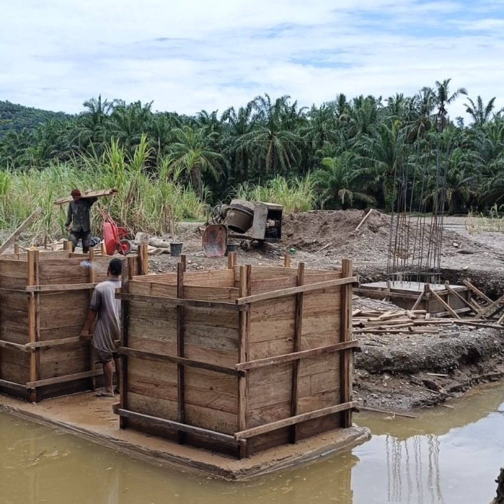 Pengerjaan jembatan dilakukan secara bertahap dengan melibatkan personel Koramil 09/Sosa Kodim 0212/TS bersama masyarakat dan tenaga tukang. Sejumlah tahapan pekerjaan yang telah dilaksanakan meliputi pengecoran pondasi dan blok beton di sisi tepi dekat, pembuatan mal foot plat, perakitan besi, hingga pengecoran foot plat. Saat ini, progres pembangunan jembatan gantung tersebut telah mencapai sekitar persen.