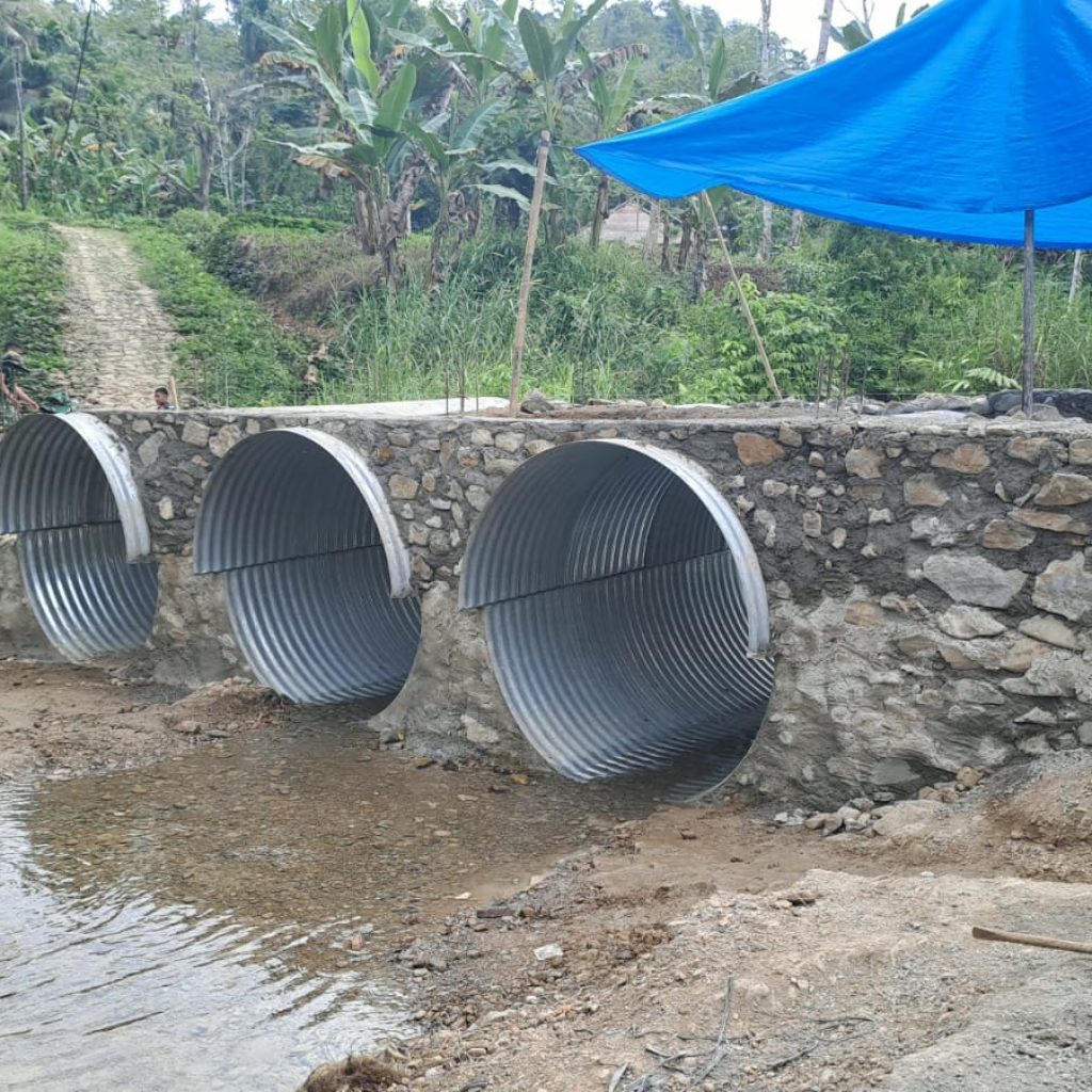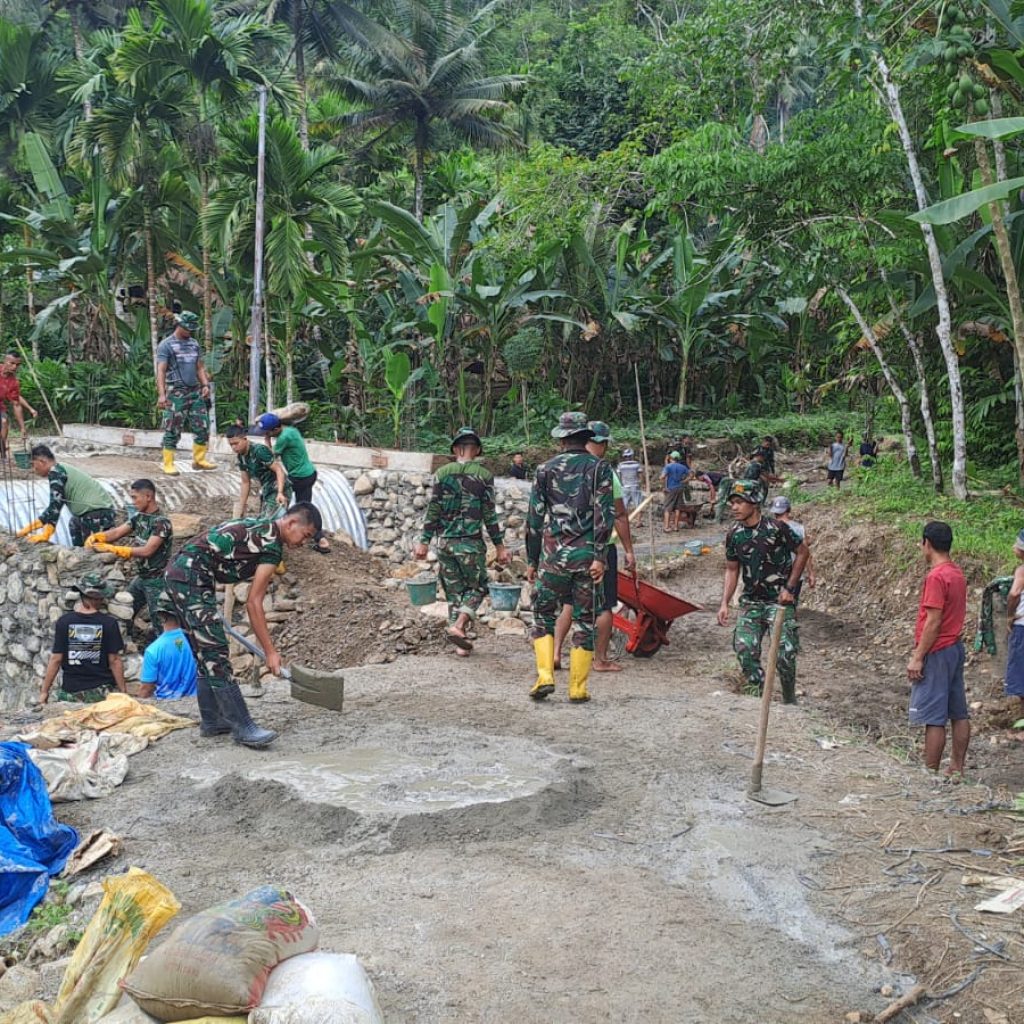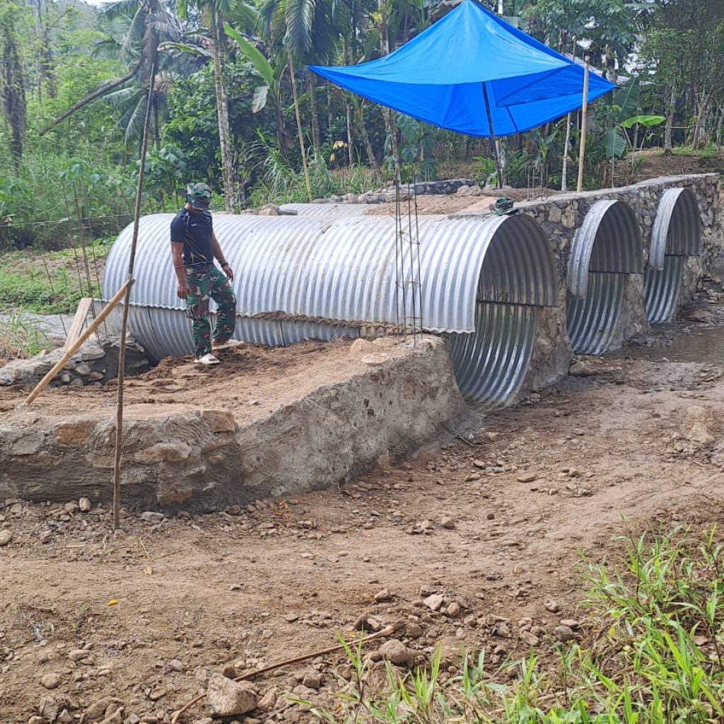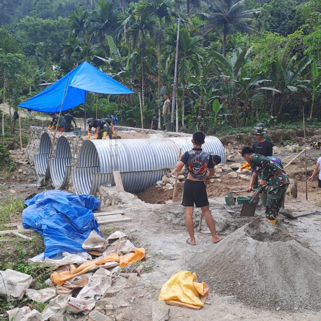 Proses pembangunan dilaksanakan oleh personel Kodim 0213/Nias bersama Yon TP 903/Baluseda dengan semangat gotong royong bersama masyarakat setempat. Adapun pekerjaan yang dilaksanakan meliputi perakitan struktur pipa baja, pembuatan pondasi atau dudukan, penimbunan dengan material pasir dan batu, pemadatan tanah, hingga pengecoran dinding sayap.
