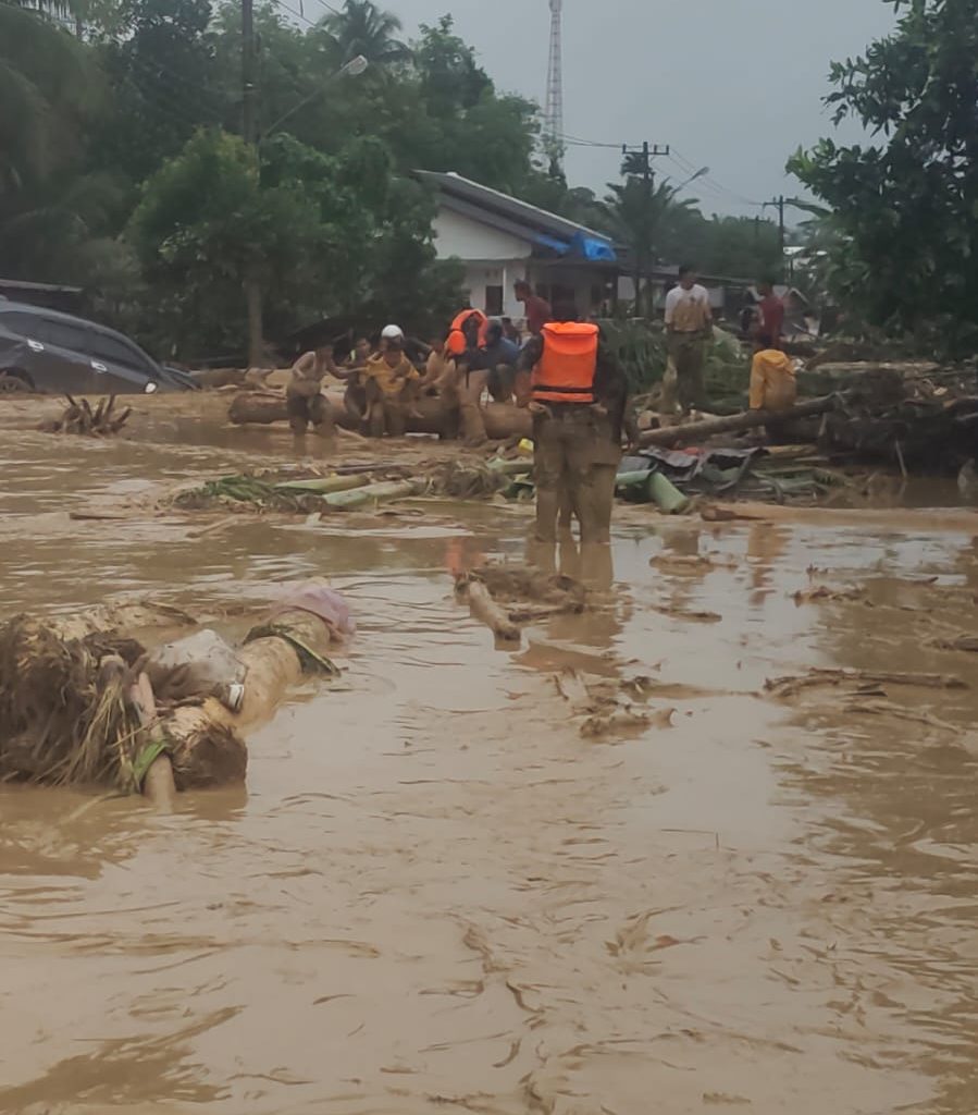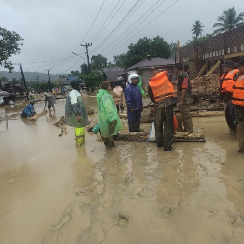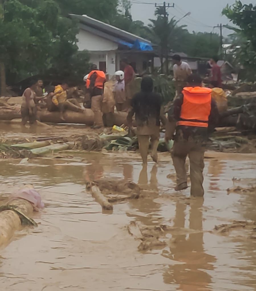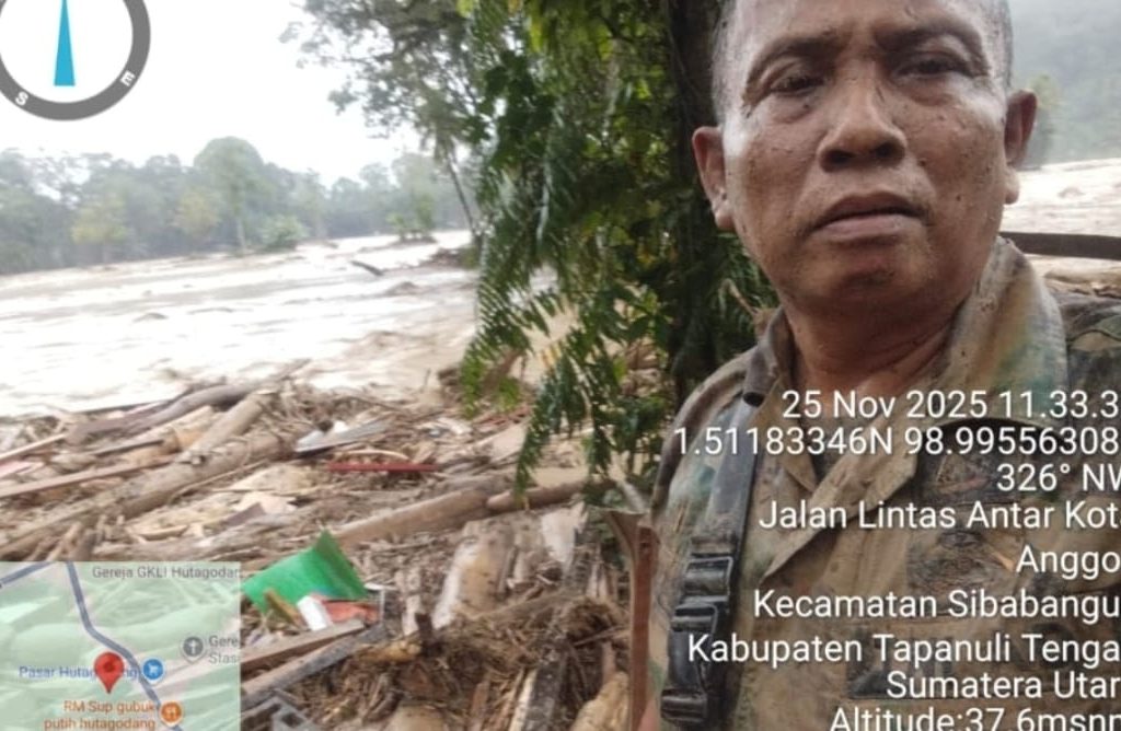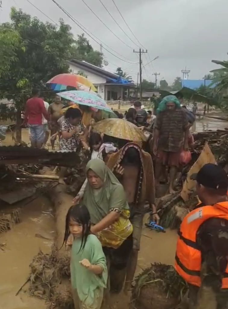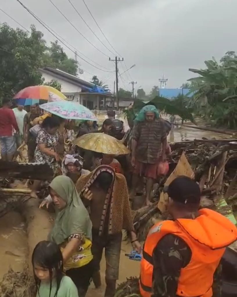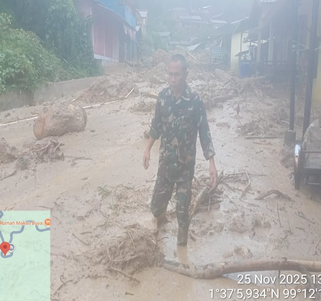 Tapanuli Selatan – Koramil 01/Batangtoru jajaran Kodim 0212/Tapsel dikerahkan untuk membantu evakuasi warga yang terdampak banjir di Desa Garoga, Kecamatan Batangtoru, Kabupaten Tapanuli Selatan, Selasa (25/11/2025). Proses evakuasi berlangsung dramatis ketika empat personel yang turun ke lokasi diterjang arus deras hingga dua di antaranya sempat hanyut dan dinyatakan hilang.