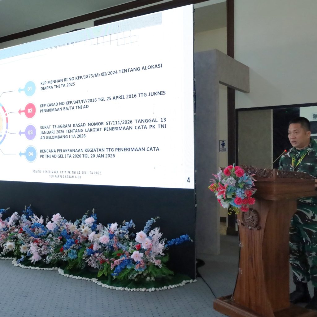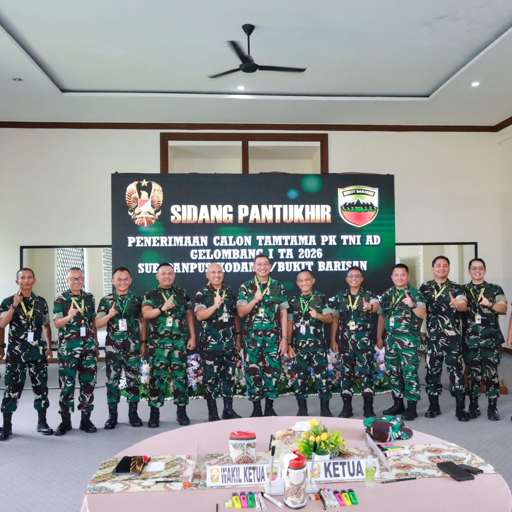 Pematangsiantar – Pangdam I/Bukit Barisan Mayjen TNI Hendy Antariksa memimpin kegiatan Sidang Pantukhir Pusat Penerimaan Calon Tamtama (Cata) PK TNI AD Gelombang I TA 2026 tingkat Sub Panpus Kodam I/BB di Lapangan Jenderal Soedirman Rindam I/BB, Pematangsiantar, Jumat (13/3/2026). Setibanya di Rindam I/BB, Pangdam menerima laporan dan penghormatan jajar sebelum kegiatan dimulai.