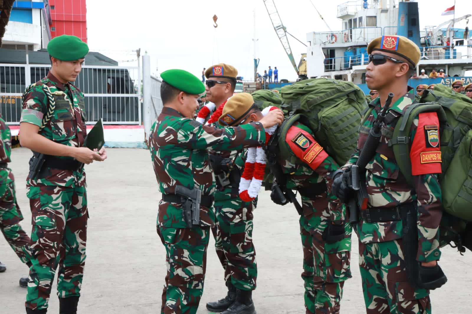 Belawan – Pangdam I/BB, Mayjen TNI Achmad Daniel Chardin, SE, MSi, memimpin upacara penyambutan Prajurit Yonarhanud 11/WBY yang telah selesai melaksanakan tugas sebagai Satgas Perbantuan Satuan Organik di Provinsi Maluku dan Maluku Utara TA 2021, di Dermaga Pelabuhan Belawan, Sumatera Utara, Jumat (14/10/2022).