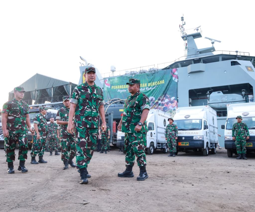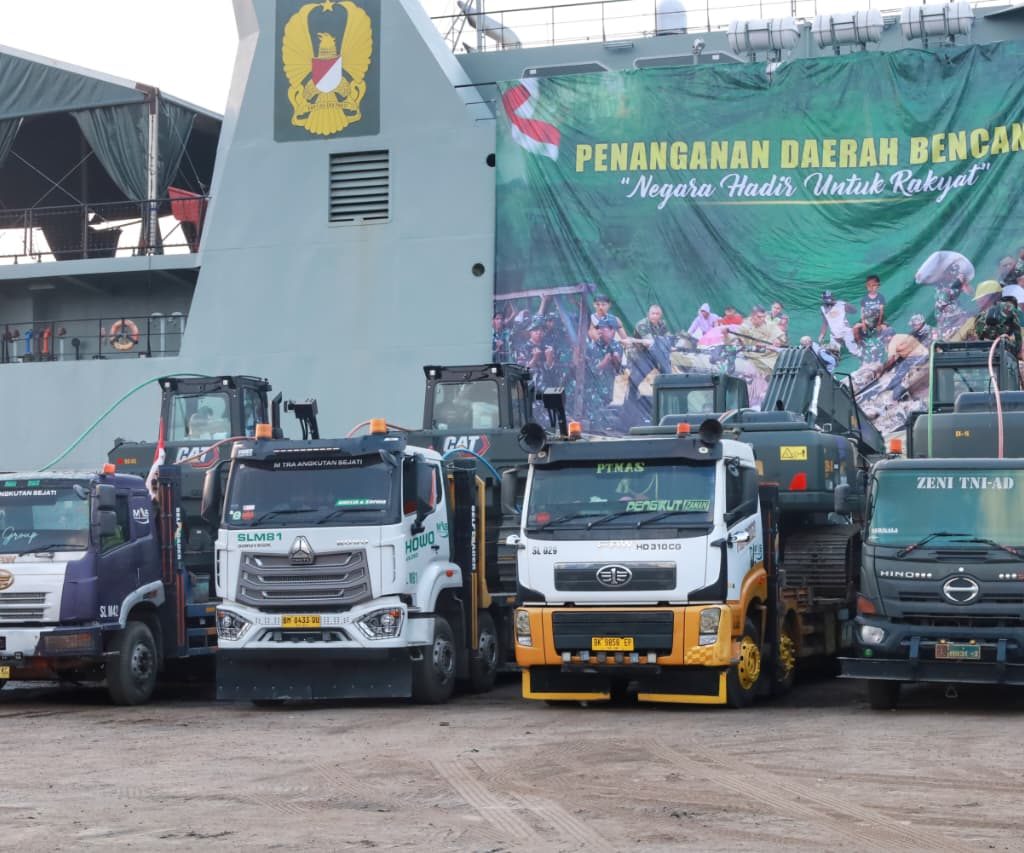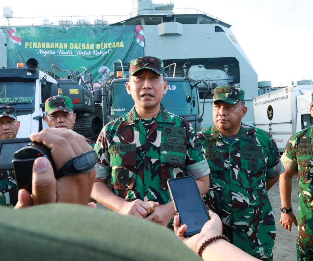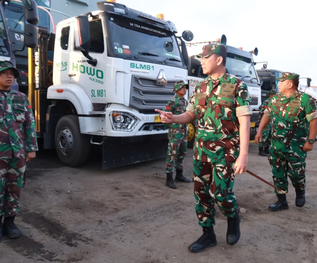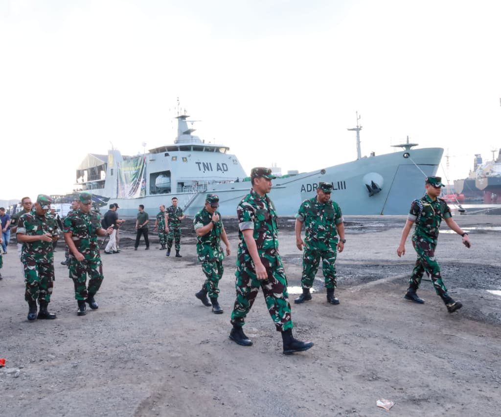 Belawan – Pangdam I/Bukit Barisan Mayjen TNI Hendy Antariksa meninjau langsung kedatangan bantuan dari Kepala Staf Angkatan Darat (Kasad) Jenderal TNI Maruli Simanjuntak yang diangkut menggunakan Kapal ADRI LIII di Dermaga 202 Ujung Baru, Pelabuhan Belawan, Senin (12/1/2026).