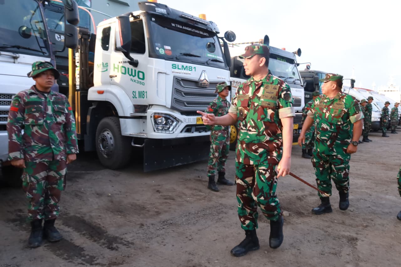 Belawan – Pangdam I/Bukit Barisan Mayjen TNI Hendy Antariksa meninjau langsung kedatangan bantuan dari Kepala Staf Angkatan Darat (Kasad) Jenderal TNI Maruli Simanjuntak yang diangkut menggunakan Kapal ADRI LIII di Dermaga 202 Ujung Baru, Pelabuhan Belawan, Senin (12/1/2026).