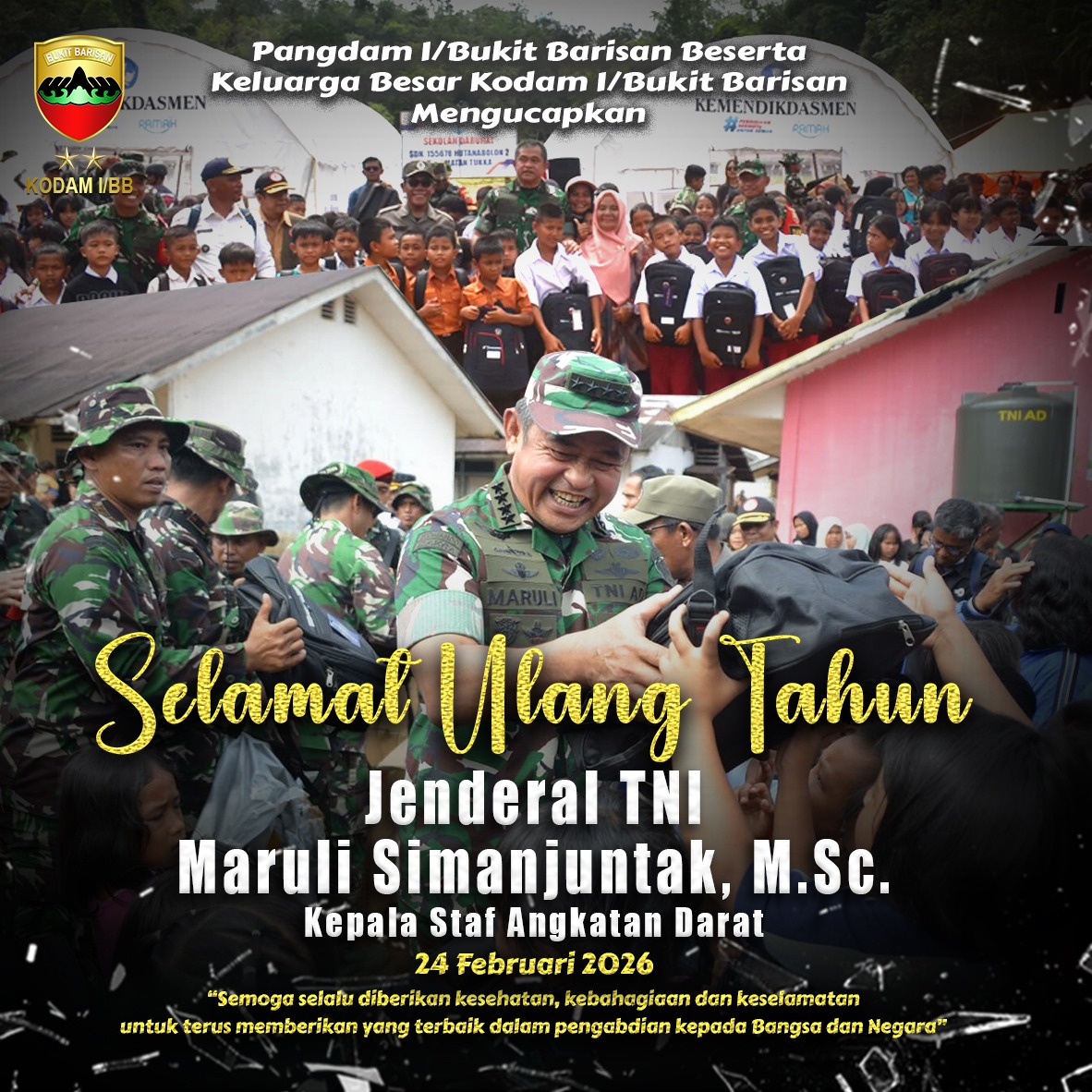 Pangdam I/Bukit Barisan Beserta Keluarga Besar Kodam I/Bukit Barisan Mengucapkan Selamat Ulang Tahun Jenderal TNI Maruli Simanjuntak, M.Sc. Kepala Staf Angkatan Darat 24 Februari 2026admin25/02/2026Berita Utama1 Dilihat Post Views: 1