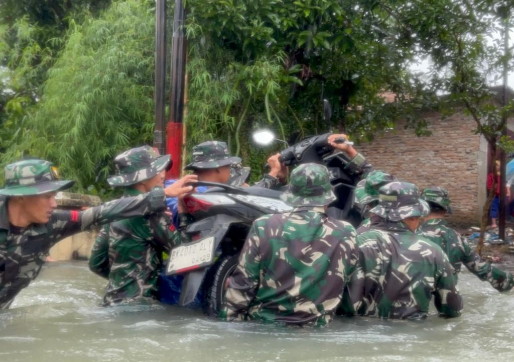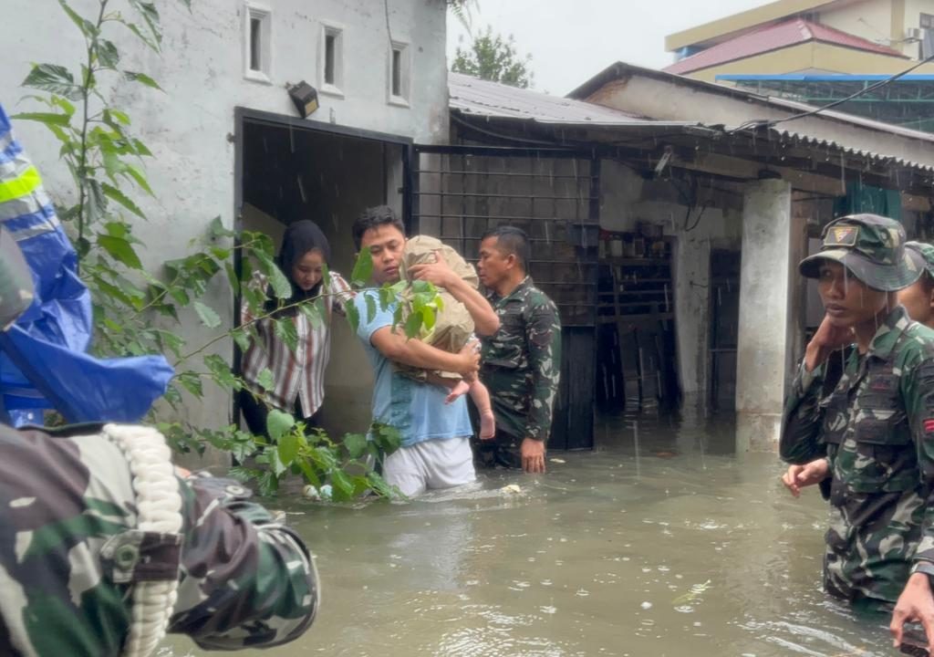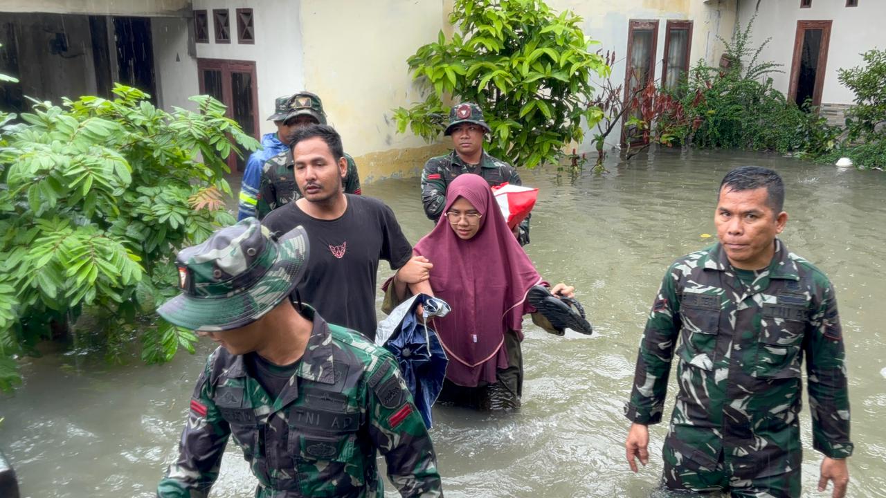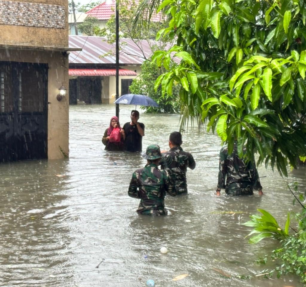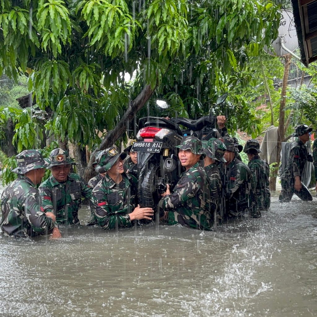 Medan – Prajurit Yonkav 6/NK bergerak cepat mengevakuasi warga yang terjebak banjir di Gg. Family, Lingkungan V, Kelurahan Asam Kumbang, Kota Medan, Kamis (27/11/2025). Banjir dengan ketinggian sekitar 1,5 meter merendam puluhan rumah setelah hujan deras mengguyur wilayah tersebut sejak pagi hari.