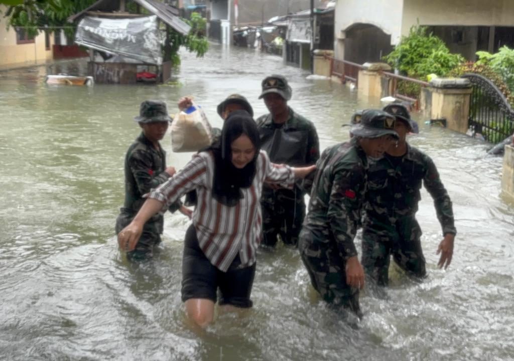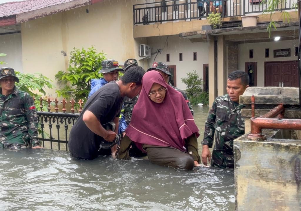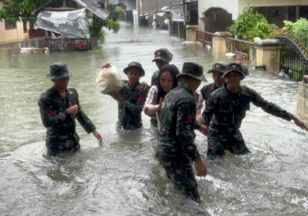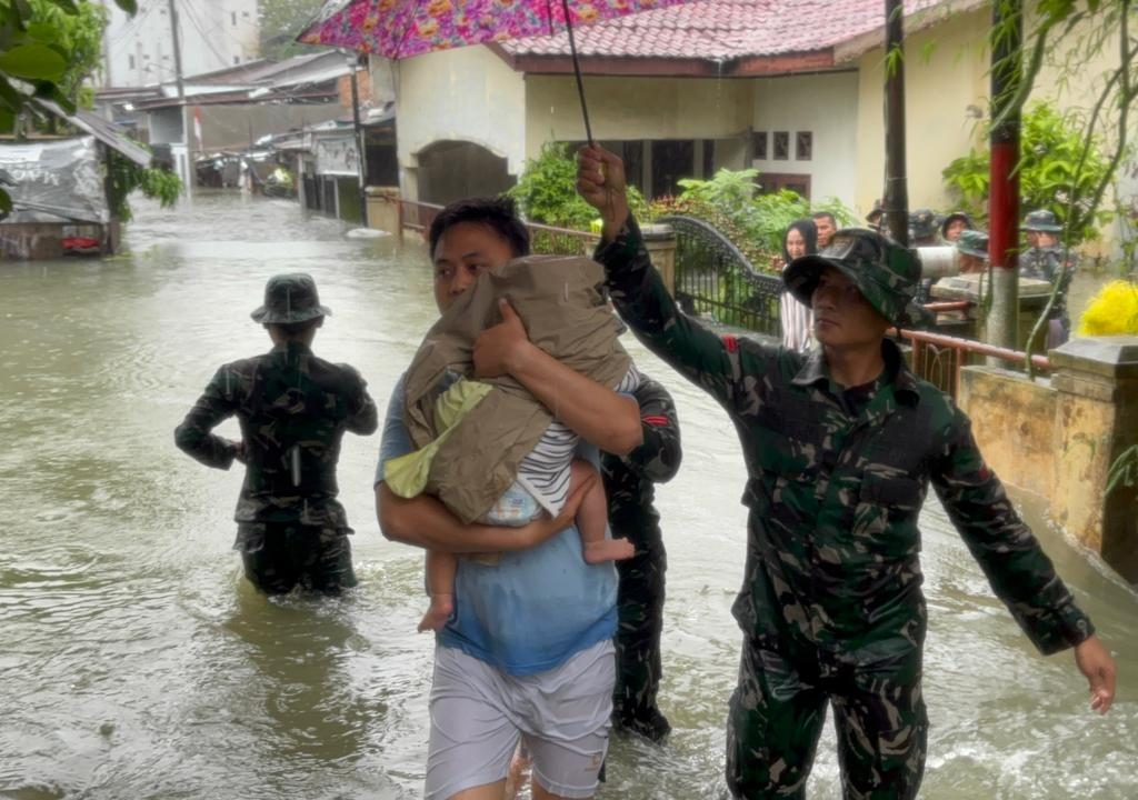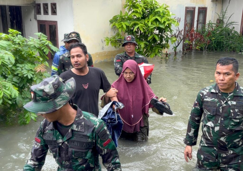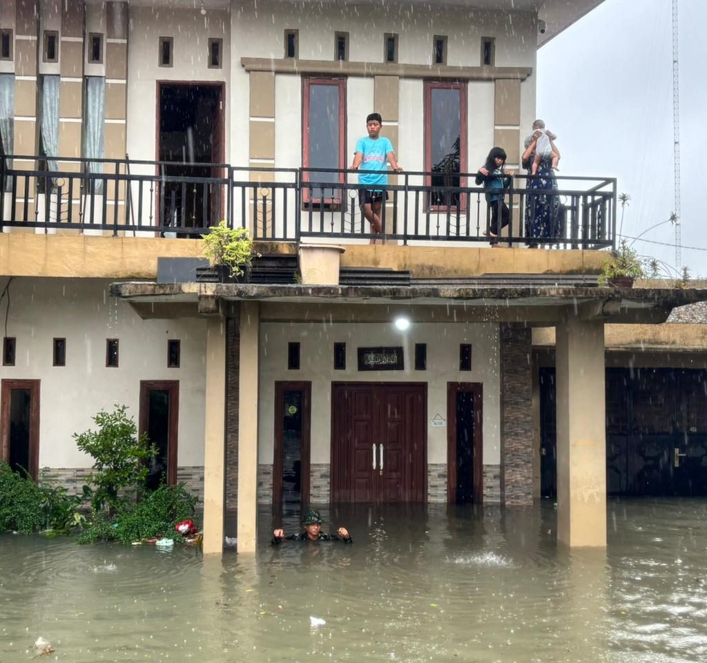 Medan – Prajurit Yonkav 6/NK bergerak cepat mengevakuasi warga yang terjebak banjir di Gg. Family, Lingkungan V, Kelurahan Asam Kumbang, Kota Medan, Kamis (27/11/2025). Banjir dengan ketinggian sekitar 1,5 meter merendam puluhan rumah setelah hujan deras mengguyur wilayah tersebut sejak pagi hari.