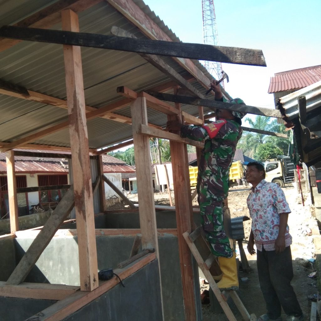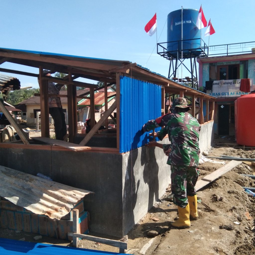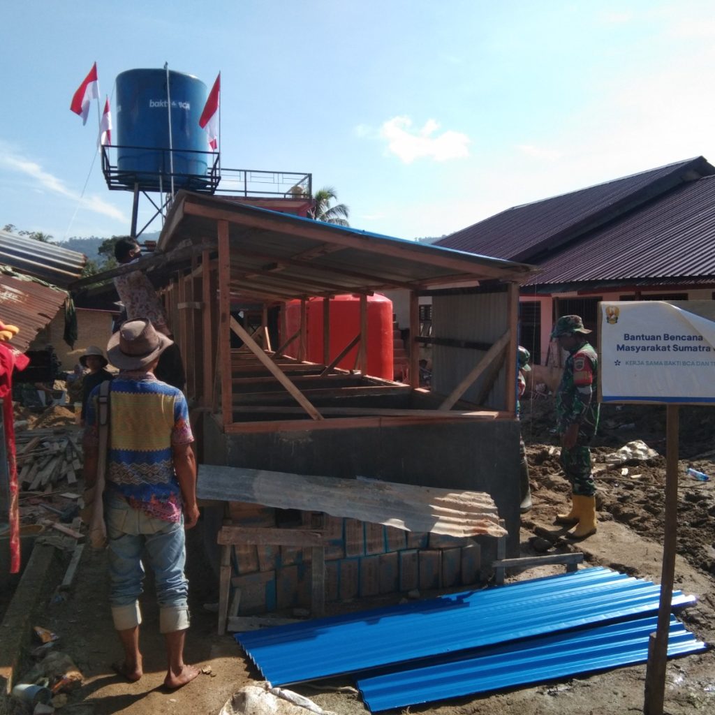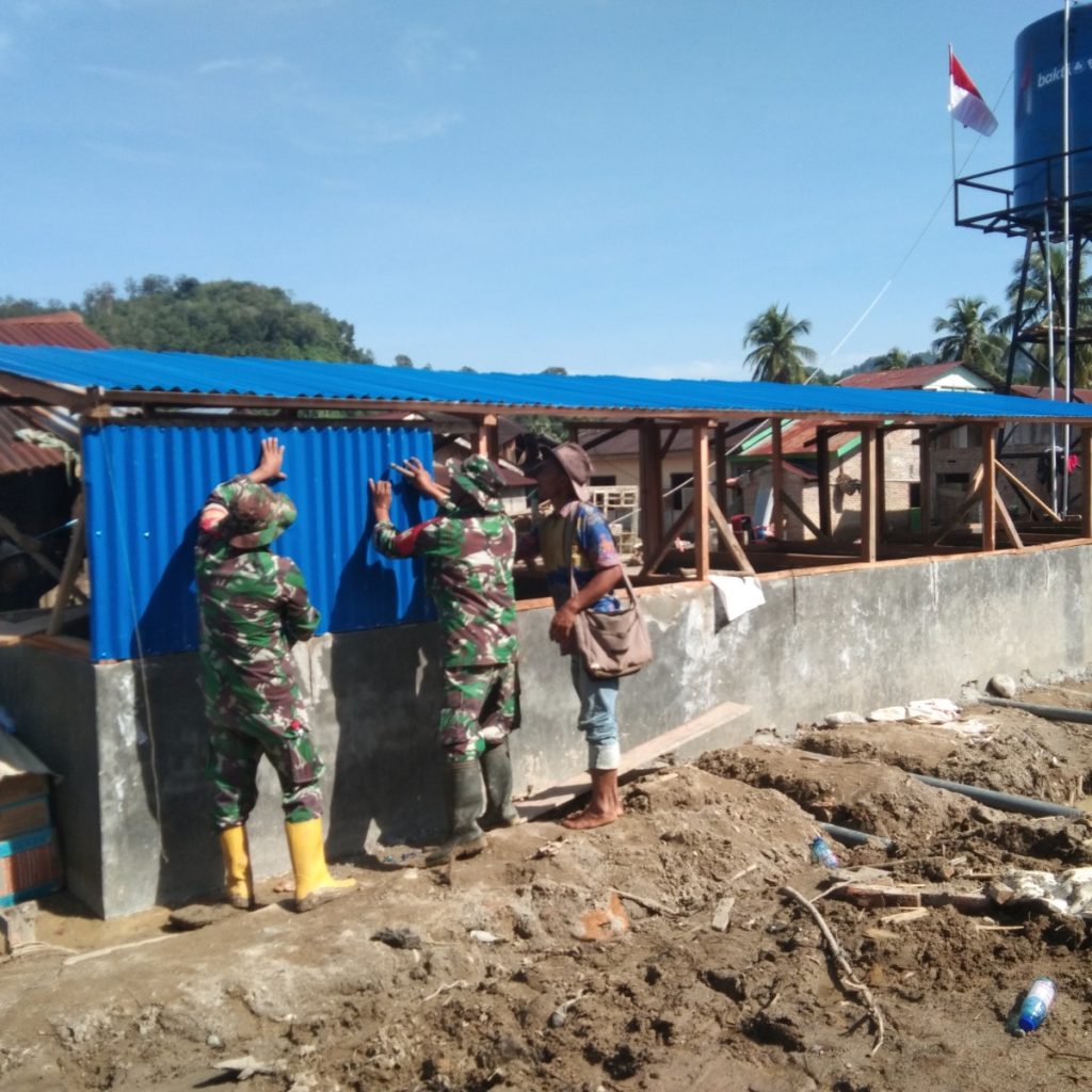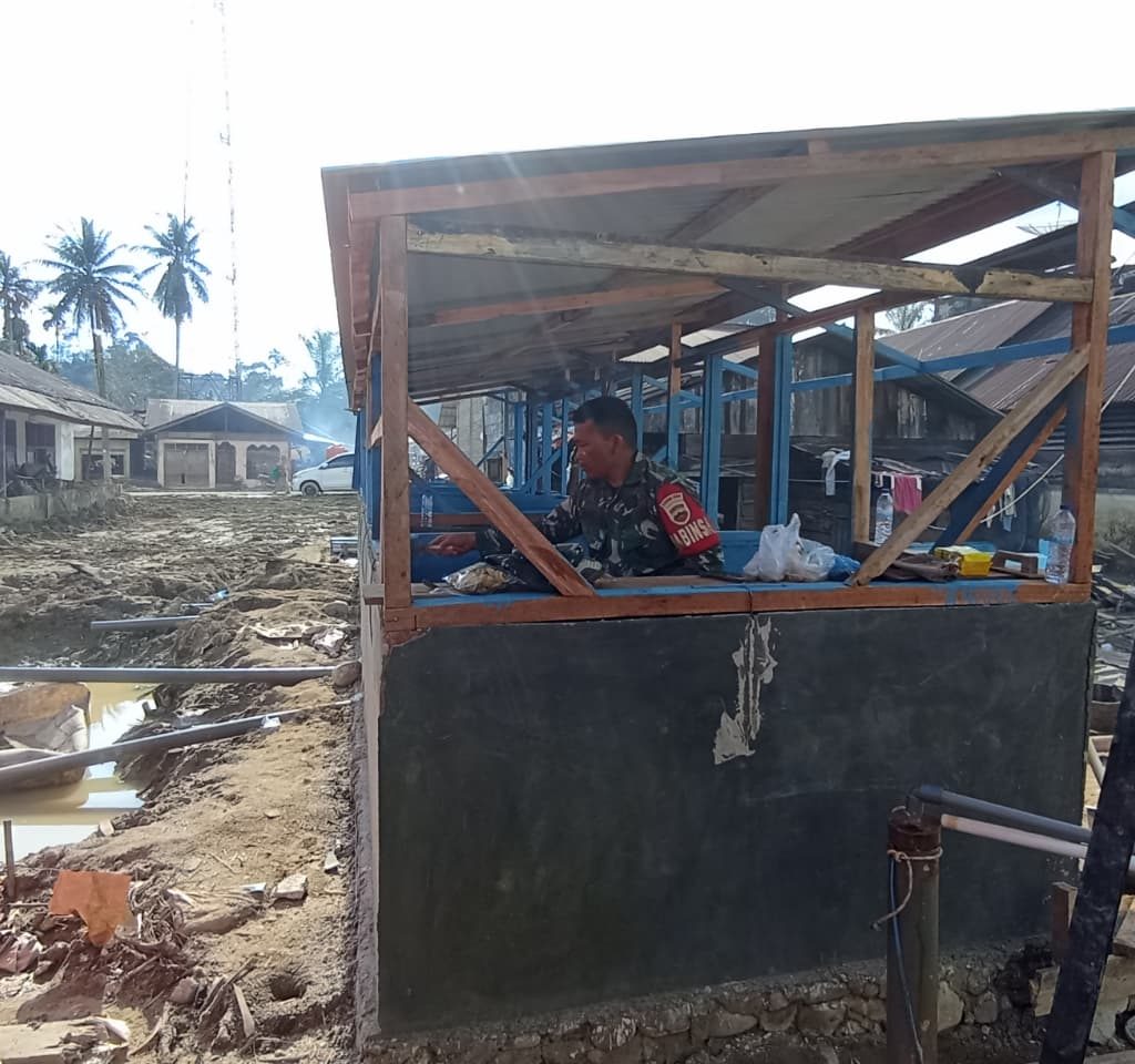 Tapanuli Selatan – Satgas penanggulangan bencana (Gulbencal) Kodam I/Bukit Barisan melalui Koramil 01/Batang Toru Kodim 0212/Tapanuli Selatan bersama masyarakat melanjutkan pembangunan MCK darurat di belakang SD Desa Huta Godang, Kecamatan Batang Toru, Kabupaten Tapanuli Selatan. Kegiatan ini merupakan bagian dari upaya tanggap darurat untuk mendukung pemenuhan kebutuhan sanitasi para pengungsi korban bencana banjir bandang yang terjadi beberapa hari sebelumnya.