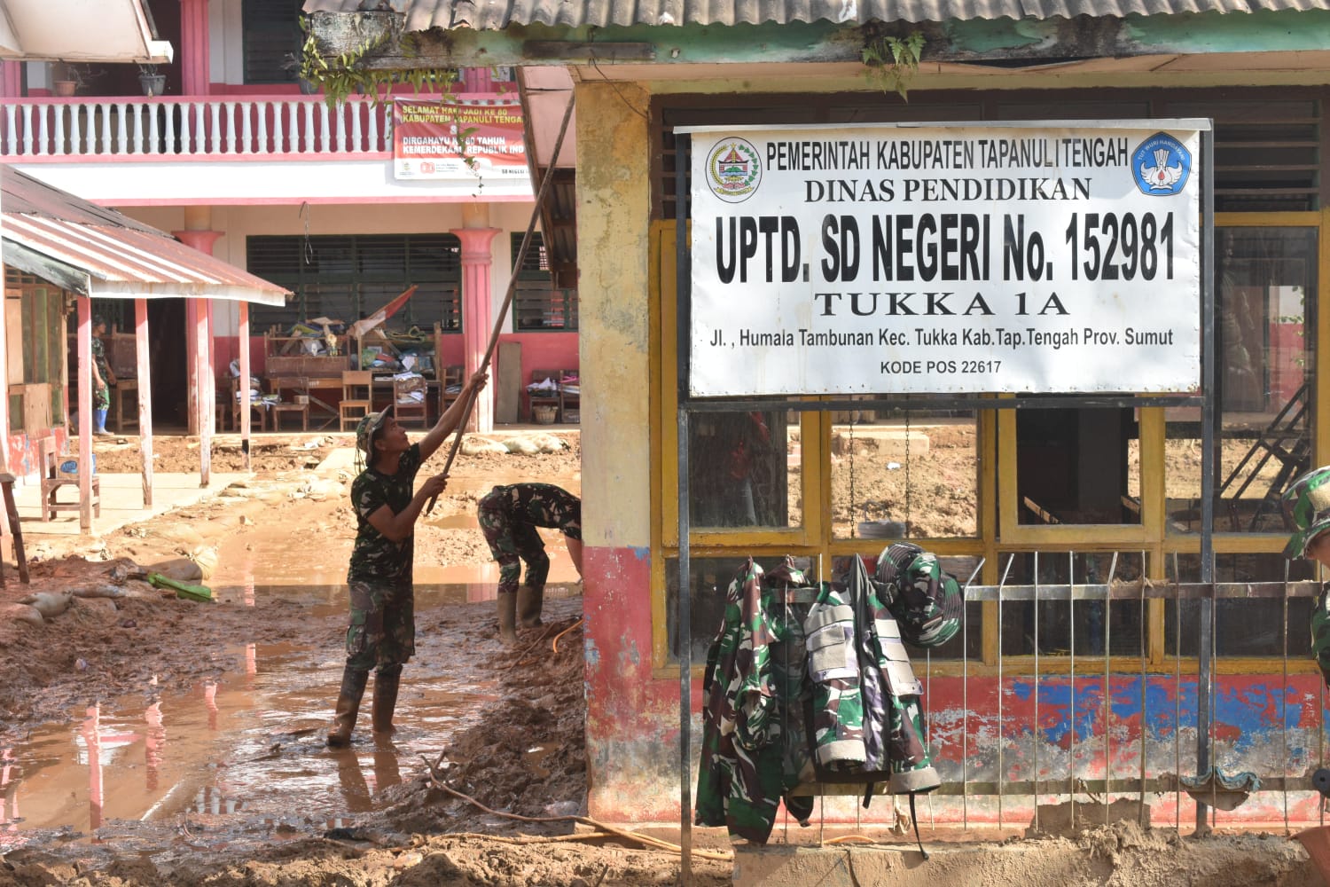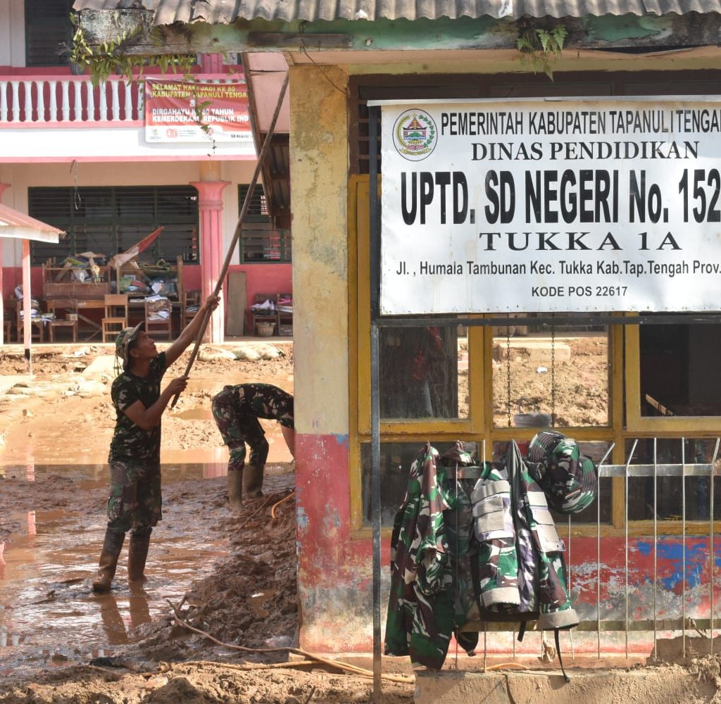 Tapanuli Tengah — Satgas Penanggulangan Bencana Alam (Gulbencal) Kodam I/Bukit Barisan melaksanakan pembersihan pascabencana banjir dan tanah longsor di Sekolah Dasar Negeri (SDN) 152981 dan SDN 152982 (1A dan 1B) yang berlokasi di Jalan Humala Tambunan, Kelurahan Tukka, Kecamatan Tukka, Kabupaten Tapanuli Tengah, Minggu (18/1/2026).