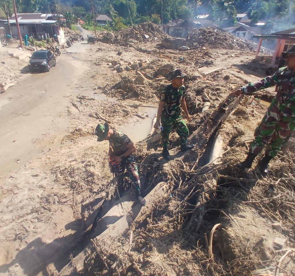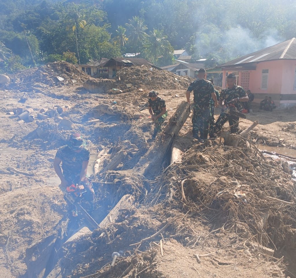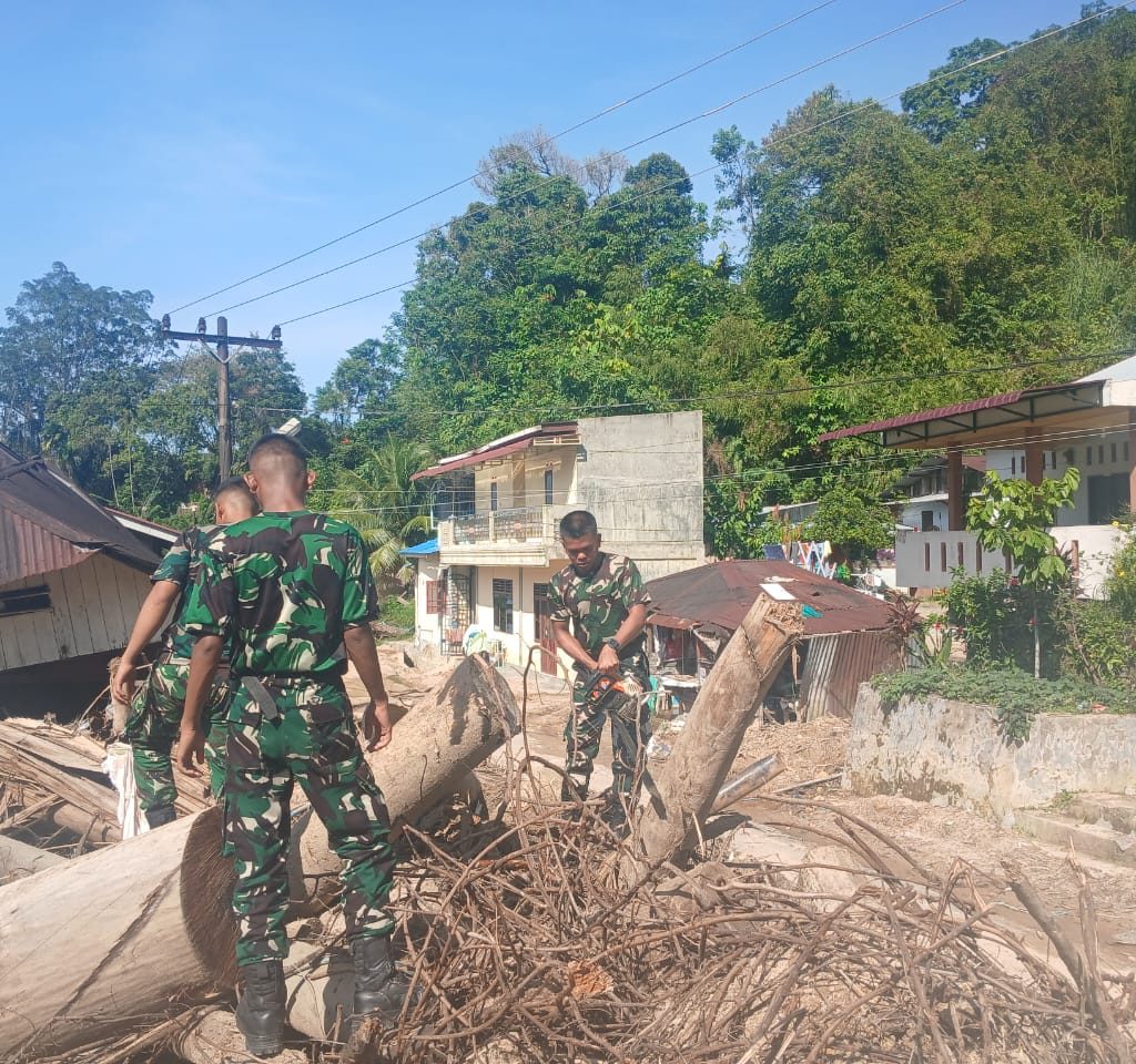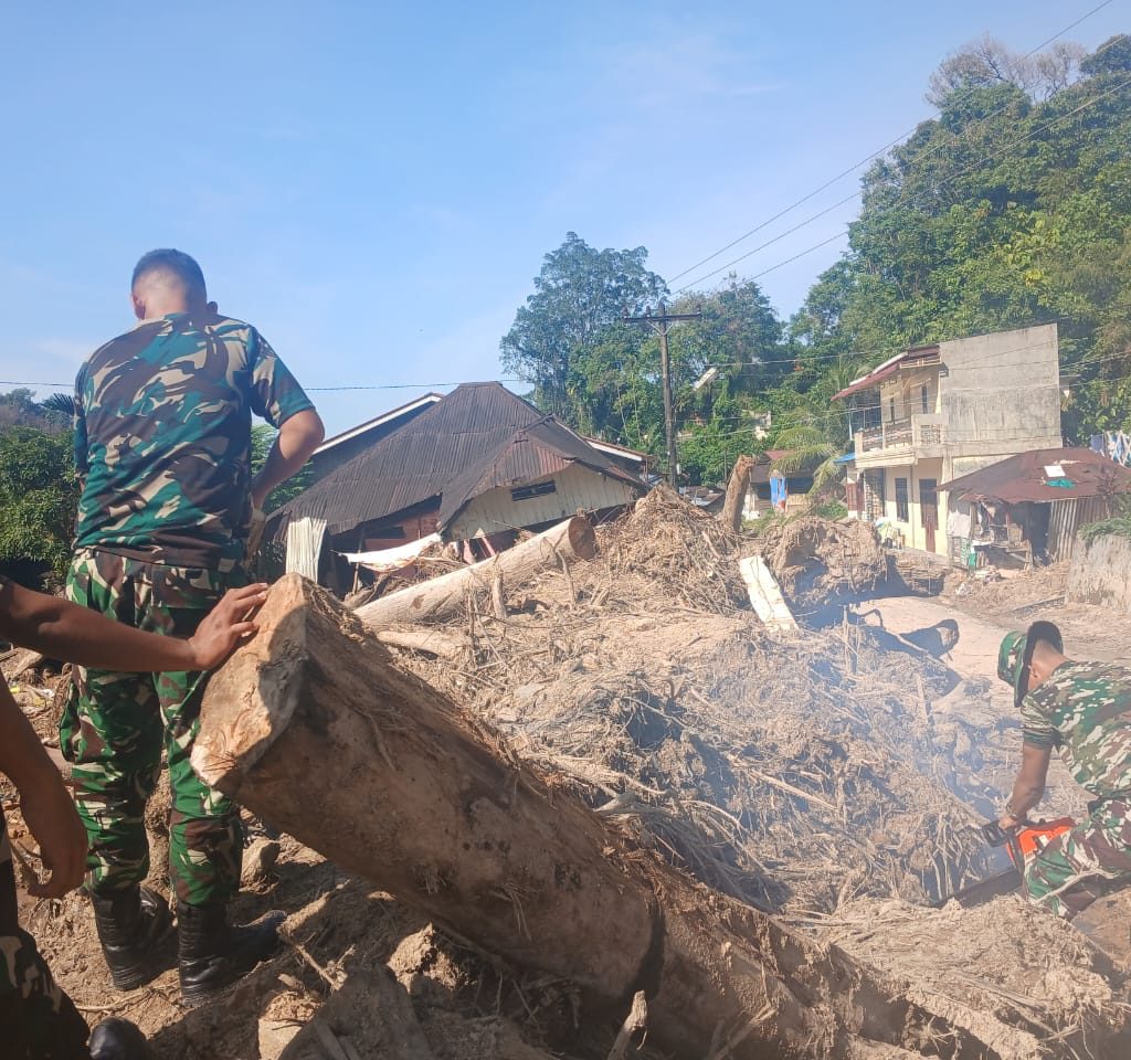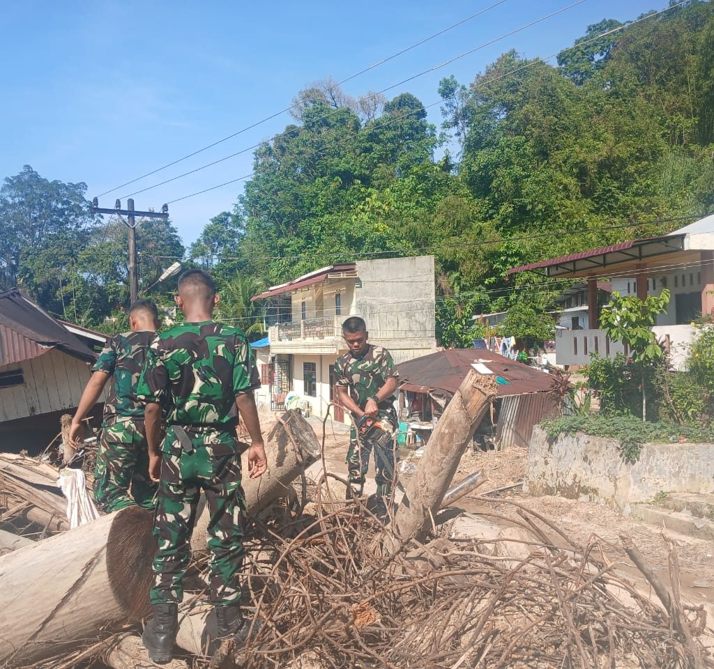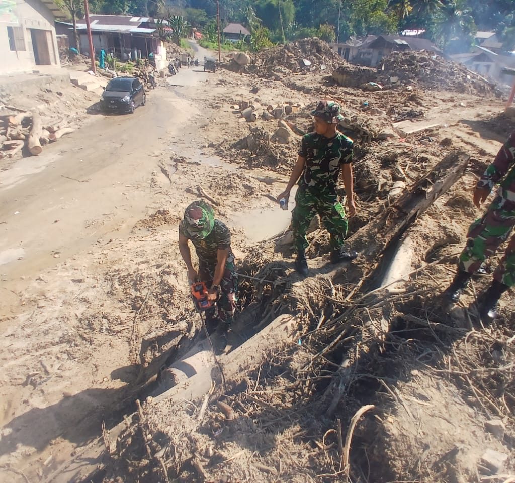 Di sektor Jalan Aek Parira, pembersihan difokuskan pada lumpur serta material kayu yang bertumpukan di badan jalan dan fasilitas umum. Untuk mempercepat proses, personel menggunakan alat Shinso guna memotong material kayu berukuran besar, sementara lumpur dibersihkan dengan alat manual seperti cangkul, skop, dan peralatan sederhana lainnya.