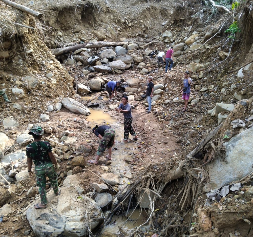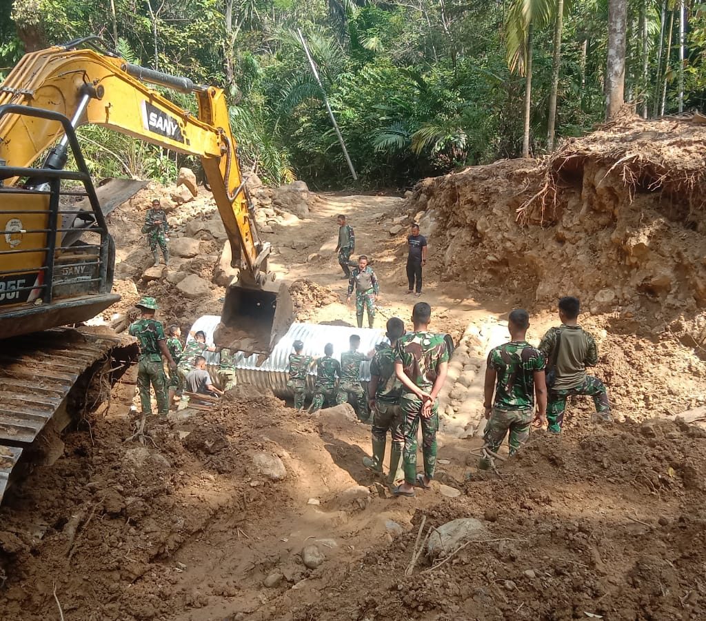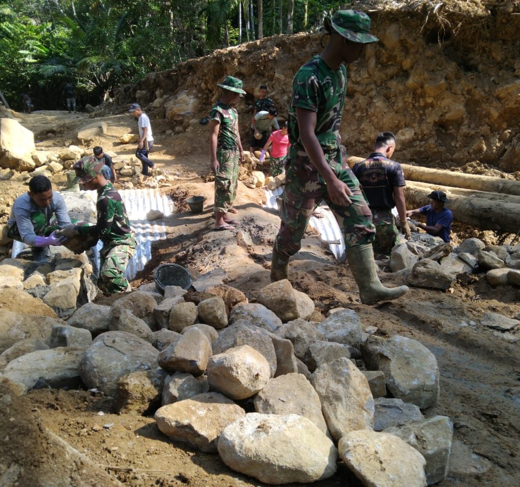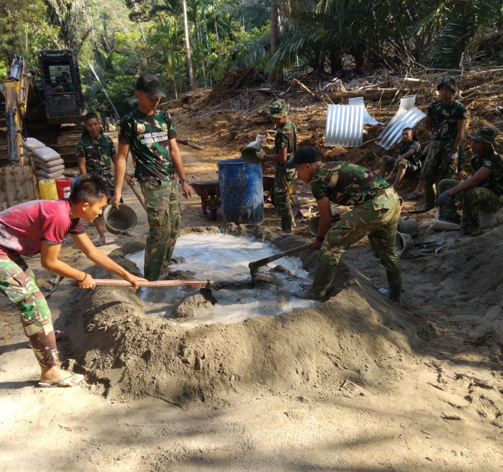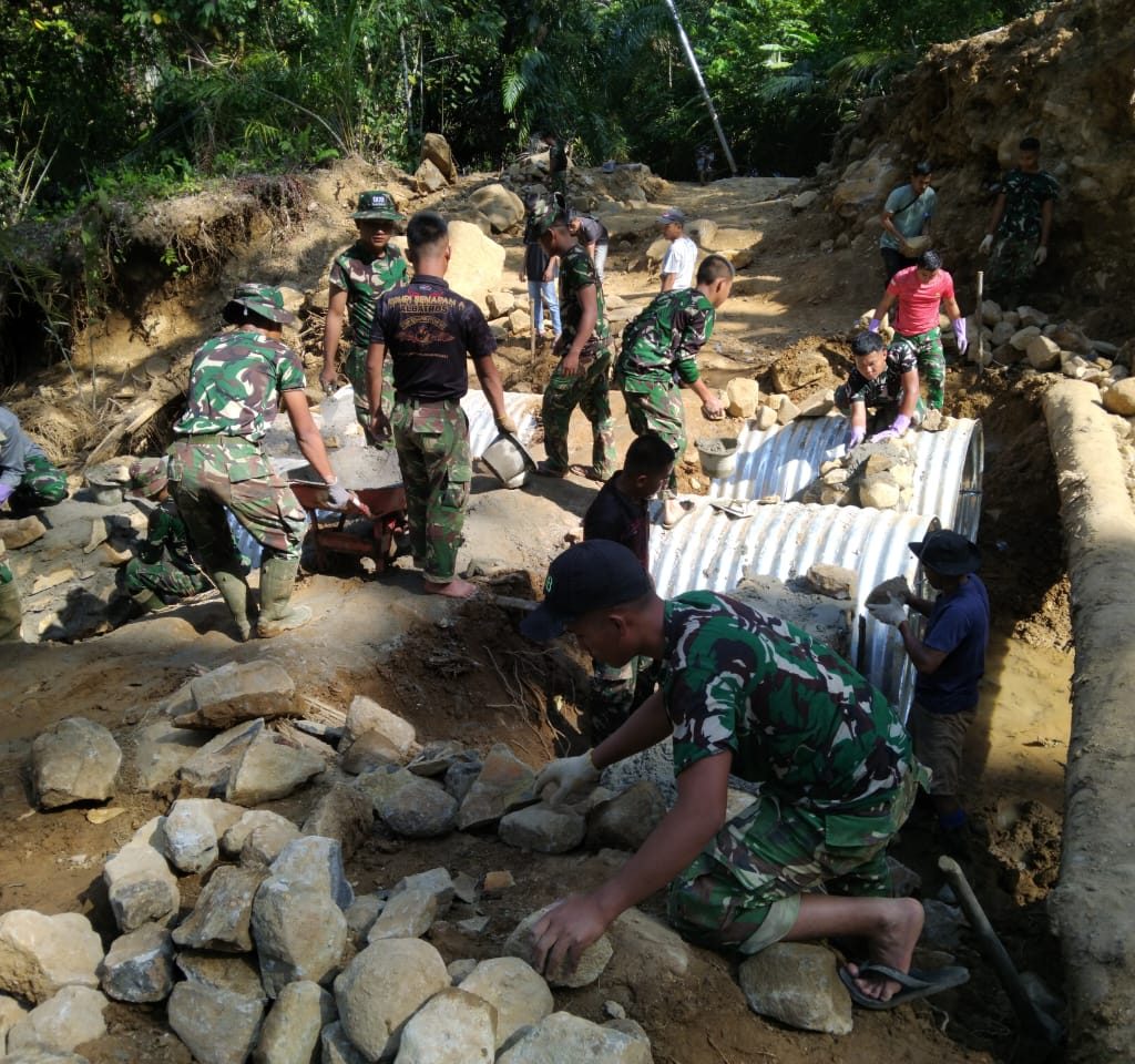 Kegiatan pembangunan melibatkan personel Koramil 04/Pinangsori, Denzibang 4/1 Sibolga, serta Yon TP 908/Gaja Dompak yang bekerja bersama di lapangan untuk memastikan pekerjaan berjalan aman dan sesuai rencana.