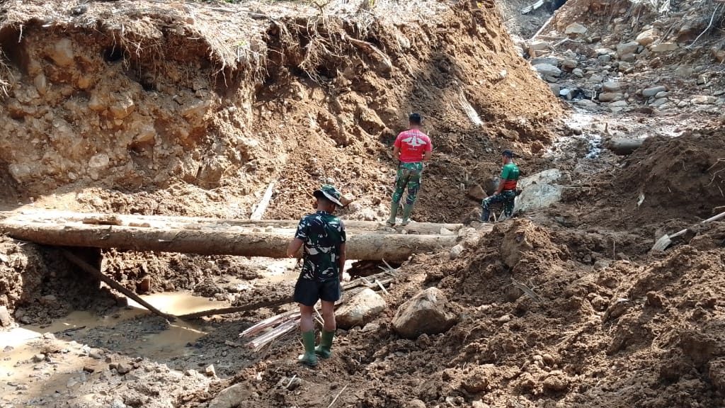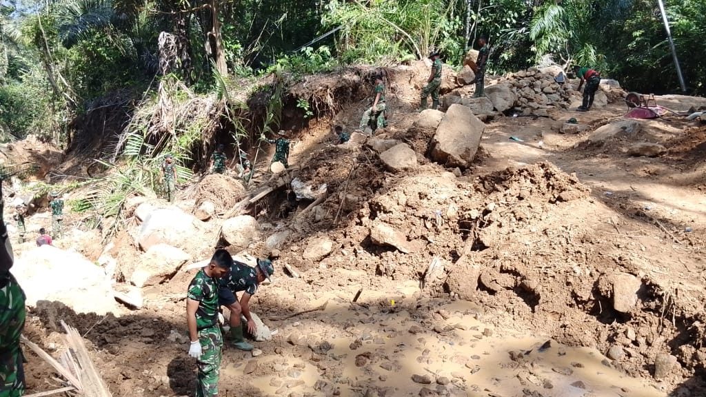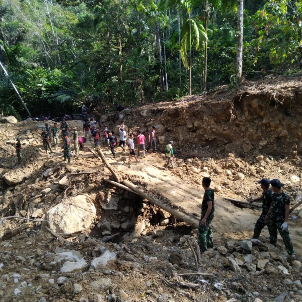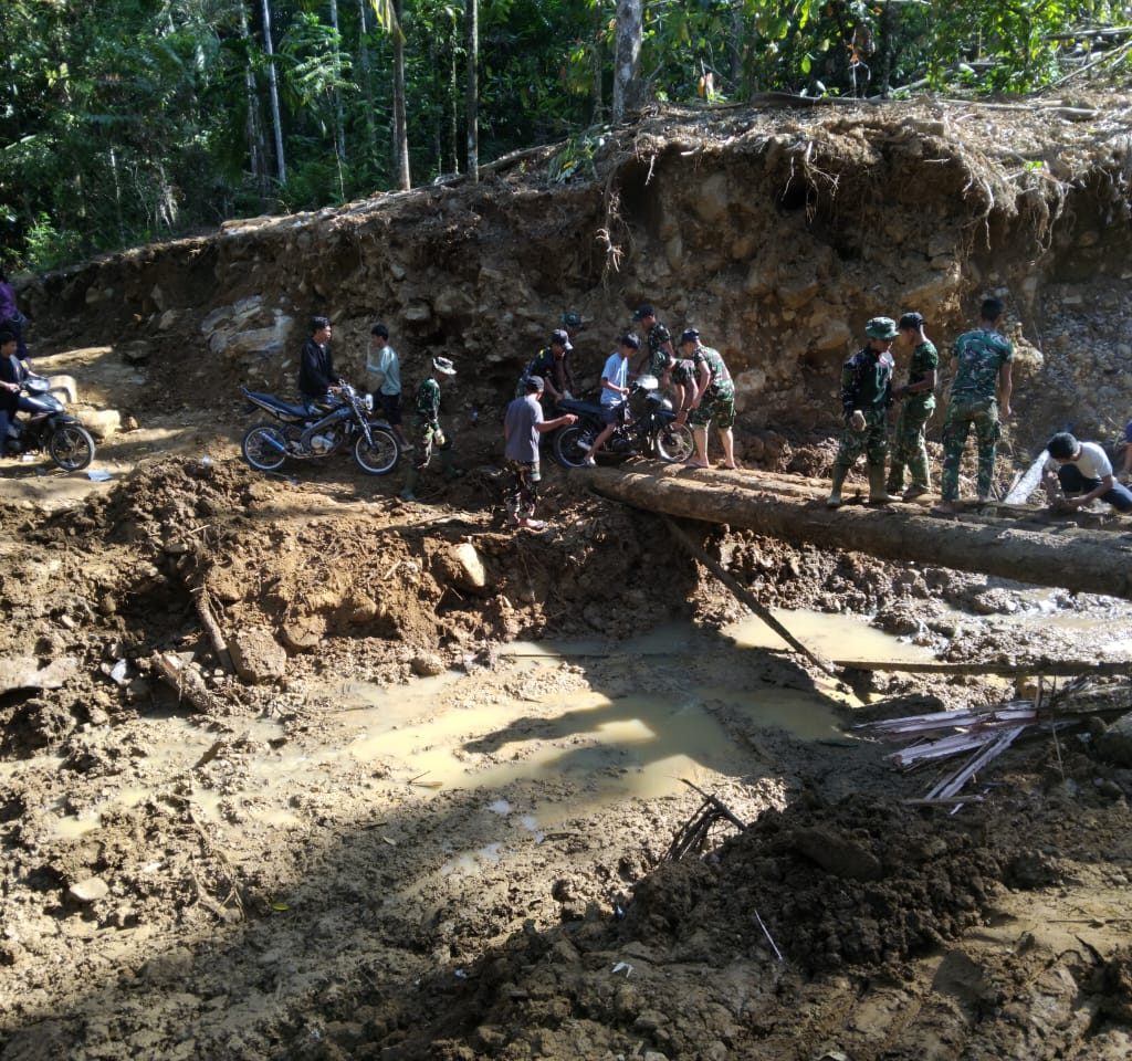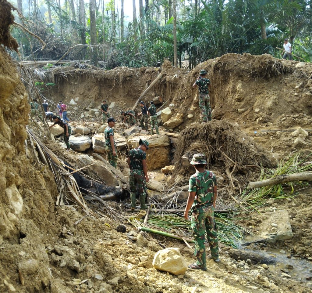 Kegiatan pembangunan melibatkan personel Koramil 04/Pinangsori, Denzibang 4/1 Sibolga, serta Yon TP 908/Gaja Dompak yang bekerja bersama di lapangan untuk memastikan pekerjaan berjalan aman dan sesuai rencana.