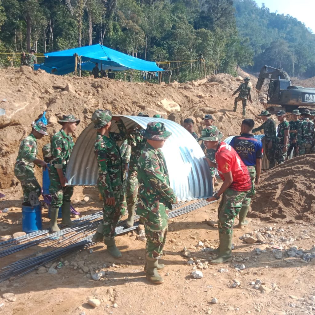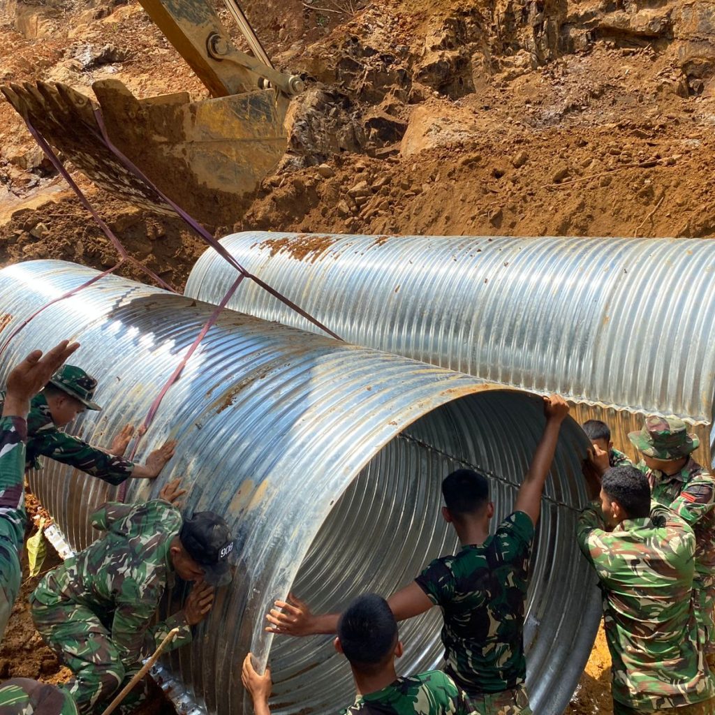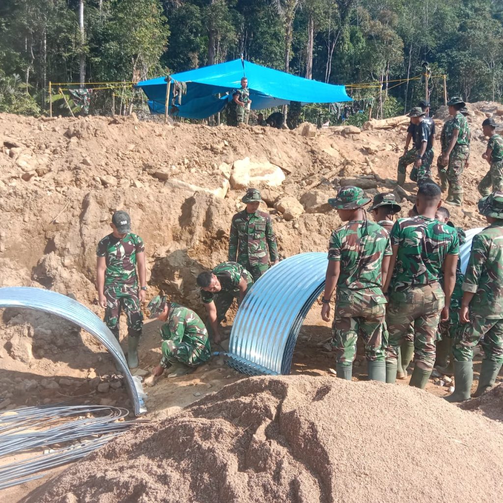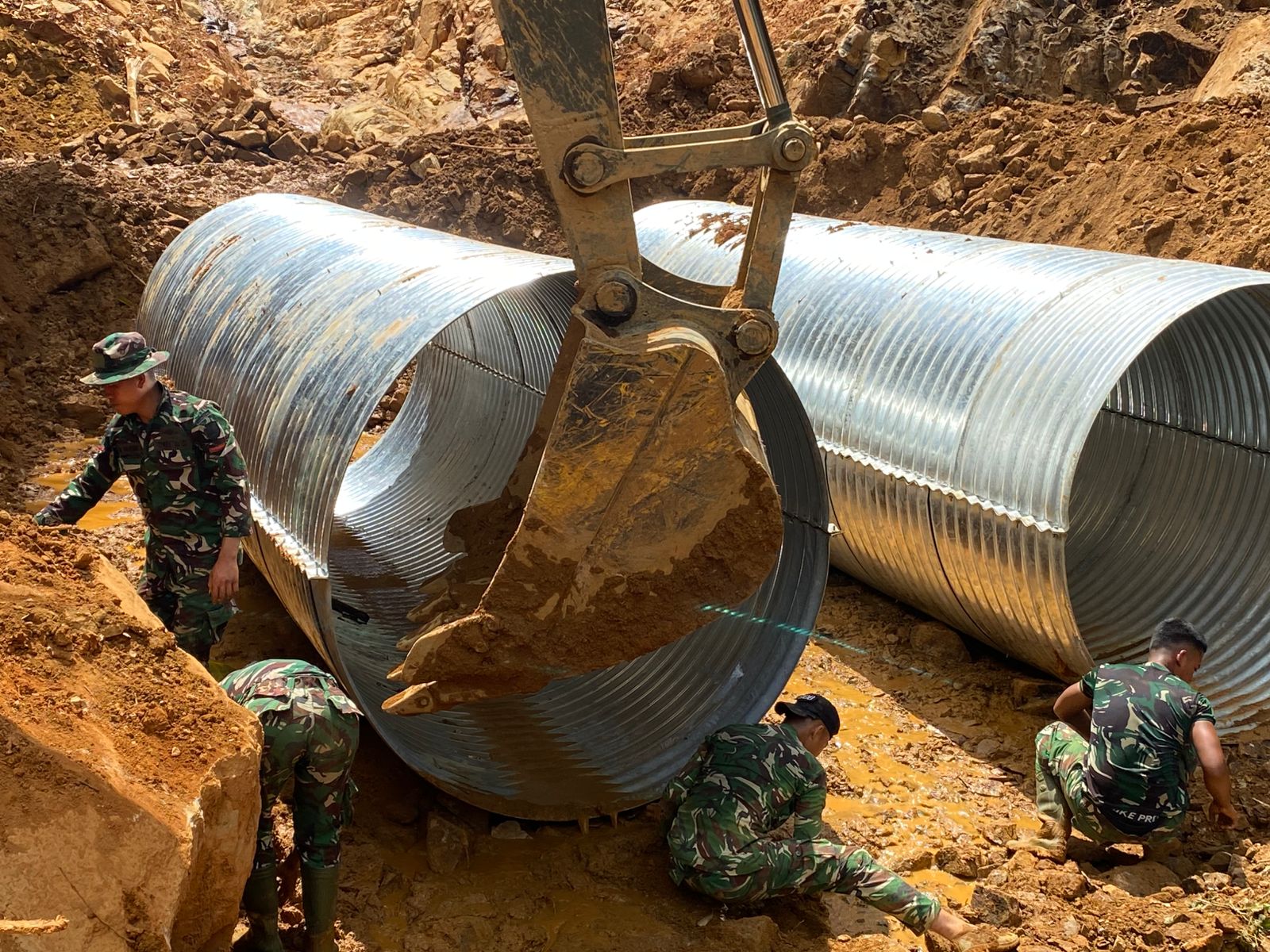 Personel TNI bersama aparat desa serta warga setempat bergotong royong melaksanakan berbagai tahapan pekerjaan, mulai dari perakitan konstruksi jembatan, penggantian plat Armco pada bagian ujung jembatan, hingga penimbunan badan jembatan.