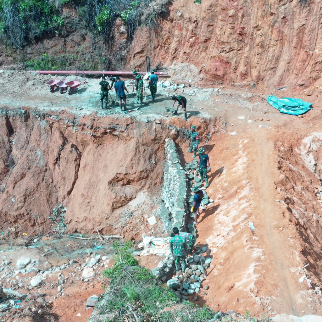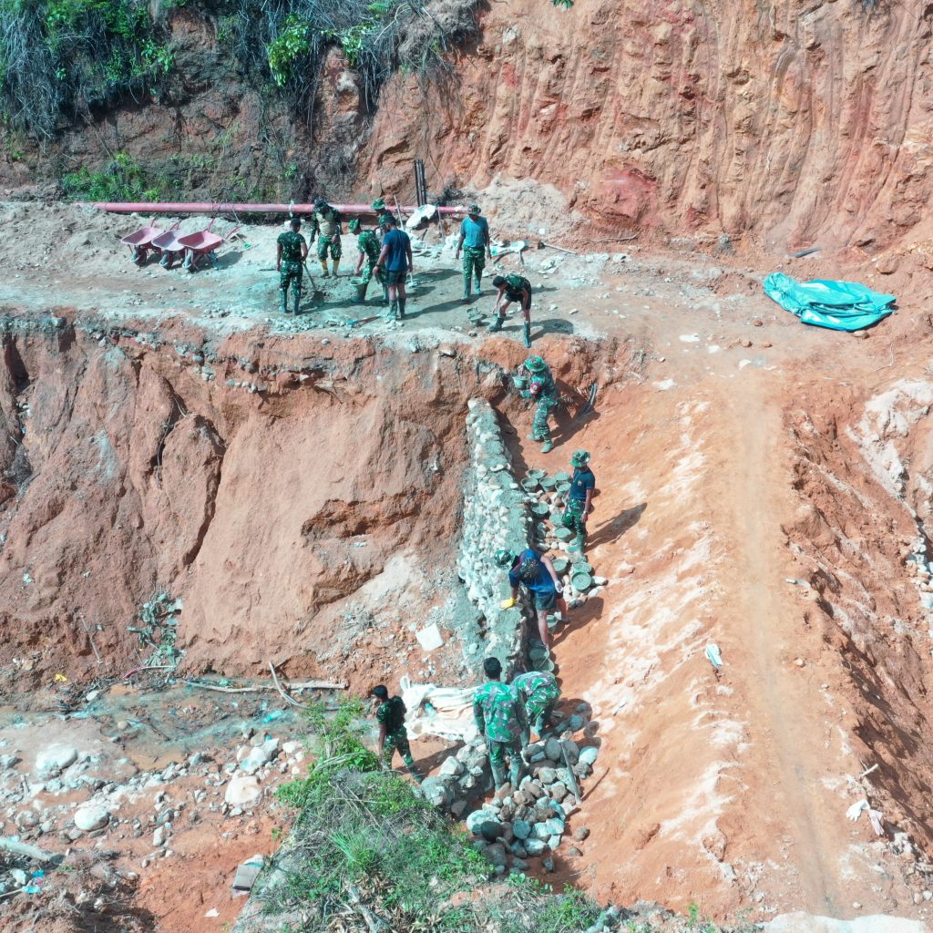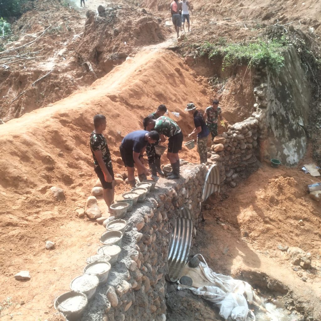 Pekerjaan dilakukan oleh personel Kodim 0211/TT, Denzibang Sibolga, Yon TP 905/TS, dan Dinas PU, meliputi pengumpulan batu sungai untuk bahan material jembatan, pelansiran batu untuk pondasi, pencampuran semen, serta pembuatan talut. Semua aktivitas dilakukan secara bertahap untuk memastikan kualitas konstruksi sesuai standar keselamatan.