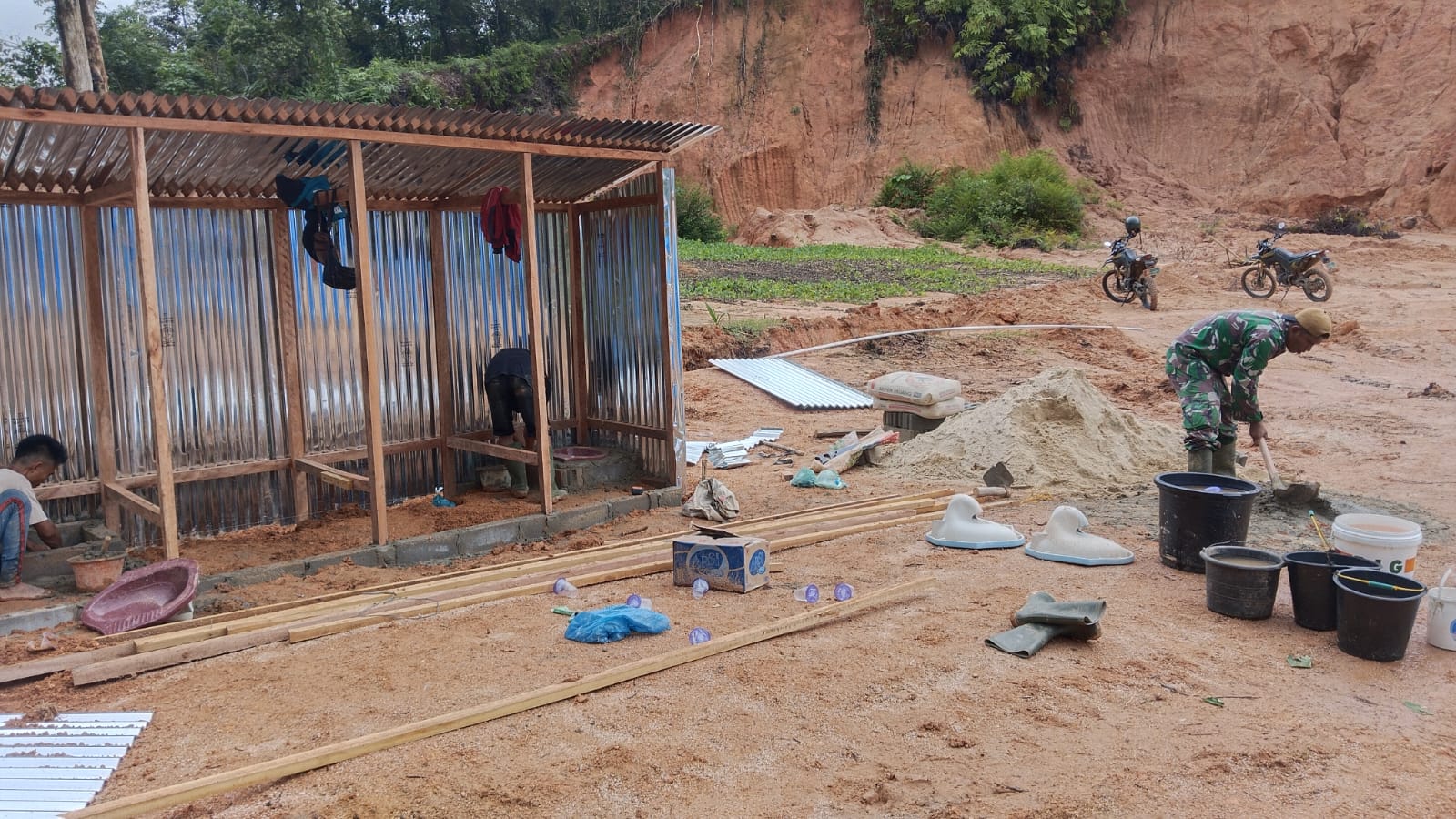 Pembangunan MCK dilaksanakan oleh personel Satgas Gulbencal Kodam I/BB bersama Koramil 03/Pandan jajaran Kodim 0211/Tapanuli Tengah, sebagai wujud sinergi dan respons cepat TNI dalam menjawab kebutuhan sarana sanitasi yang layak di pengungsian.