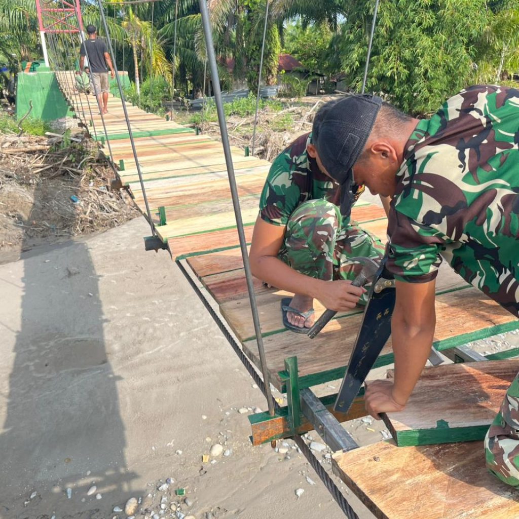 Pekerjaan tersebut dilaksanakan oleh personel gabungan yang terdiri dari prajurit Koramil 01/Barus, Yon TP 905/TS, dan Yonif 125/SMB yang tergabung dalam Satgas Gulbencal Kodam I/BB. Dalam proses pengerjaan, personel memanfaatkan berbagai peralatan seperti singso, bor, palu, gerinda, serta pahat kayu untuk mendukung pemasangan material pada bagian jembatan.