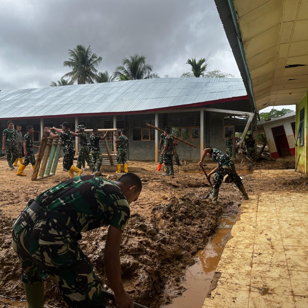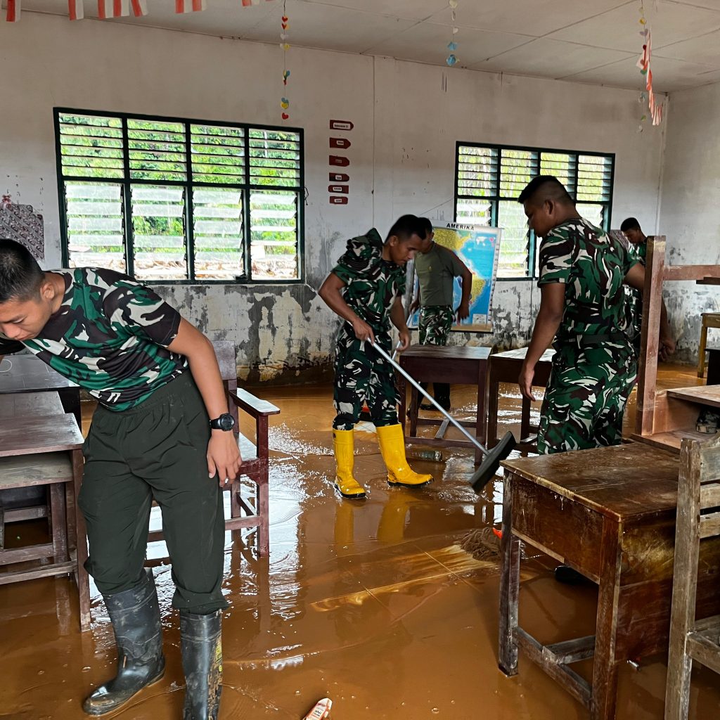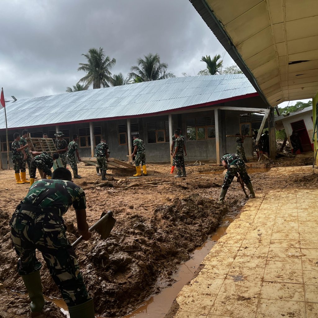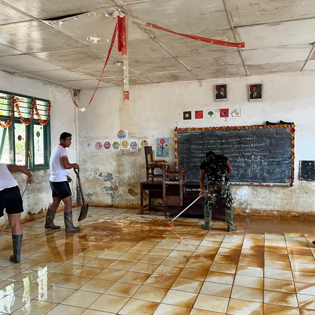 Pembersihan dilaksanakan secara gotong royong dengan melibatkan Babinsa Koramil 03/Pandan, personel Yon TP 905/TS, serta pihak sekolah yang dipimpin langsung oleh kepala sekolah. Sinergi tersebut menjadi wujud kepedulian bersama dalam mempercepat pemulihan sarana pendidikan pascabencana.