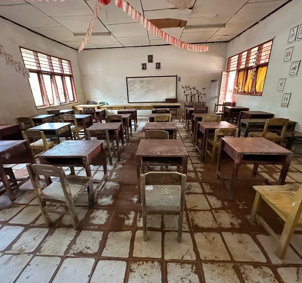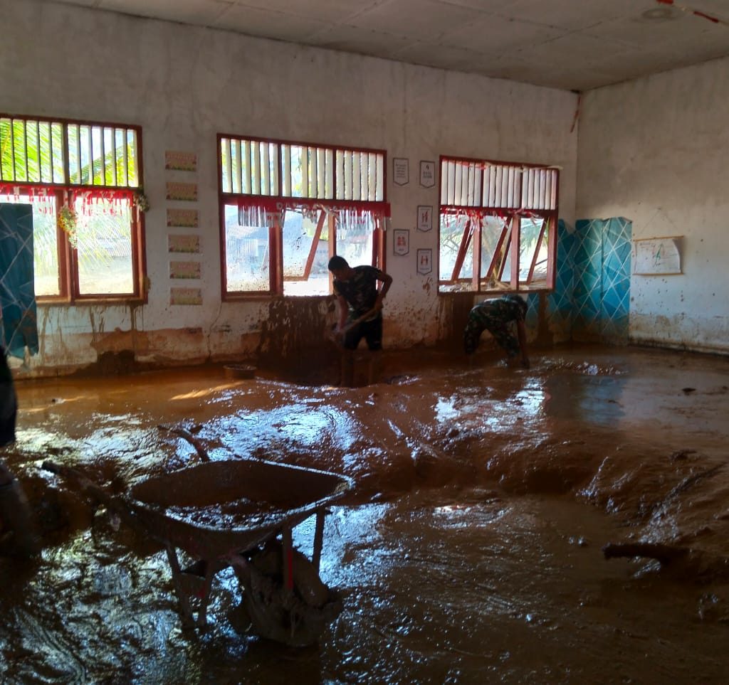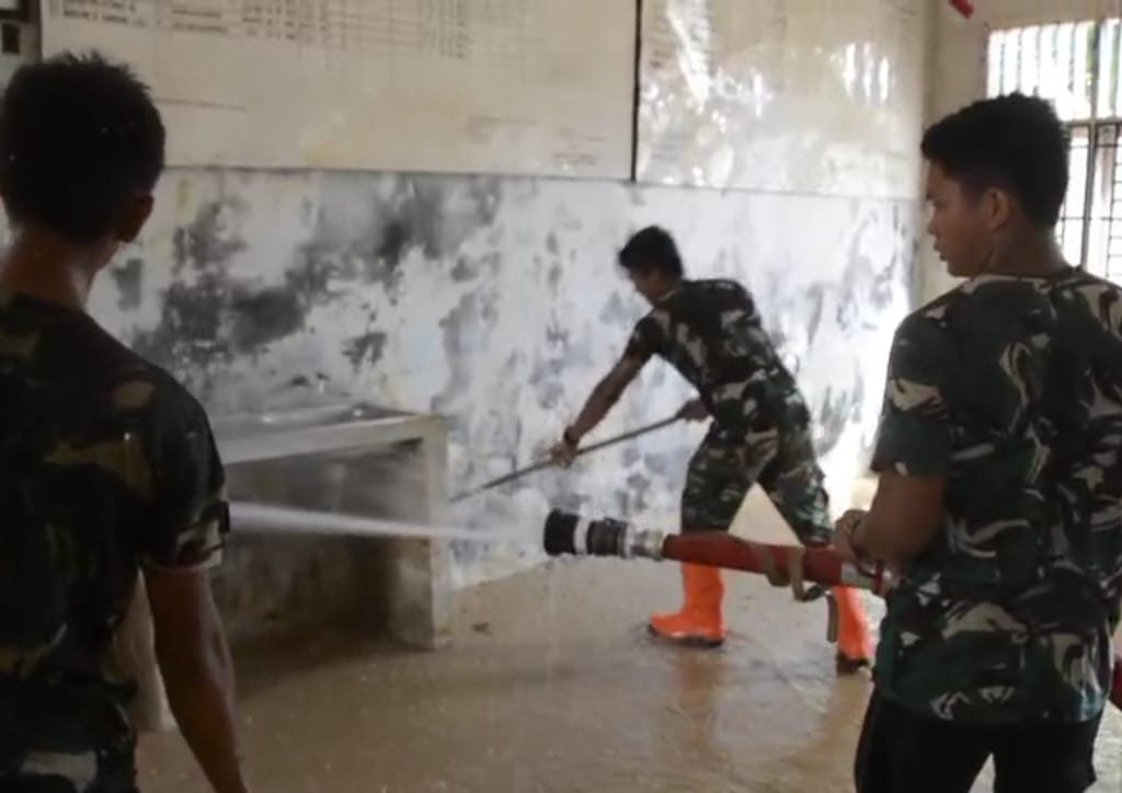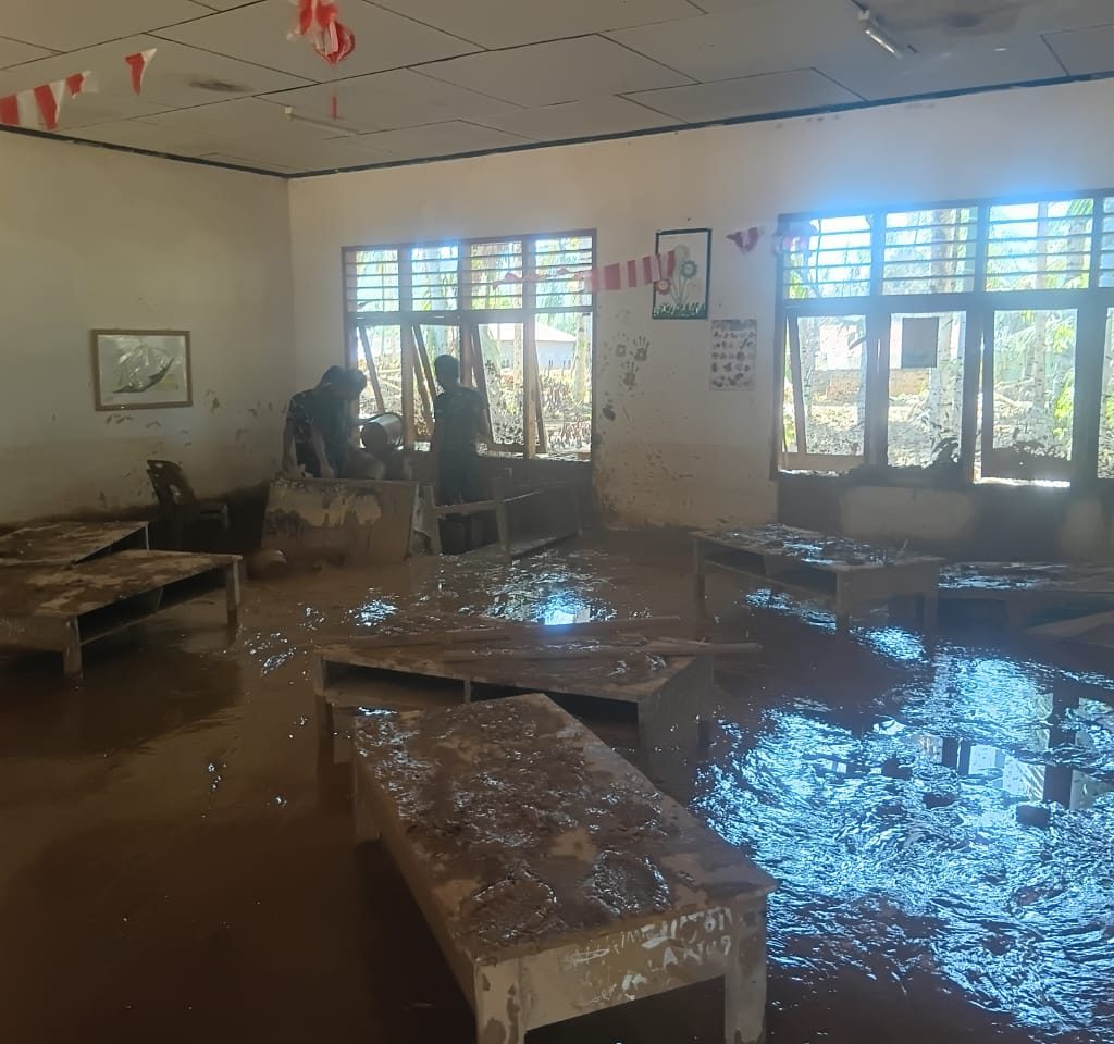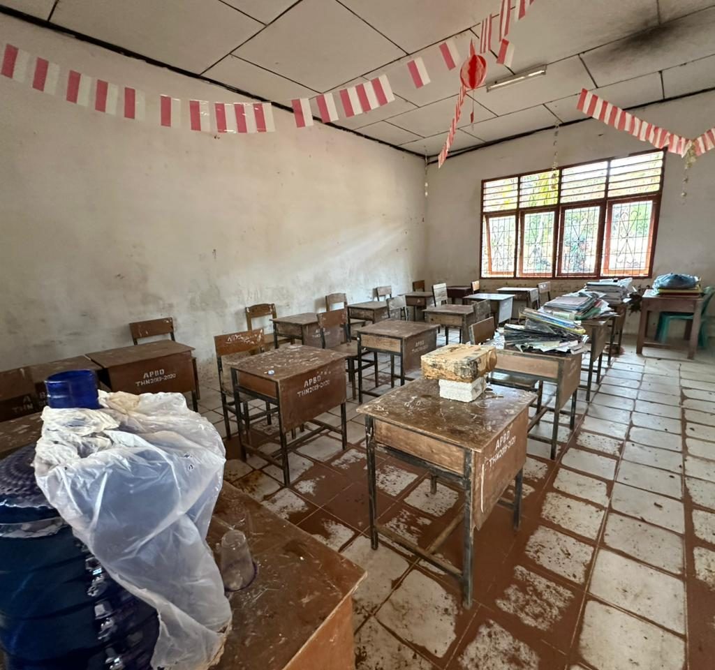 Fokus pembersihan meliputi lumpur di dalam dan depan ruang kelas, penyusunan meja kursi, pembuatan dinding pembatas teras, serta penyemprotan dinding dan lantai agar lingkungan sekolah kembali bersih dan layak digunakan.
