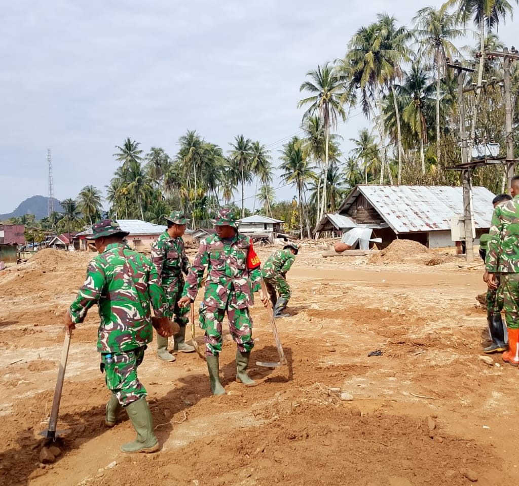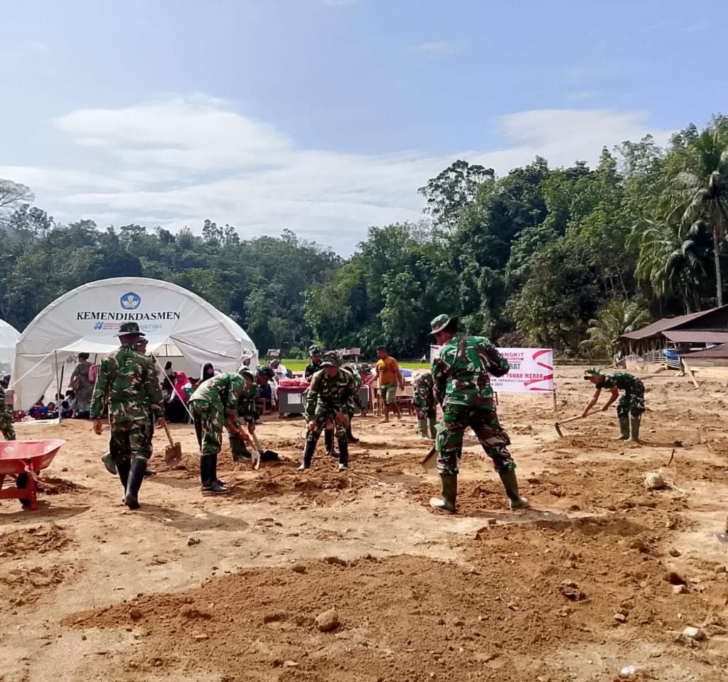 Tapanuli Tengah – Satgas Kodim 0211/Tapanuli Tengah (TT) melaksanakan kegiatan pembersihan sekolah darurat di kawasan Tanah Merah, Kecamatan Tukka, Kabupaten Tapanuli Tengah (Tapteng), Rabu (7/1/2026). Kegiatan ini dilakukan sebagai bagian dari upaya TNI membantu percepatan pemulihan fasilitas umum pascabanjir, khususnya sarana pendidikan bagi warga terdampak.