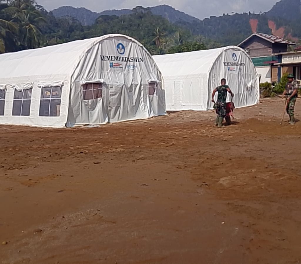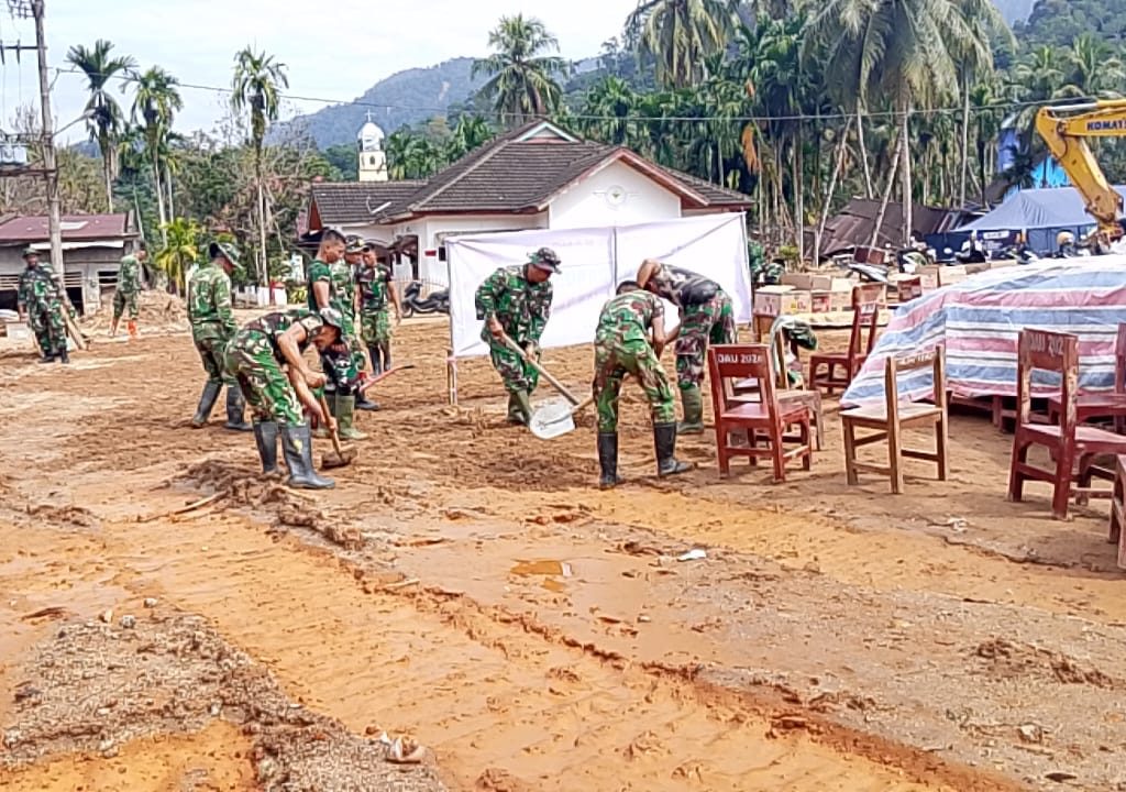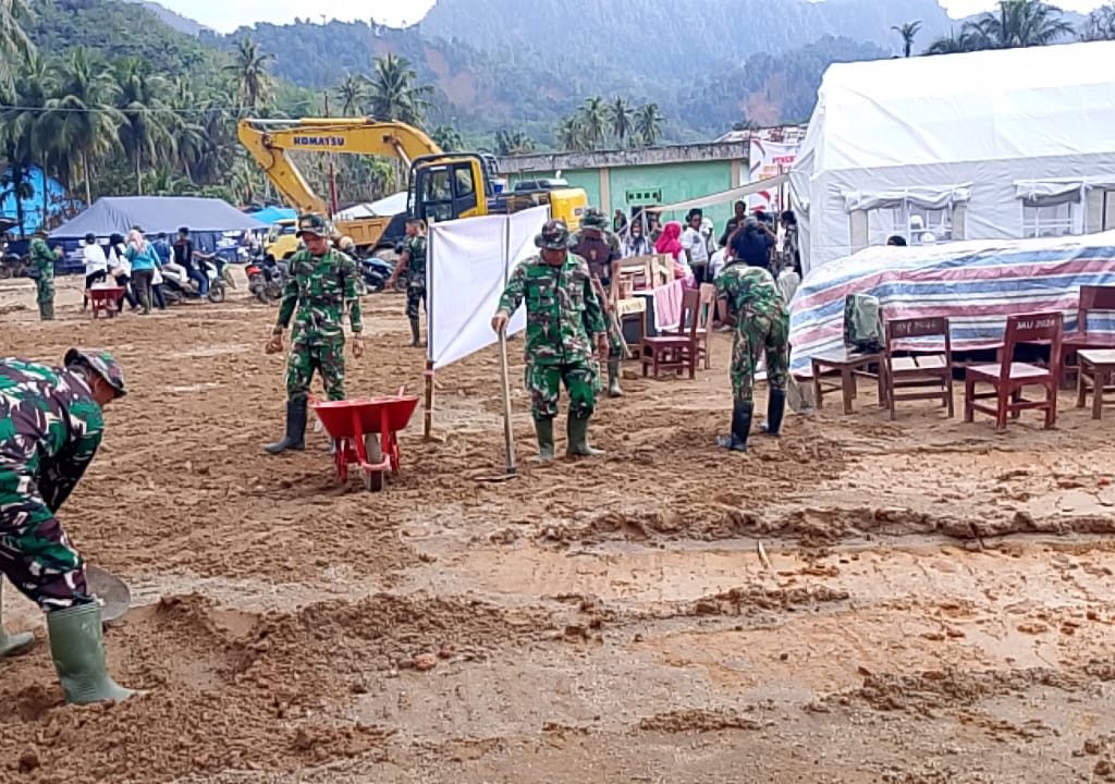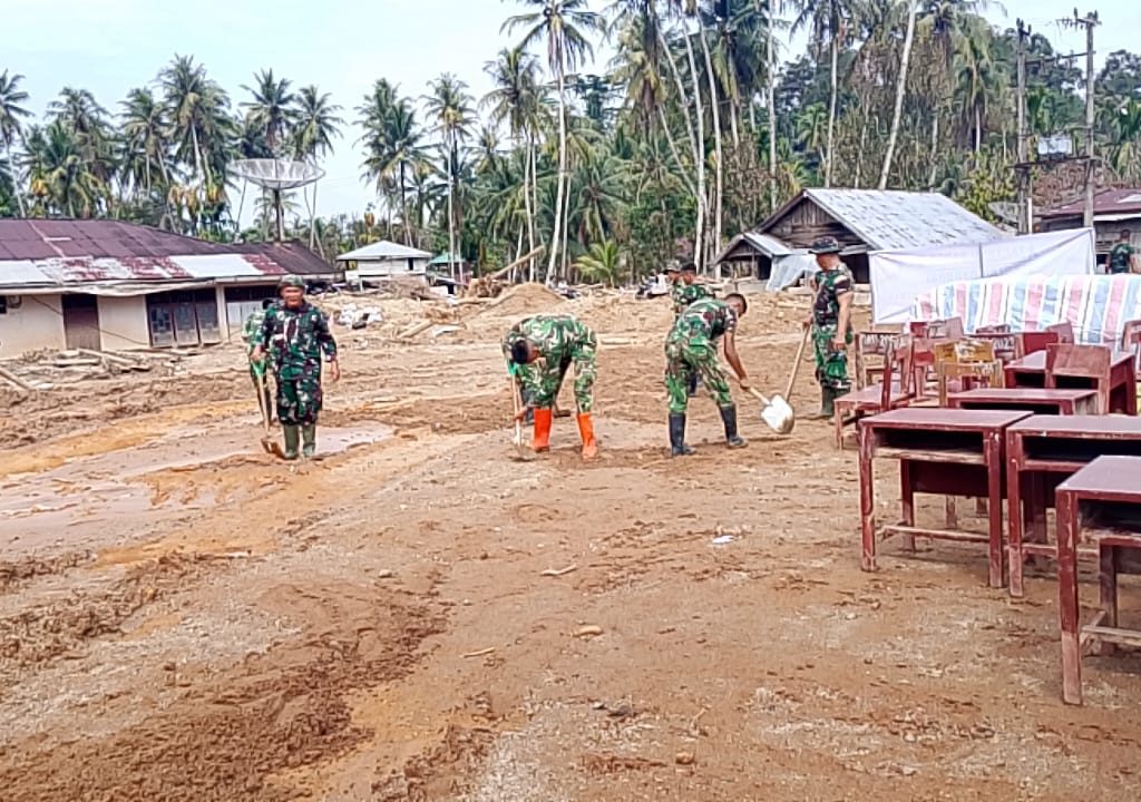 Satgas Kodim 0211/TT Sigap Bersihkan Sekolah Darurat Terdampak Banjir di Tukka, Tapteng