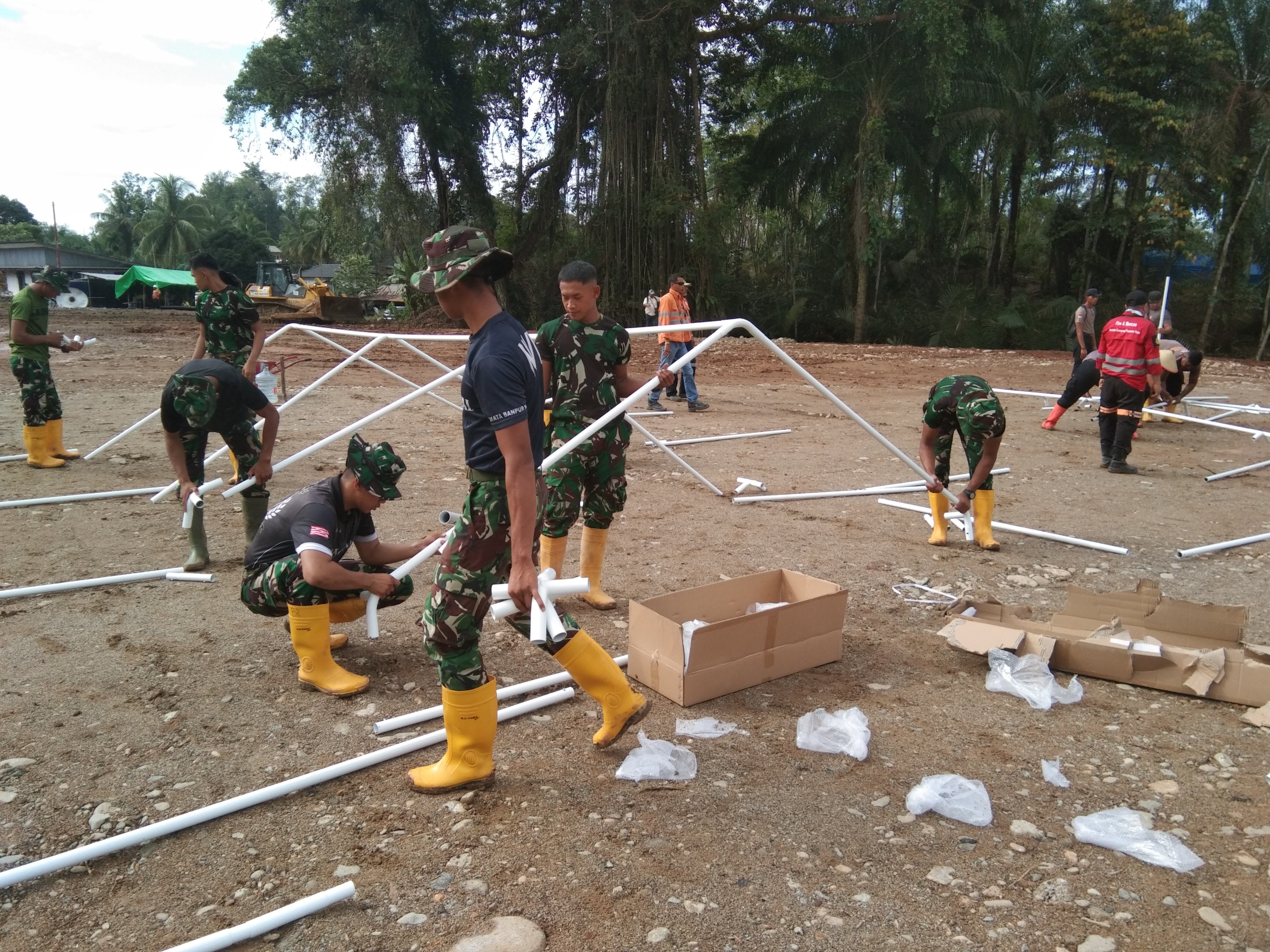 Tapanuli selatan – Satgas Kodim 0212/Tapanuli Selatan melalui Koramil 01/Batang Toru membantu pemasangan tenda hunian sementara (huntara) bagi warga terdampak bencana banjir dan tanah longsor di Desa Batu Hula, Kecamatan Batang Toru, Kabupaten Tapanuli Selatan, Kamis (8/1/2026). Huntara tersebut disiapkan untuk menampung warga yang rumahnya rusak atau tidak lagi layak huni akibat bencana alam.