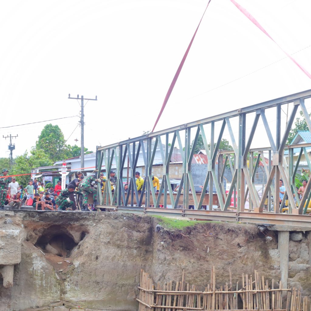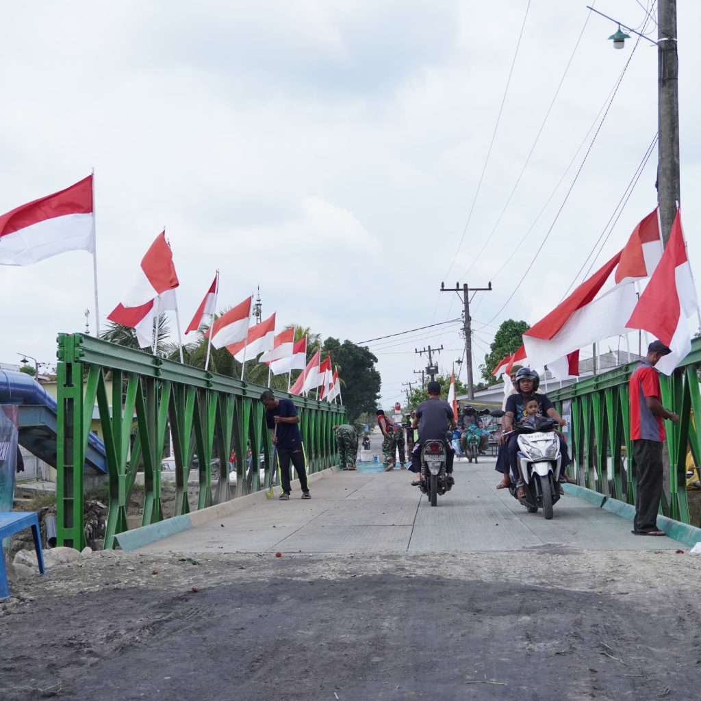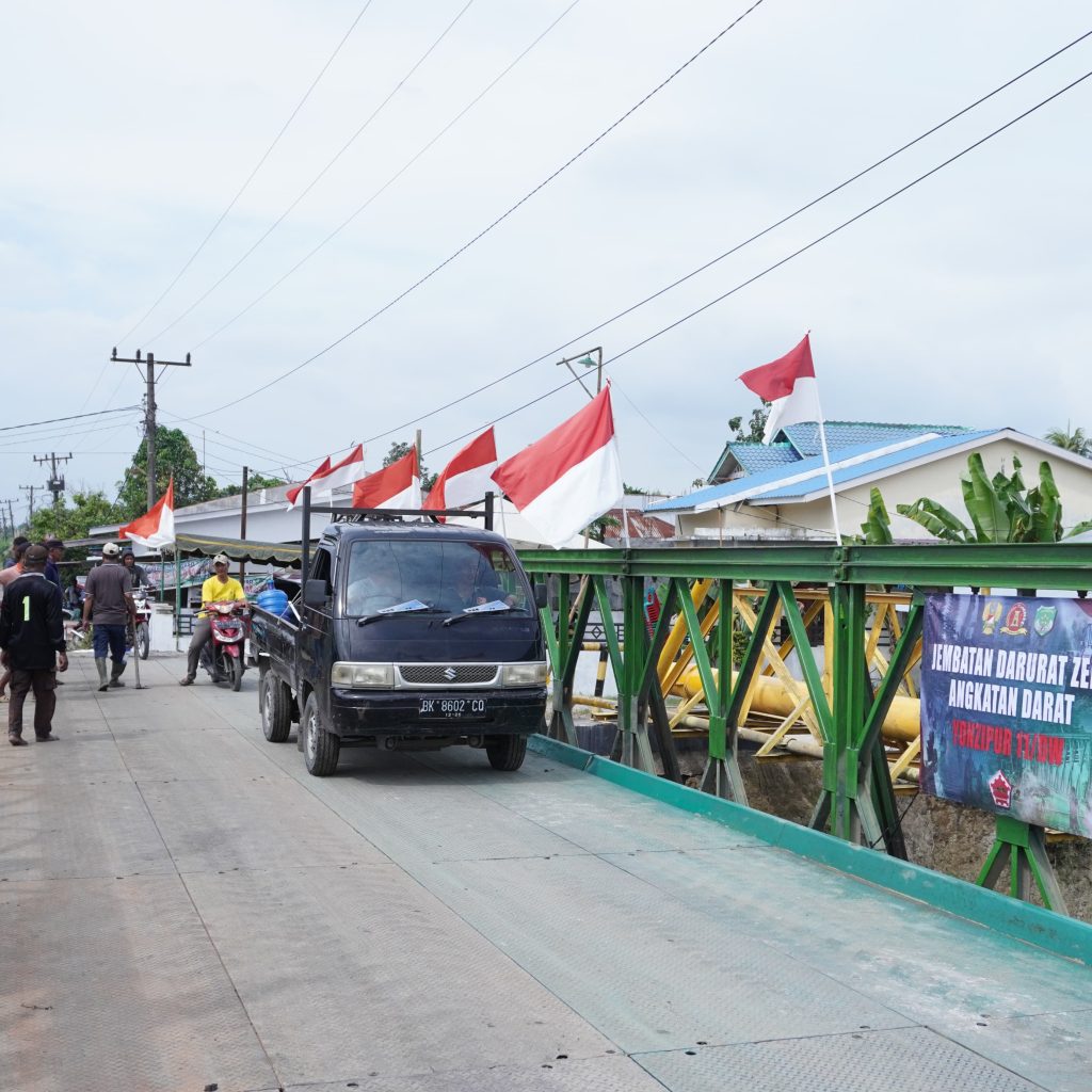 Deli Serdang – Satgas Yon Zipur 11/DW bersama Dinas Pekerjaan Umum (PU) menyelesaikan pembangunan Jembatan Super Compact 200 tipe 1-1 di atas Sungai Aran Dalu, Dusun 20 Blok 2, Desa Paya Bakung, Kecamatan Hamparan Perak, Kabupaten Deli Serdang, Sumatera Utara. Hingga Minggu (21/12/2025), pembangunan jembatan sepanjang 10 petak tersebut telah rampung 100 persen.