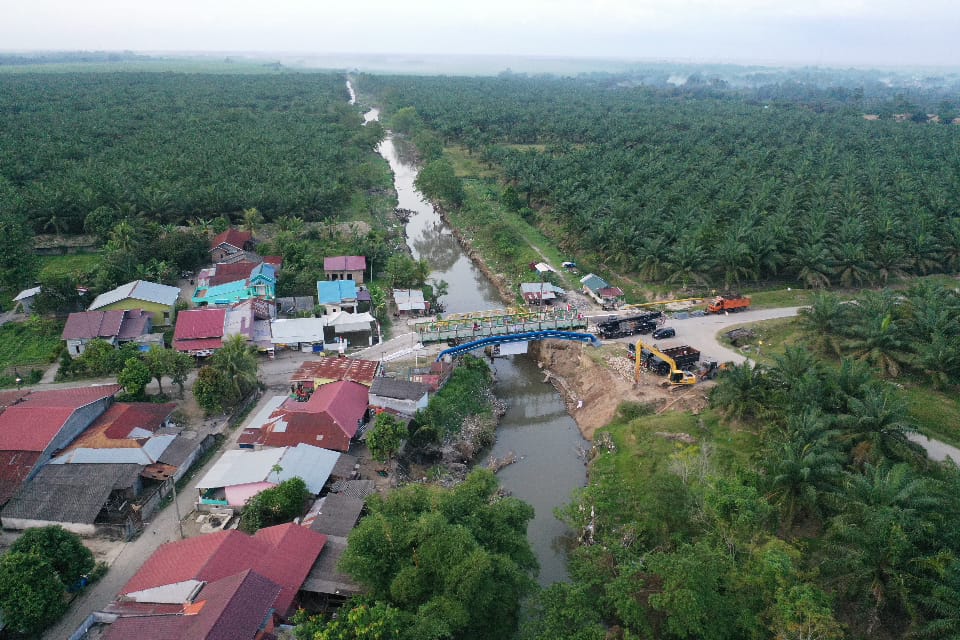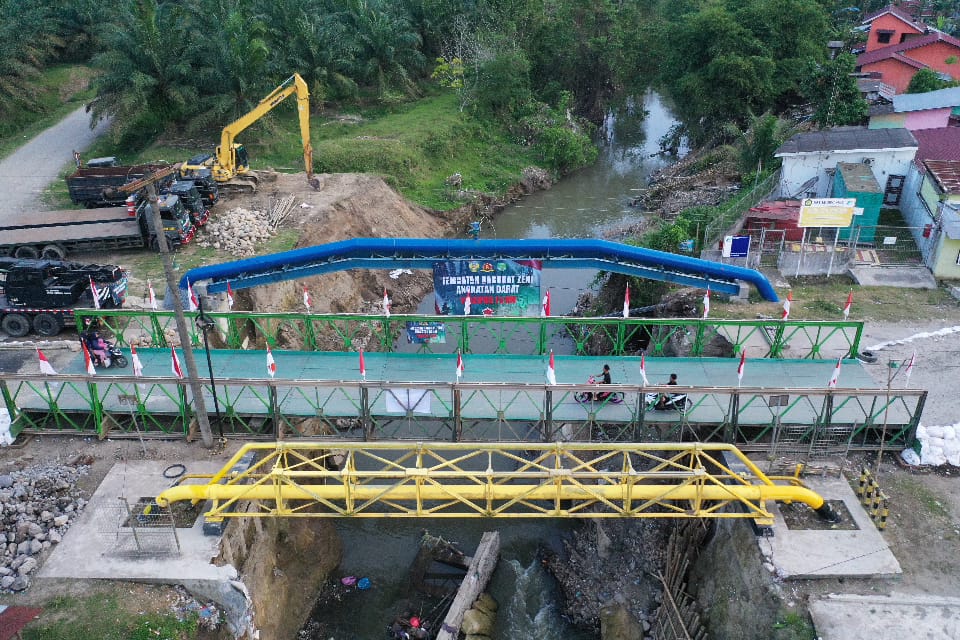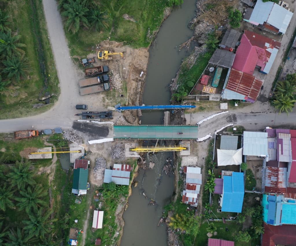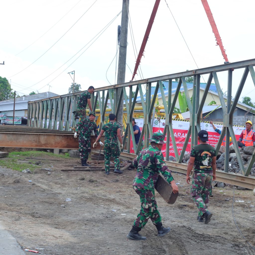 Deli Serdang – Satgas Yon Zipur 11/DW bersama Dinas Pekerjaan Umum (PU) menyelesaikan pembangunan Jembatan Super Compact 200 tipe 1-1 di atas Sungai Aran Dalu, Dusun 20 Blok 2, Desa Paya Bakung, Kecamatan Hamparan Perak, Kabupaten Deli Serdang, Sumatera Utara. Hingga Minggu (21/12/2025), pembangunan jembatan sepanjang 10 petak tersebut telah rampung 100 persen.
