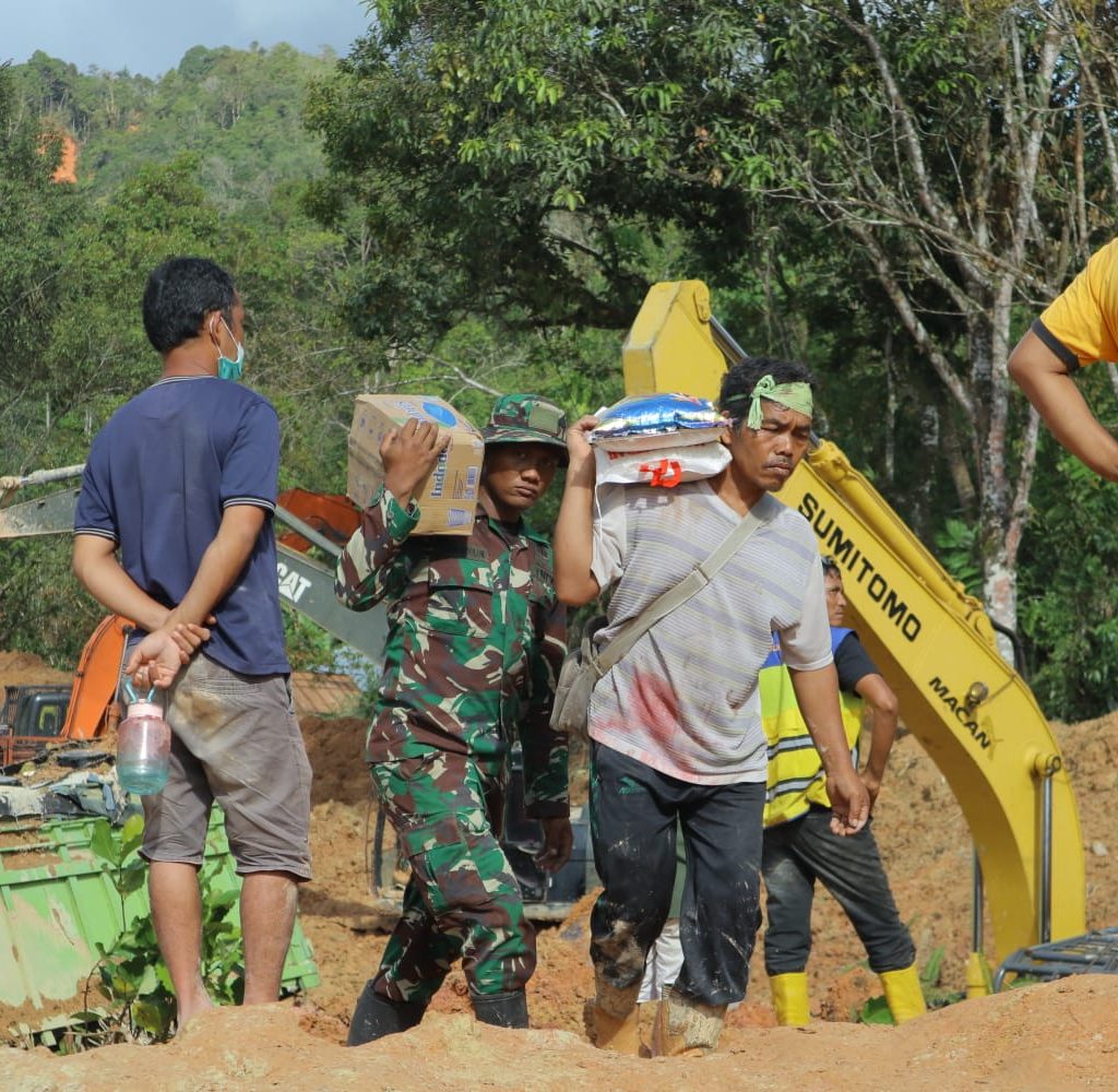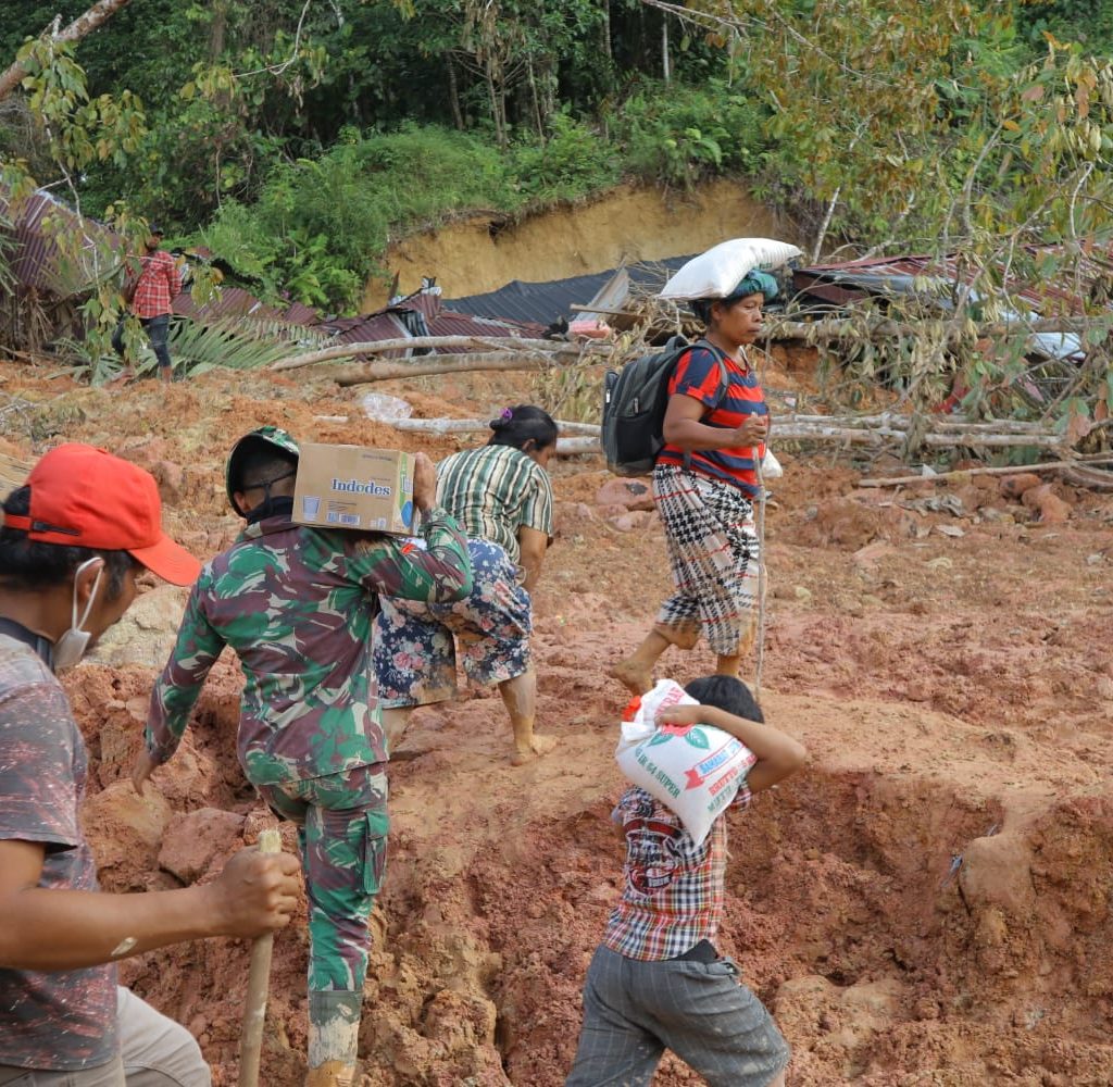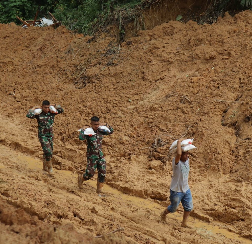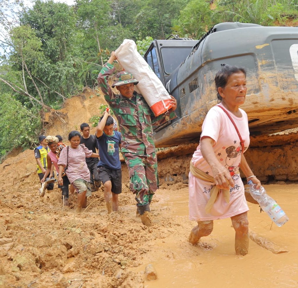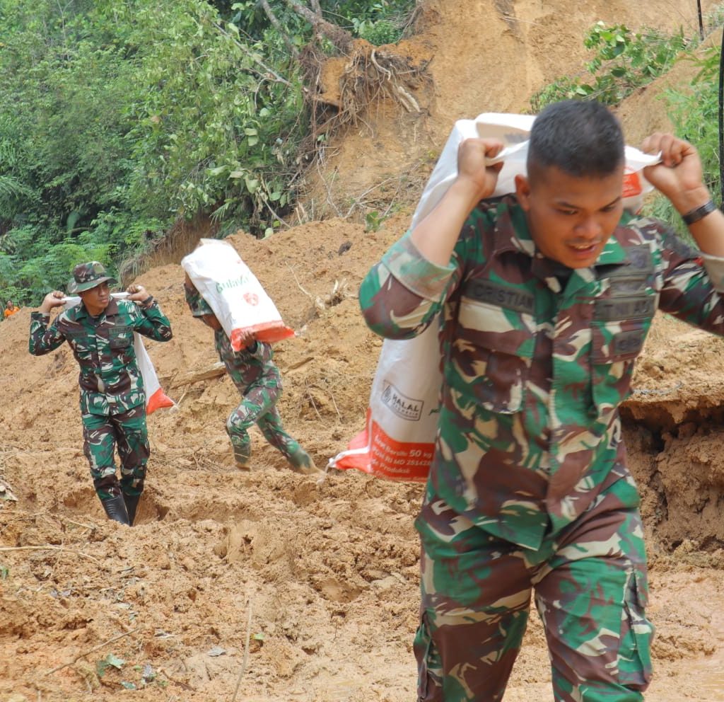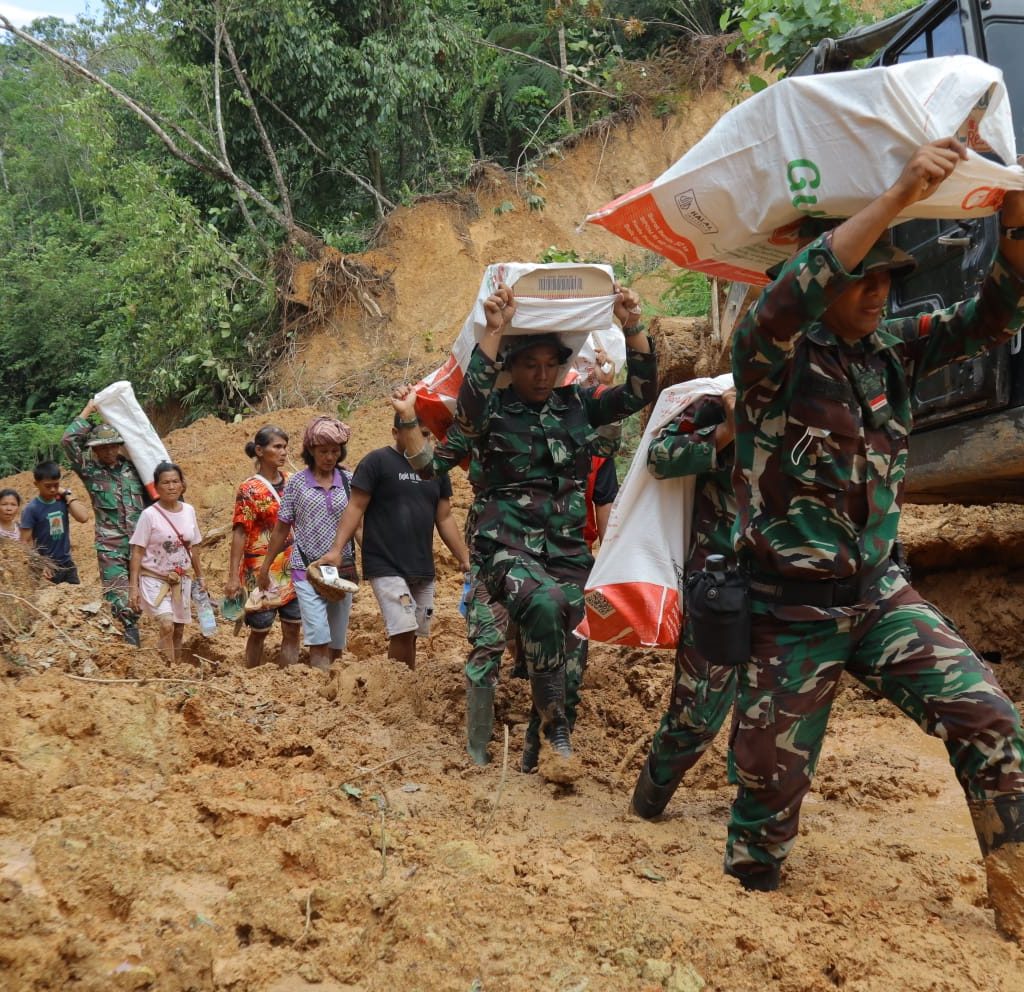 Tapanuli Tengah – Satgas Yonif 122/Tombak Sakti (TS) Kodam I/BB menyalurkan bantuan logistik dengan berjalan kaki ke desa-desa yang terisolir akibat bencana alam di Kecamatan Sitahuis, Kabupaten Tapanuli Tengah, Selasa (2/12/2025). Pendorongan dilakukan karena akses kendaraan menuju Desa Mompang, Desa Mardame, dan Desa Naga Timbul masih terputus total.