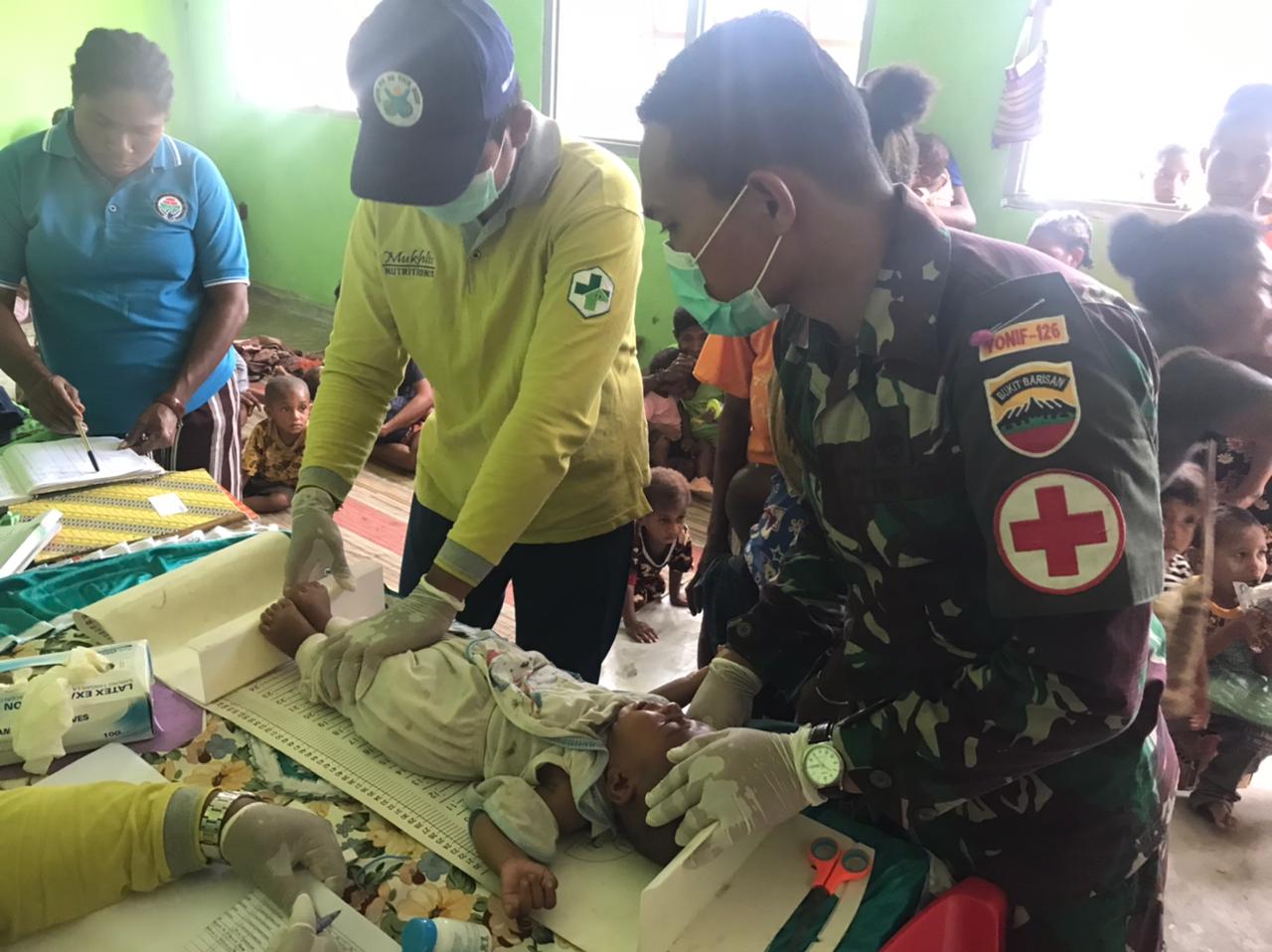 Keerom, Prajurit Satgas Pamtas RI-PNG, Yonif 126/Kala Cakti Pos Waris bantu para Tenaga Kesehatan (Nakes) Puskesmas Model dalam kegiatan bakti kesehatan Pos Pelayanan Terpadu (Posyandu) dalam rangka meningkatkan dan memeratakan pelayanan kesehatan Balita di Kampung Banda, Distrik Waris, Kabupaten Keerom.
