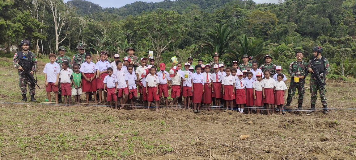 Keerom. Personel Satgas Yonif 126/KC mengajak masyarakat di Perbatasan Papua untuk memanfaatkan lahan sekaligus memberikan edukasi tentang Pertanian kepada murid-murid Sekolah Dasar YPPK Akarinda, Distrik Web, Kabupaten Keroom.