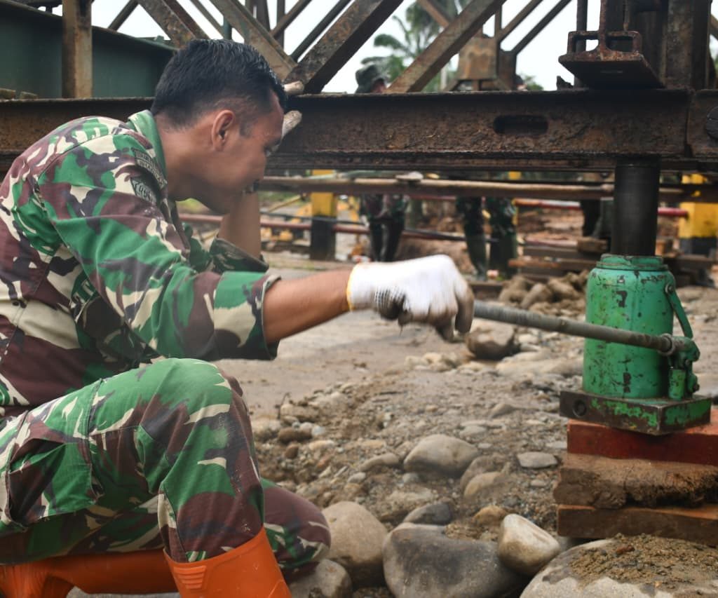 Tapanuli Selatan – Satgas Yonzipur I/DD terus mengerjakan pemasangan jembatan Bailey di Desa Garoga, yang menjadi penghubung antara Kabupaten Tapanuli Tengah (Tapteng) dan Tapanuli Selatan (Tapsel), Senin (8/12/2025). Jembatan ini dipasang untuk menggantikan akses utama yang terputus akibat bencana beberapa waktu lalu.