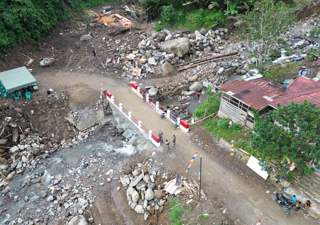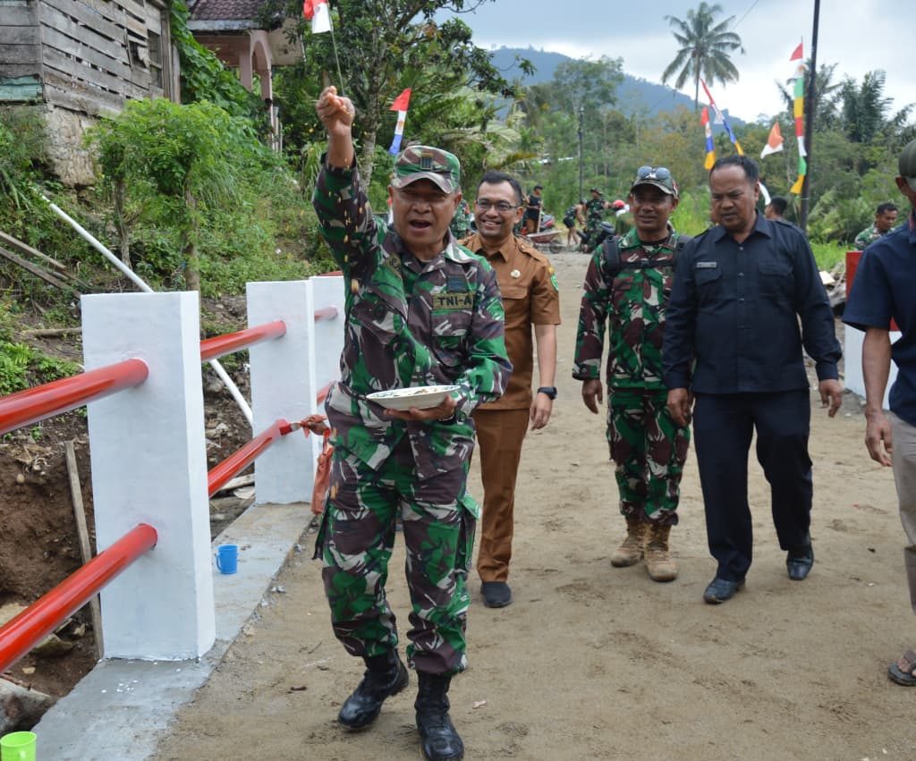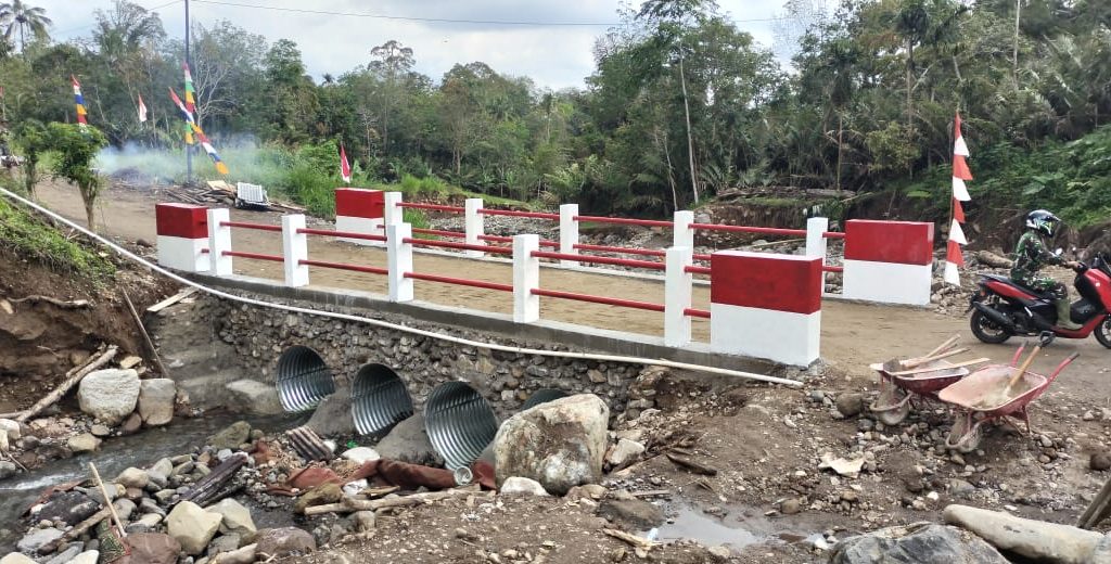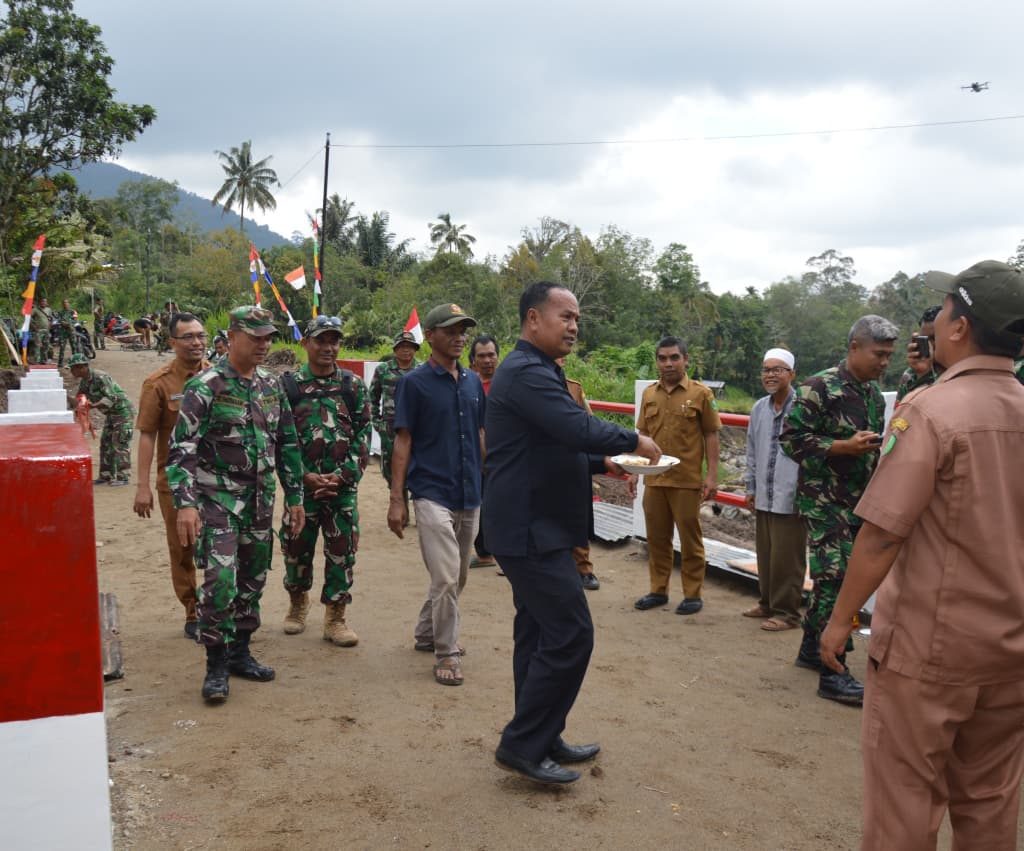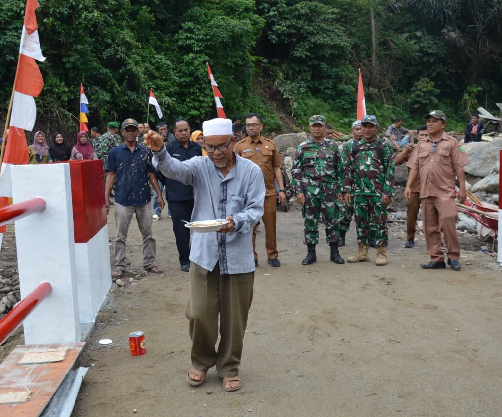 Padangsidimpuan – Satgas Yonzipur I/DD bersama Zidam I/Bukit Barisan dan personel Kodim 0212/Tapanuli Selatan merampungkan pembangunan Jembatan Aramco Aek Sibontor Lubuk Raya di Lingkungan IV, Kelurahan Lubuk Raya, Kecamatan Padangsidimpuan Hutaimbaru, Kota Padangsidimpuan, Senin (12/1/2026). Rampungnya pembangunan jembatan tersebut ditandai dengan pelaksanaan acara selamatan yang digelar oleh masyarakat setempat sebagai ungkapan rasa syukur.