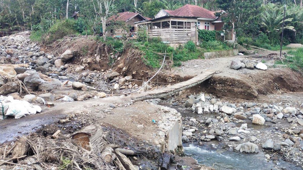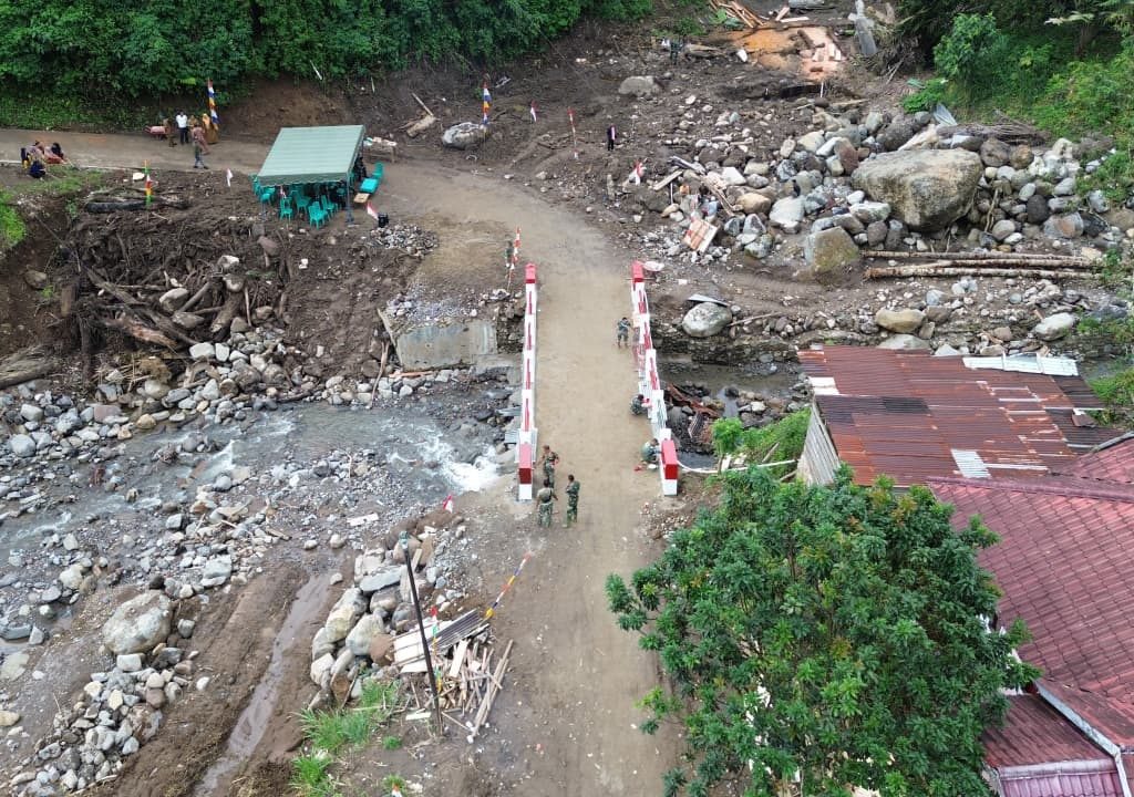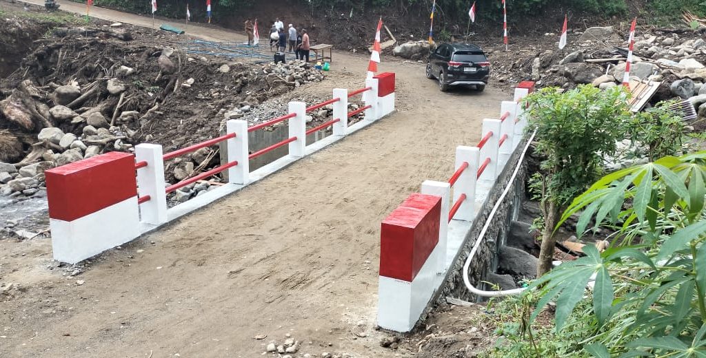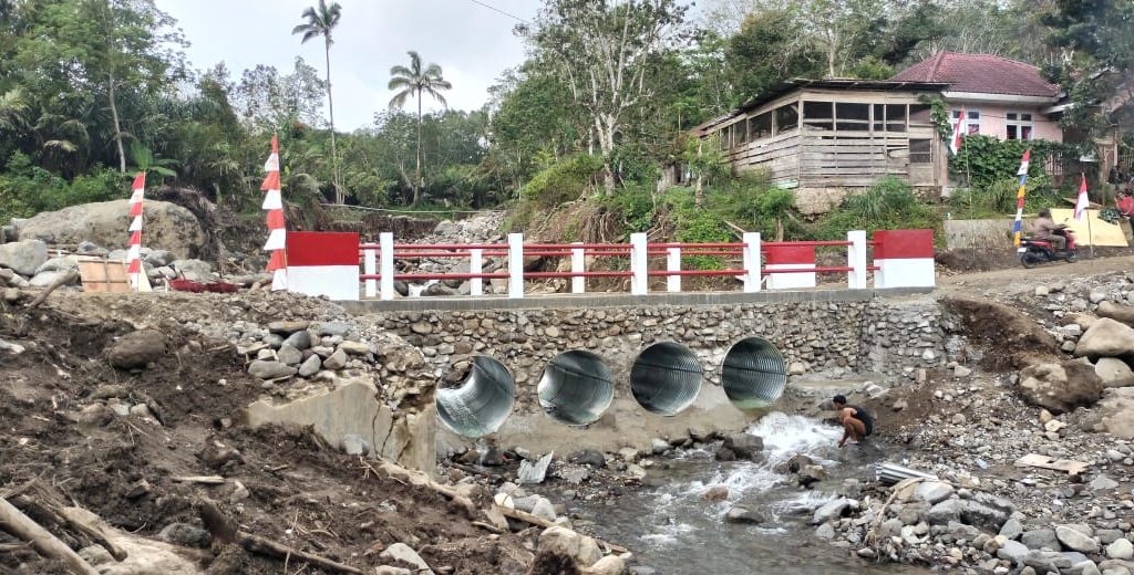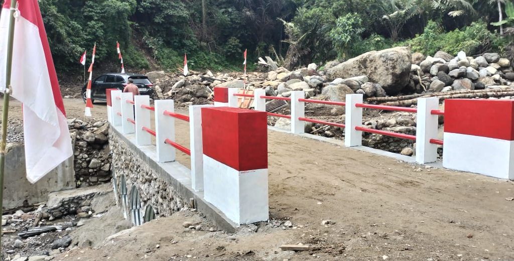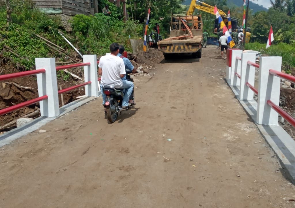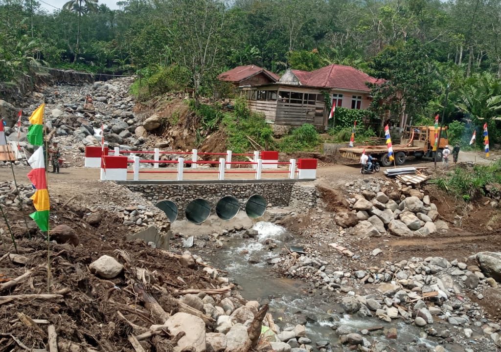 Padangsidimpuan – Satgas Yonzipur I/DD bersama Zidam I/Bukit Barisan dan personel Kodim 0212/Tapanuli Selatan merampungkan pembangunan Jembatan Aramco Aek Sibontor Lubuk Raya di Lingkungan IV, Kelurahan Lubuk Raya, Kecamatan Padangsidimpuan Hutaimbaru, Kota Padangsidimpuan, Senin (12/1/2026). Rampungnya pembangunan jembatan tersebut ditandai dengan pelaksanaan acara selamatan yang digelar oleh masyarakat setempat sebagai ungkapan rasa syukur.