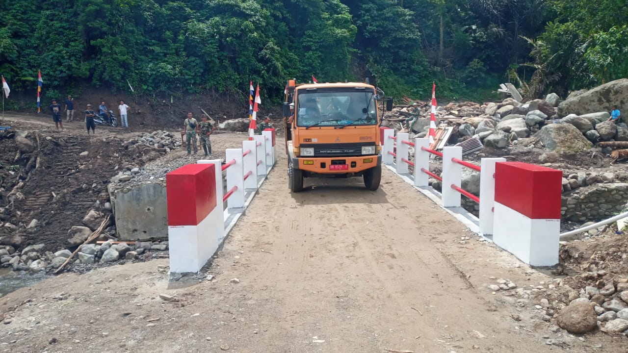 Padangsidimpuan – Satgas Yonzipur I/DD bersama Zidam I/Bukit Barisan dan personel Kodim 0212/Tapanuli Selatan merampungkan pembangunan Jembatan Aramco Aek Sibontor Lubuk Raya di Lingkungan IV, Kelurahan Lubuk Raya, Kecamatan Padangsidimpuan Hutaimbaru, Kota Padangsidimpuan, Senin (12/1/2026). Rampungnya pembangunan jembatan tersebut ditandai dengan pelaksanaan acara selamatan yang digelar oleh masyarakat setempat sebagai ungkapan rasa syukur.