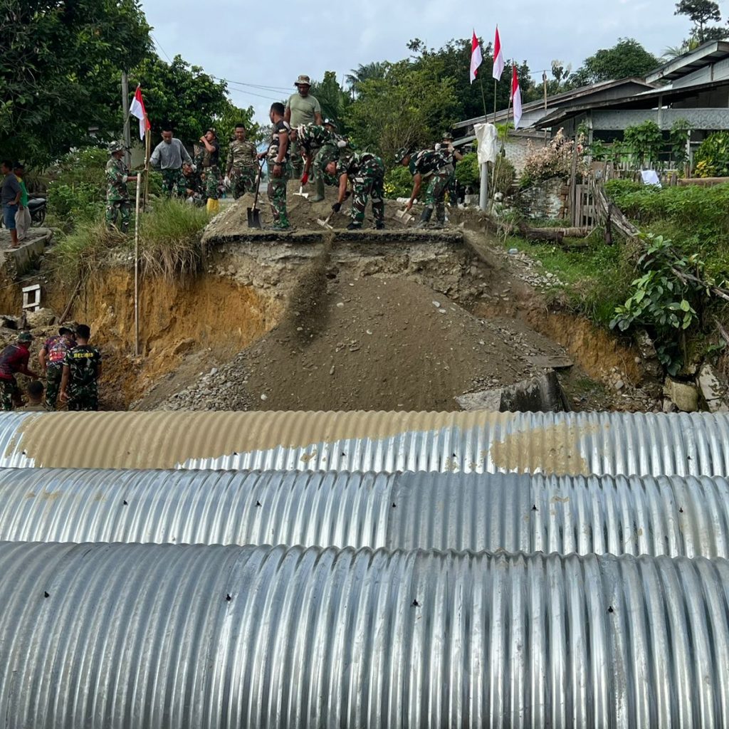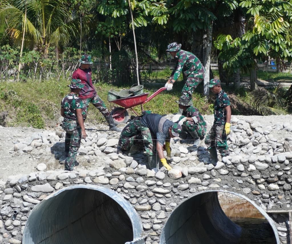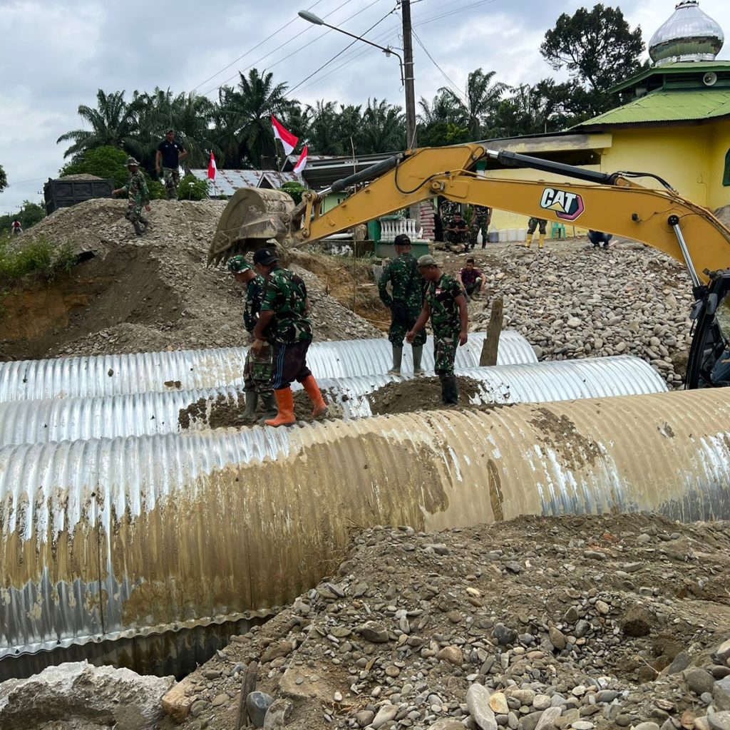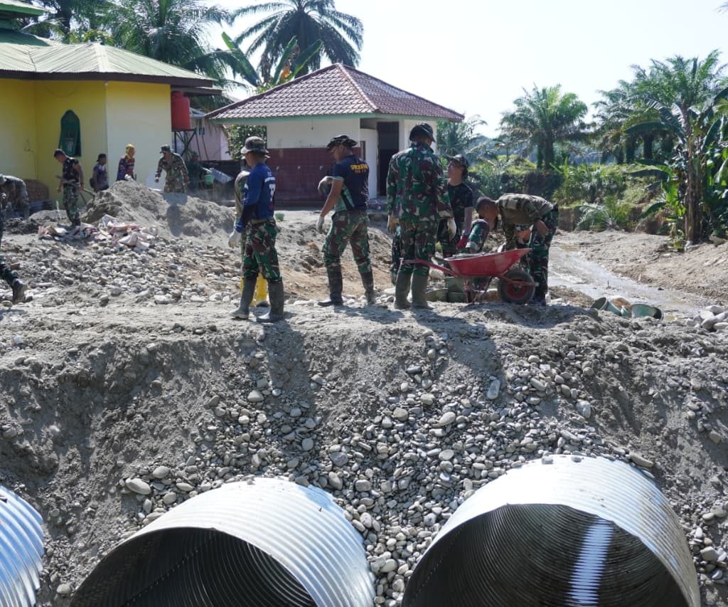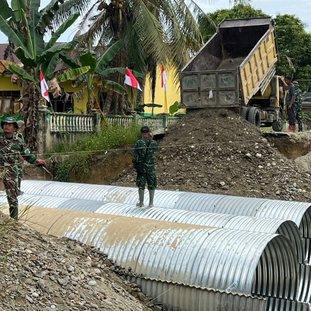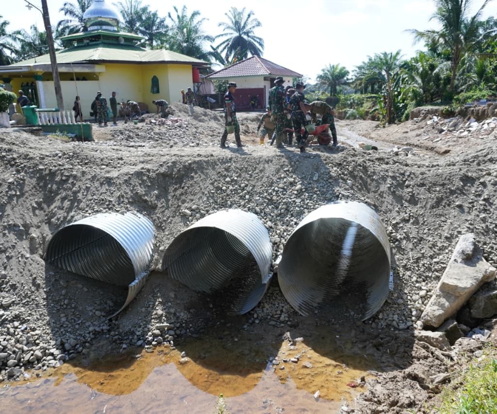 Langkat — Satgas Penanggulangan Bencana Alam (Gulbencal) Kodam I/Bukit Barisan melalui Kodim 0203/Langkat terus mempercepat pembangunan jembatan tipe Aramco di Desa Sei Litur Tasik, Kecamatan Sawit Seberang, Kabupaten Langkat, Selasa (23/12/2025). Pembangunan jembatan ini dilakukan untuk memulihkan dan memperlancar akses transportasi masyarakat yang terdampak kondisi infrastruktur sebelumnya.