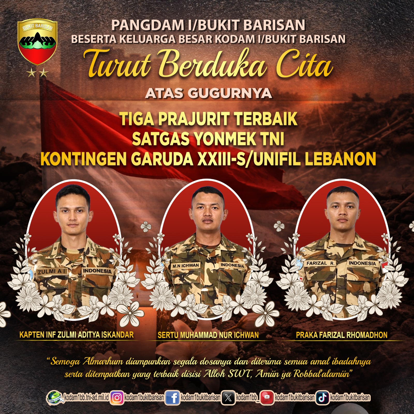 Turut Berduka Cita ATAS GUGURNYA TIGA PRAJURIT TERBAIK SATGAS YONMEK TNI KONTINGEN GARUDA XXIII-S/UNIFIL LEBANON KAPTEN INF ZULMI ADITYA ISKANDAR SERTU MUHAMMAD NUR ICHWAN PRAKA FARIZAL RHOMADHONadmin02/04/2026Berita Utama16 Dilihat Post Views: 16
