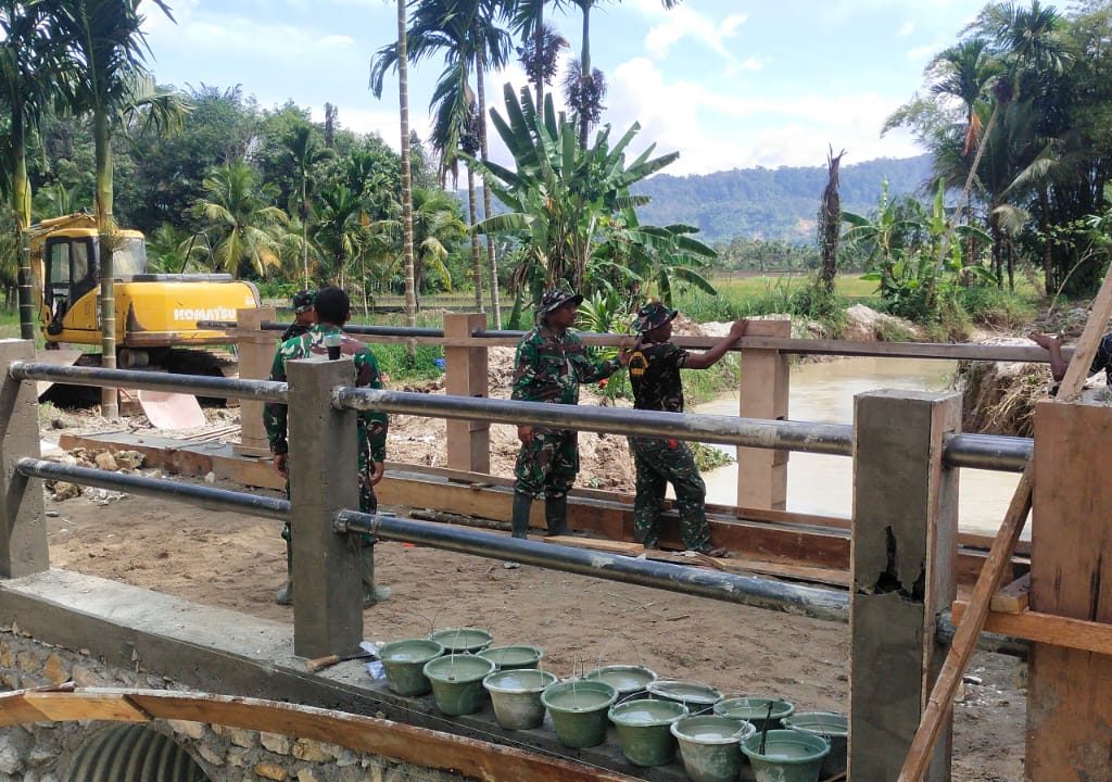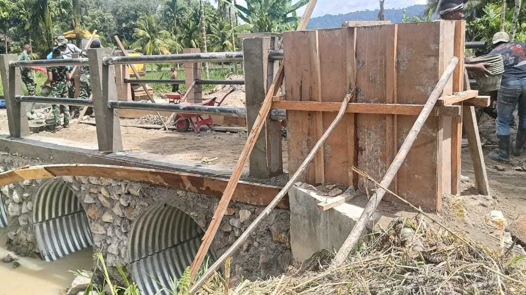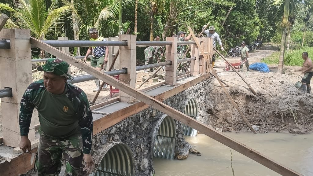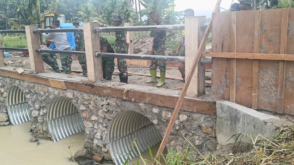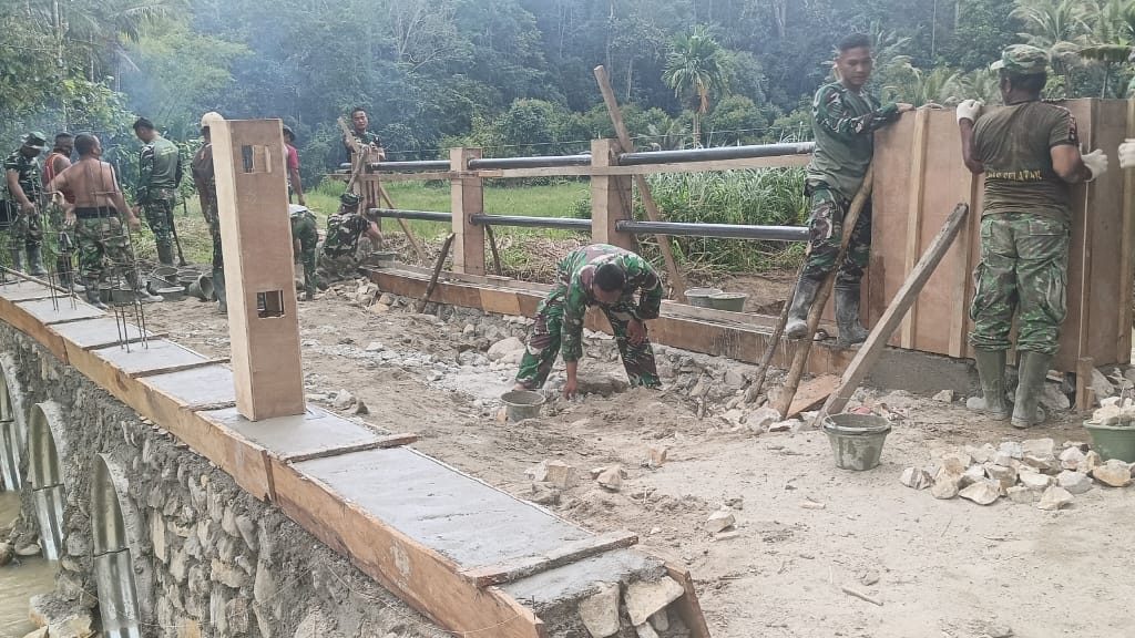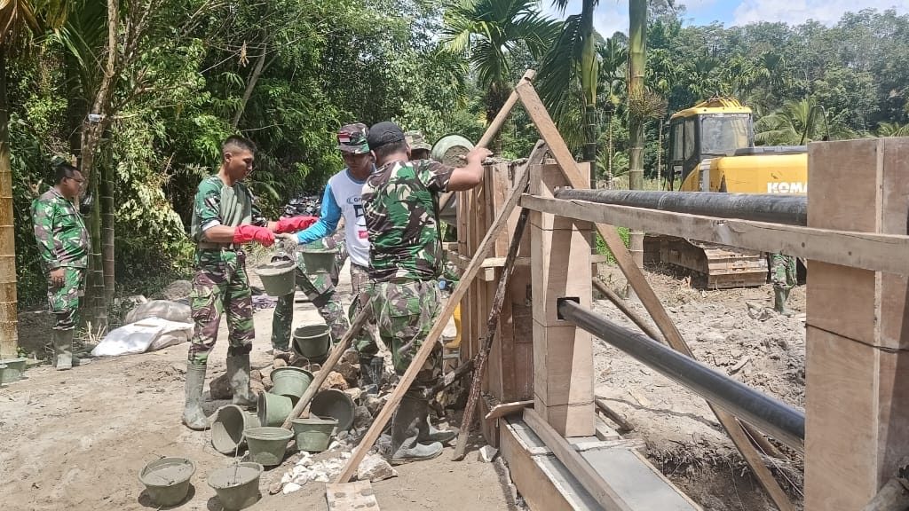 Tapanuli Utara – Satuan Batalyon Zipur I/DD terus mempercepat pembangunan jembatan Aramco di Desa Janji Nauli, Kecamatan Purba Tua, Kabupaten Tapanuli Utara. Selasa (13/1/2026). Pembangunan jembatan ini dilakukan untuk memulihkan dan meningkatkan akses jalan warga, khususnya menuju area perkebunan yang selama ini sulit dilalui.